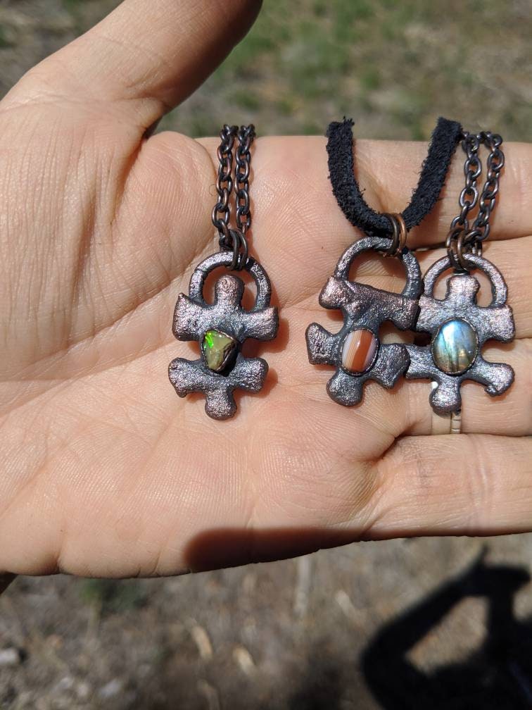 Each pendant is offered on a solid copper chain, real or faux leather chord.