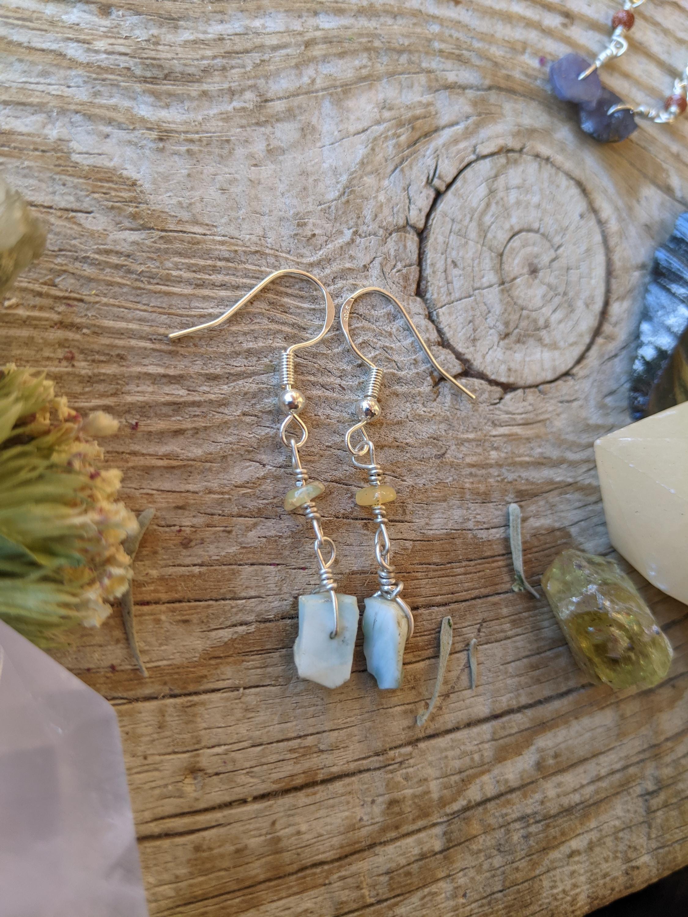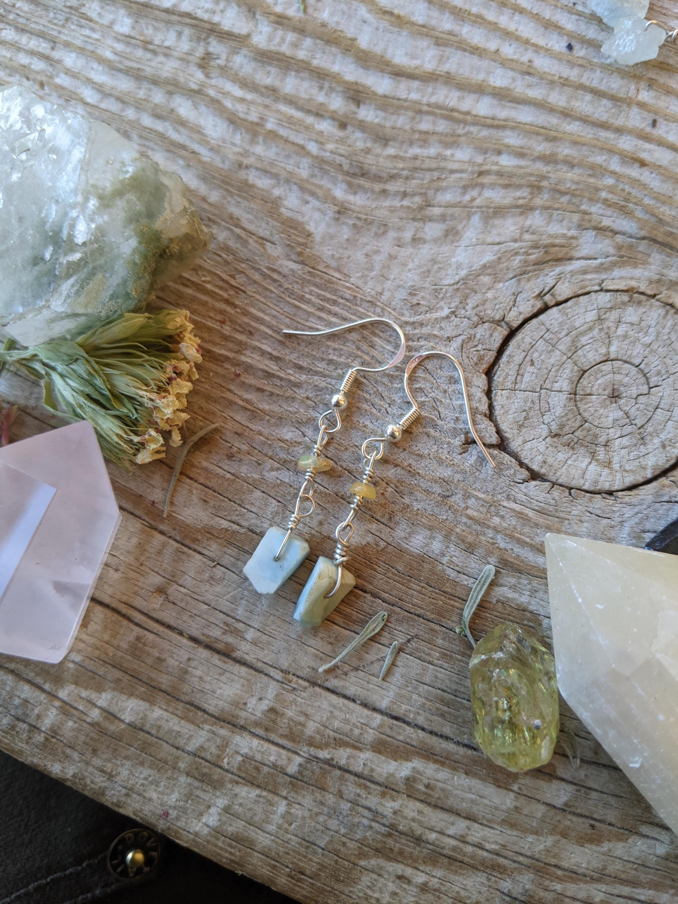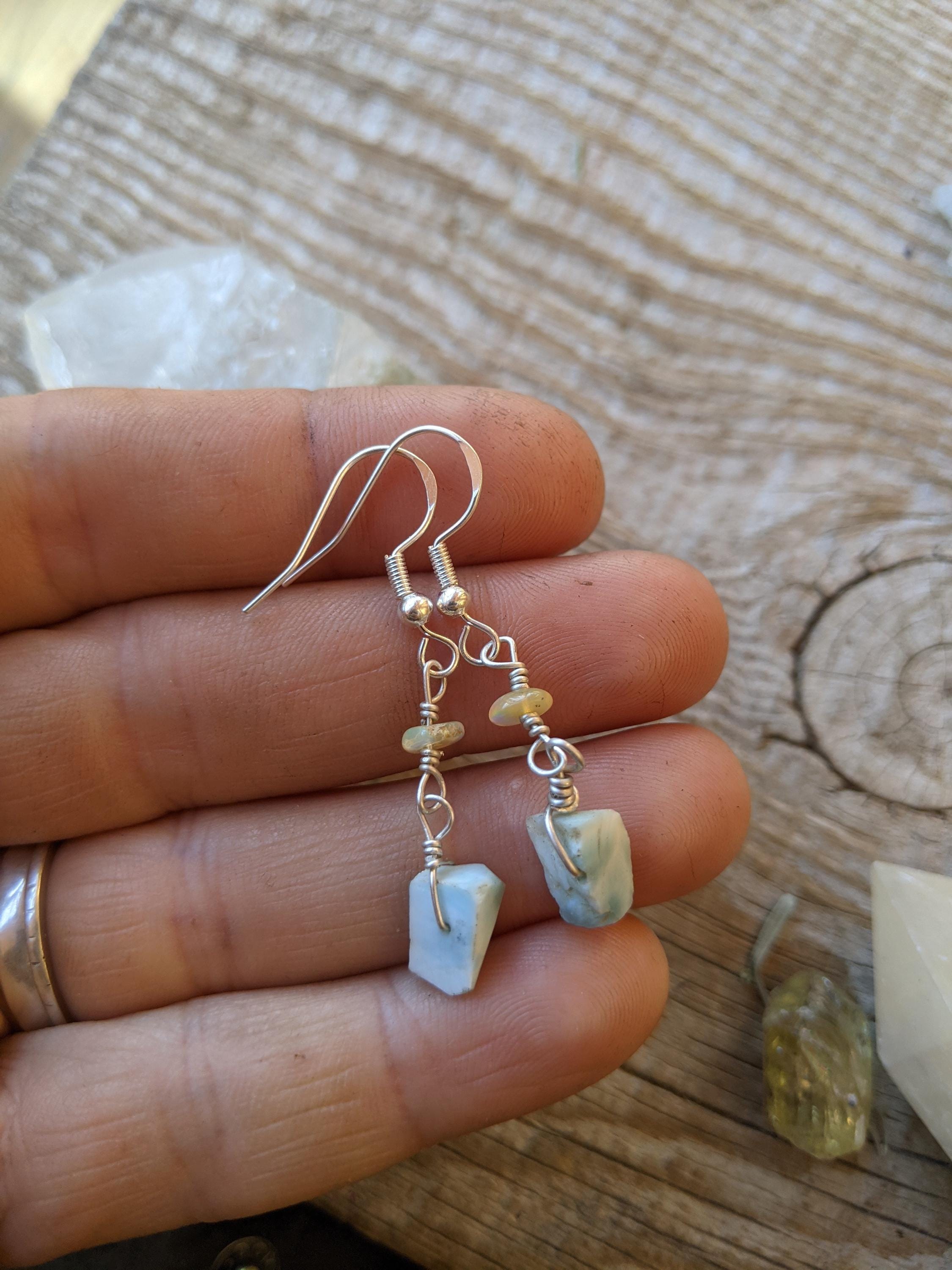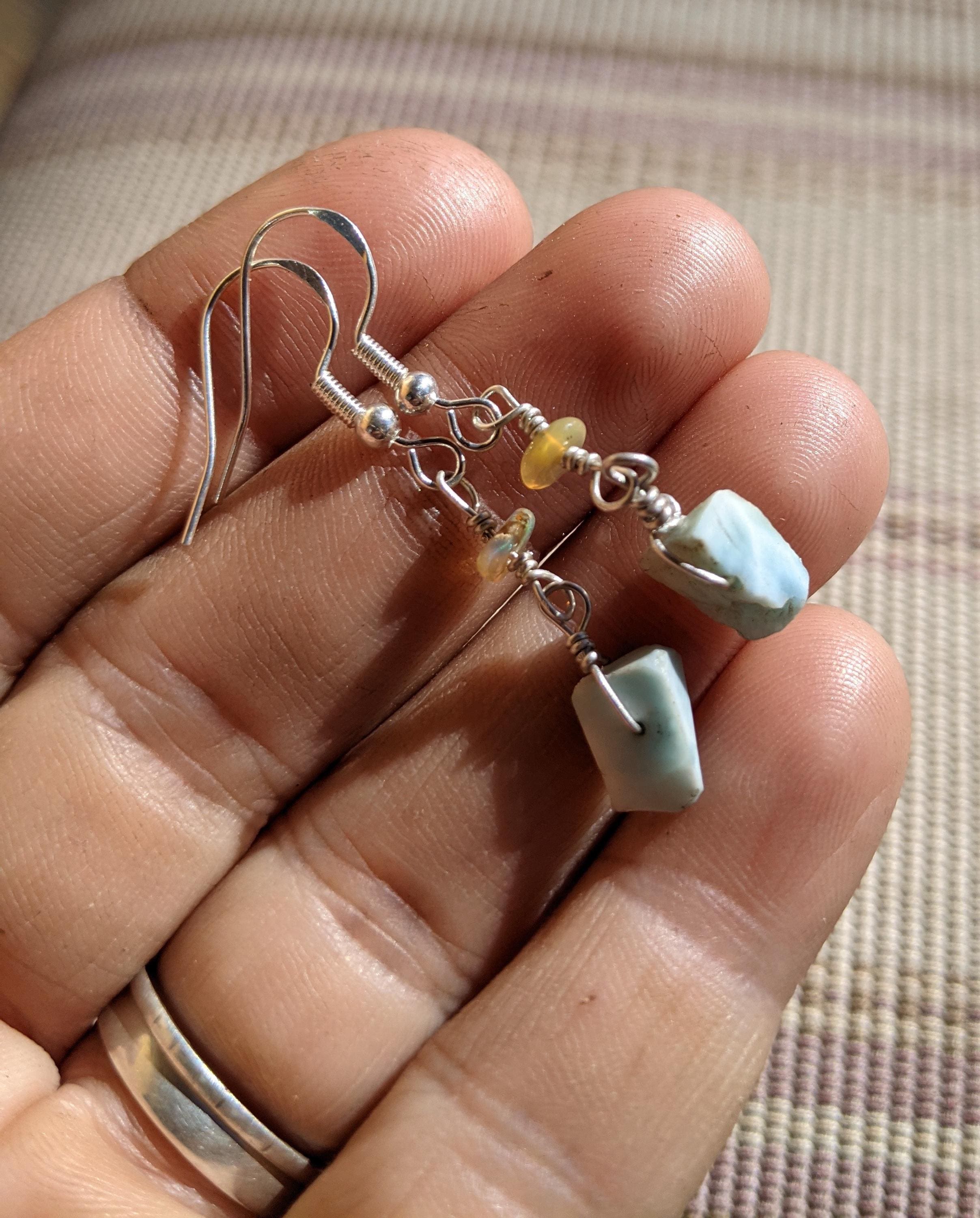 Sterling Silver Fire opal and larimar crystal earrings, larimar earrings, fire opal earrings natural raw larimar, natural opal, rainbow opal