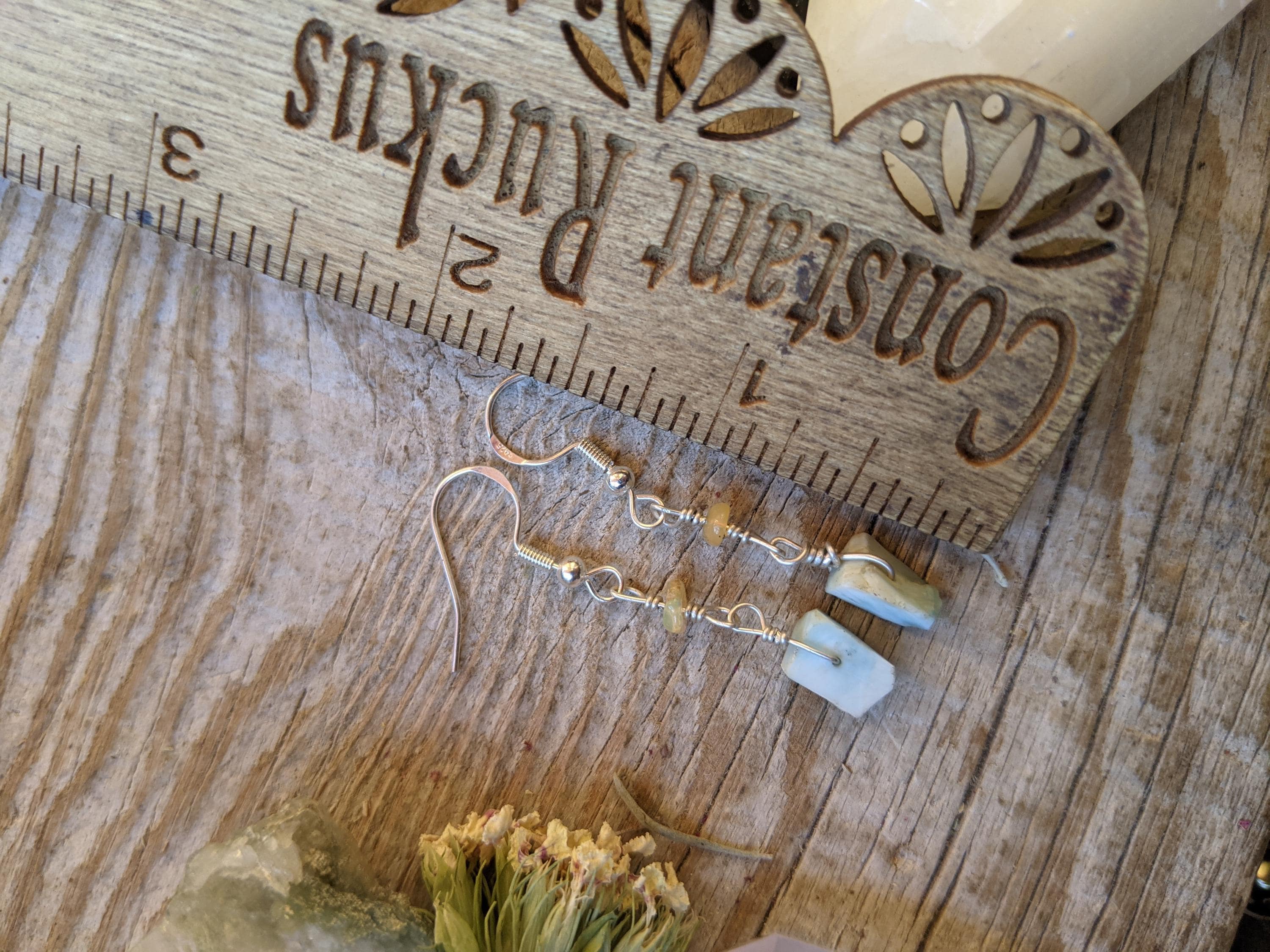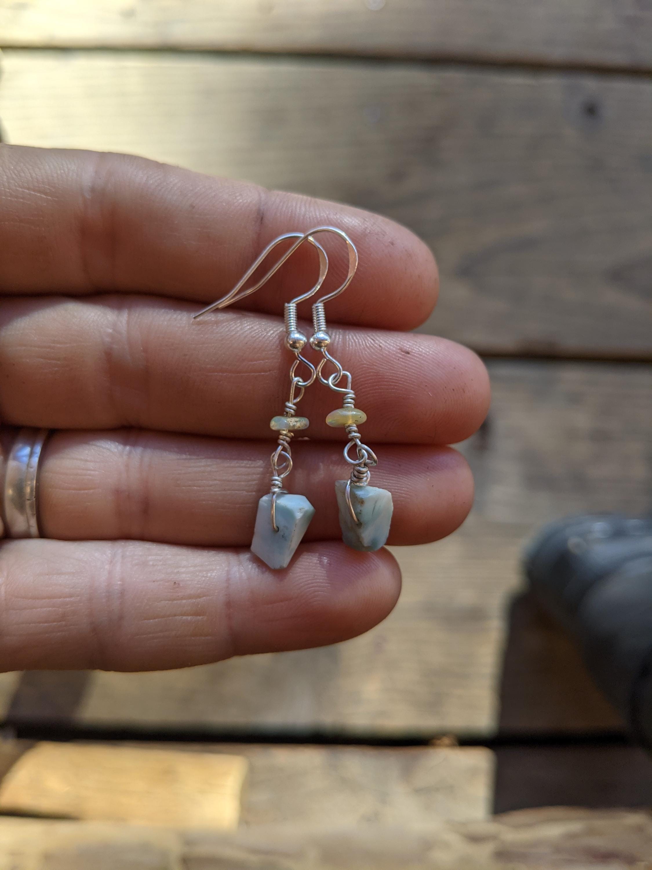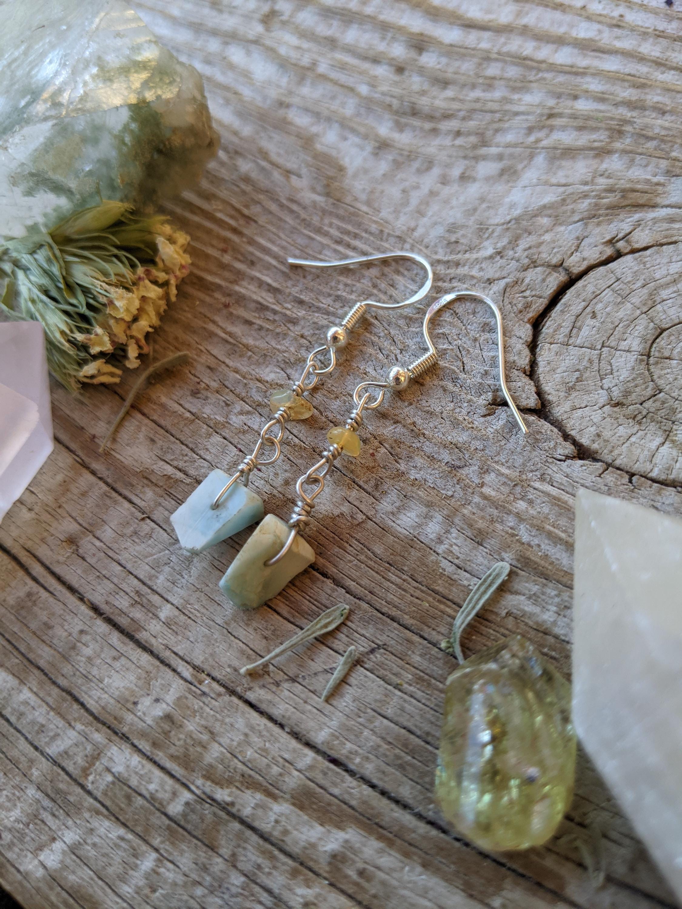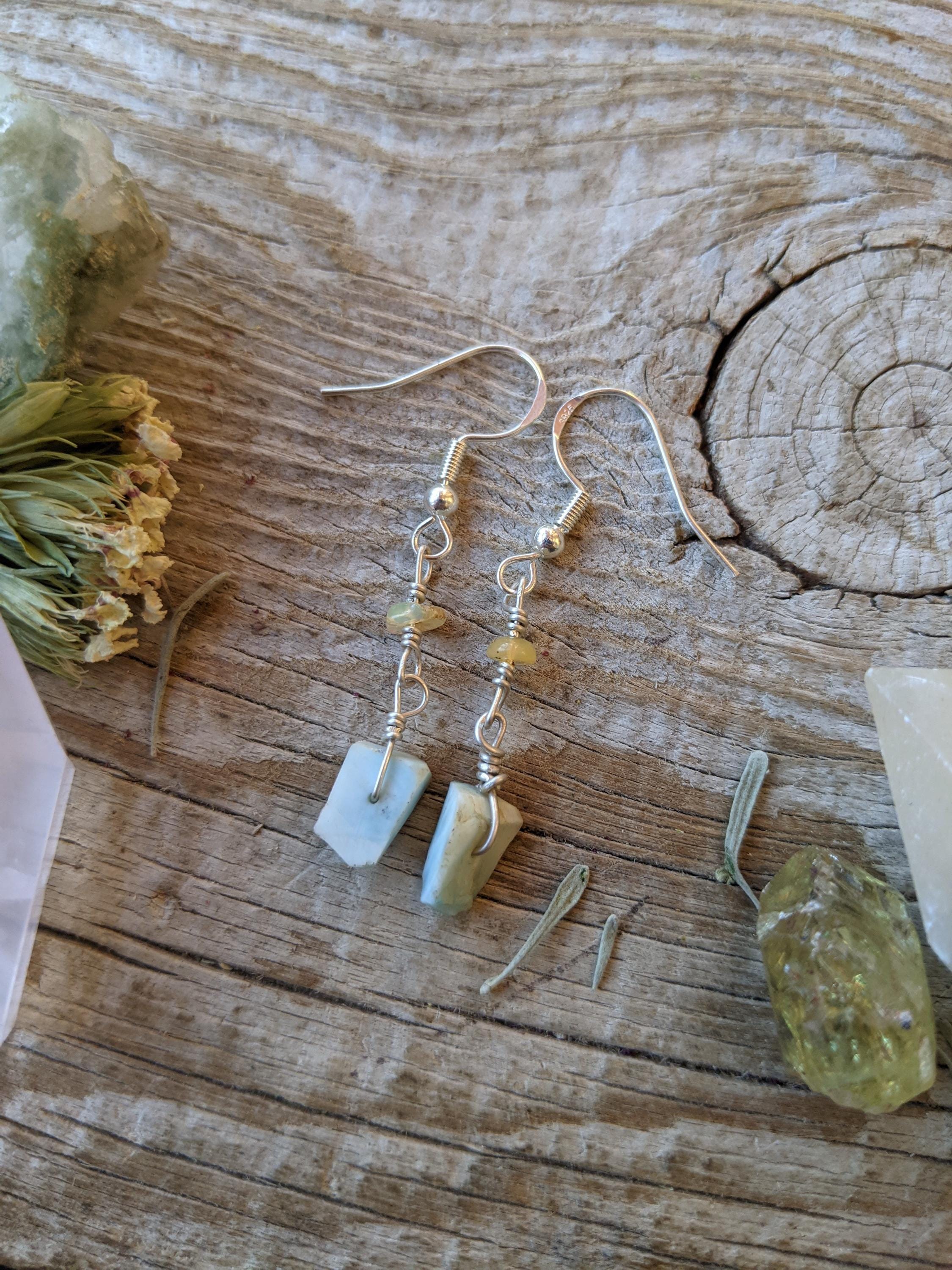 Sterling Silver Fire opal and larimar crystal earrings, larimar earrings, fire opal earrings natural raw larimar, natural opal, rainbow opal