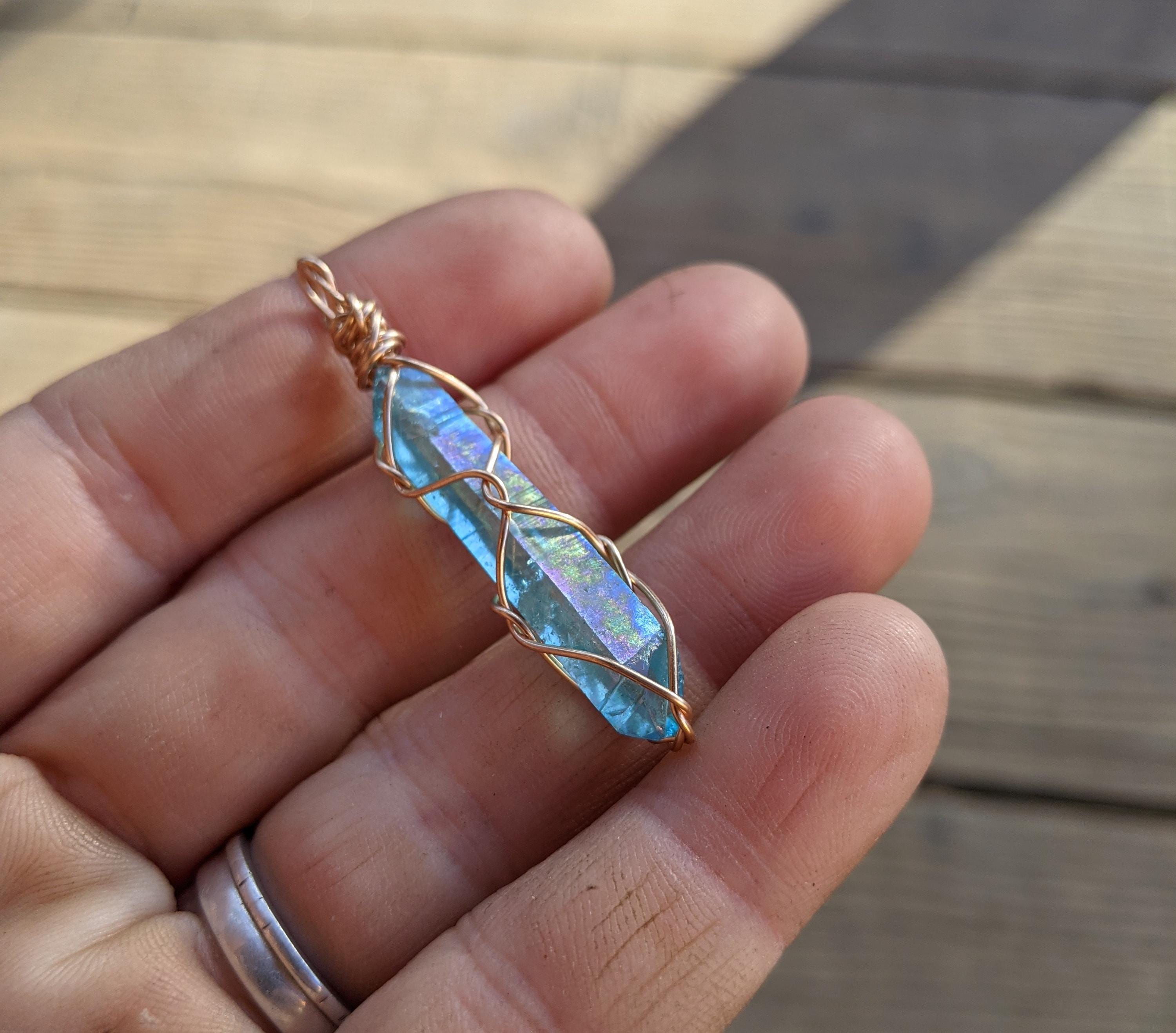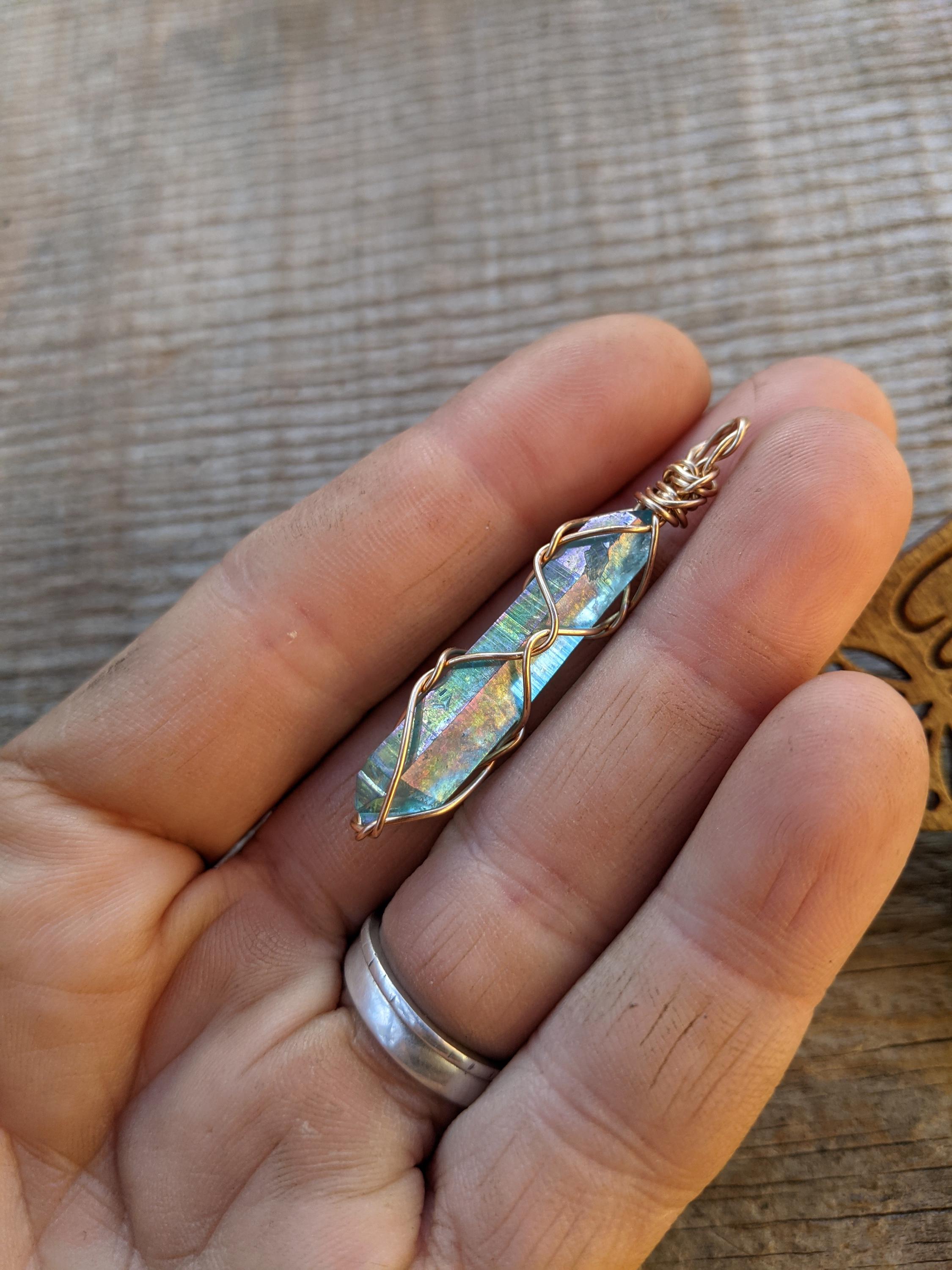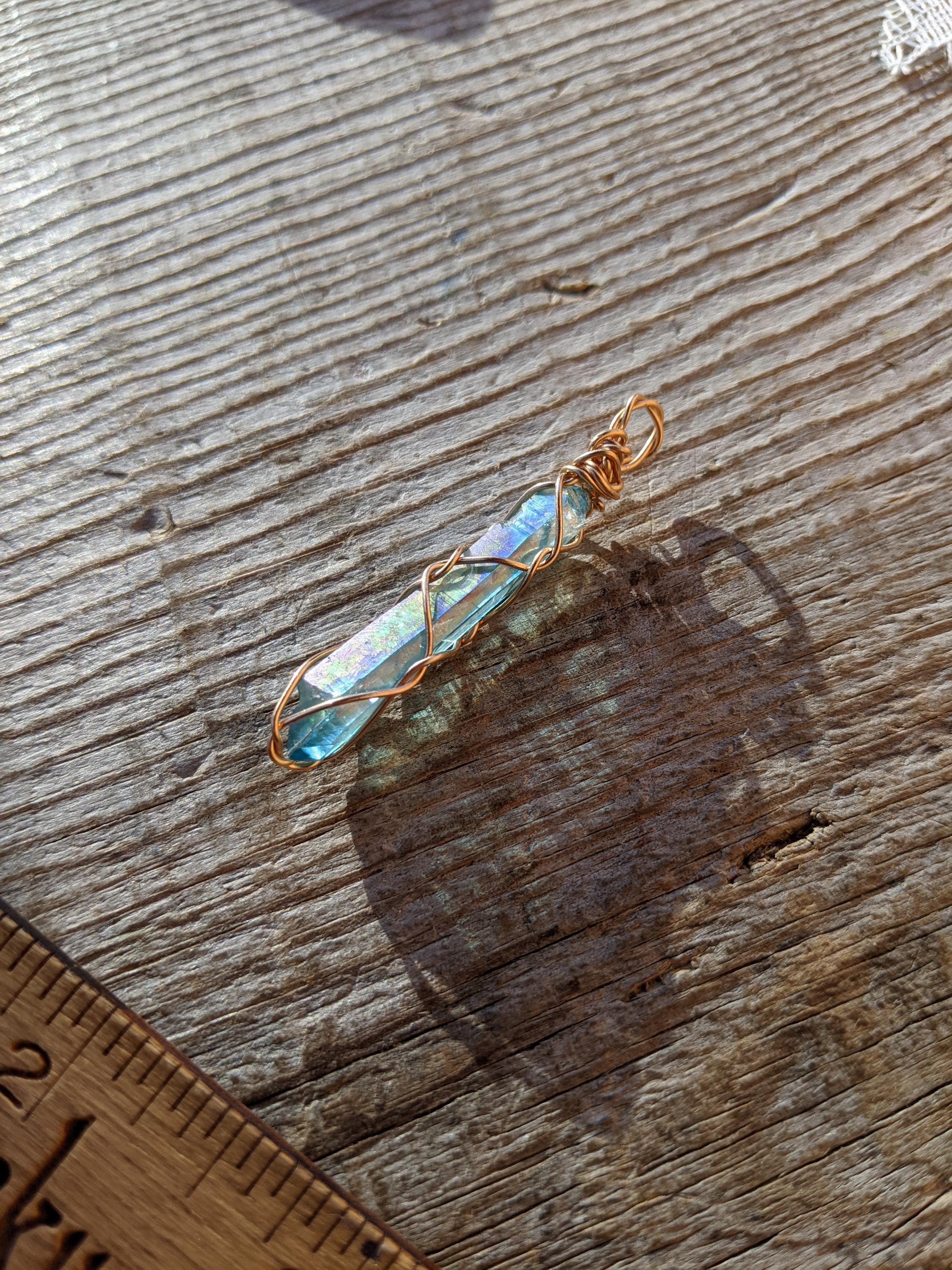Bronze gold double terminated aqua aura quartz crystal pendant, double terminated blue aura quartz rainbow crystal necklace, rainbow quartz