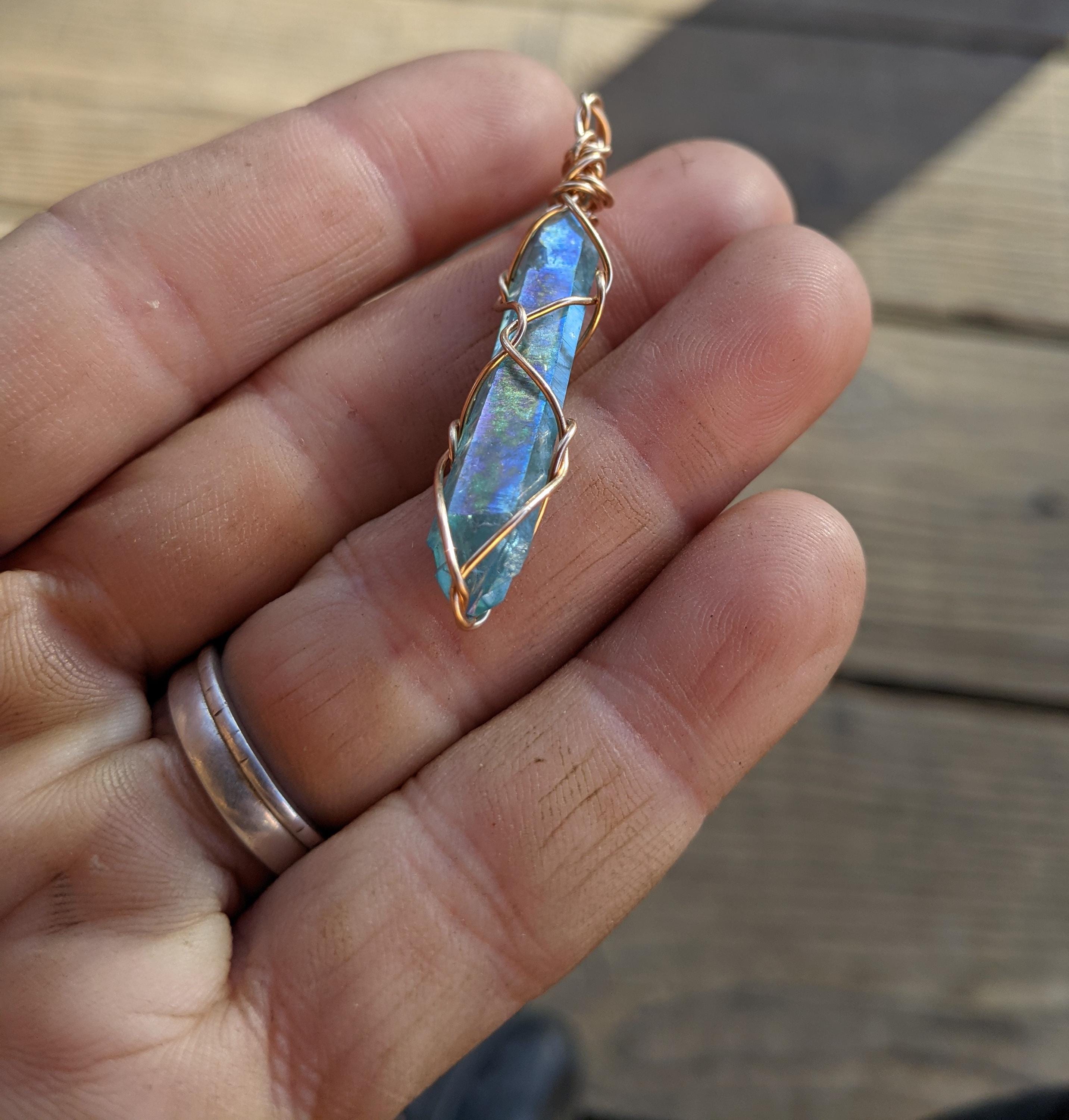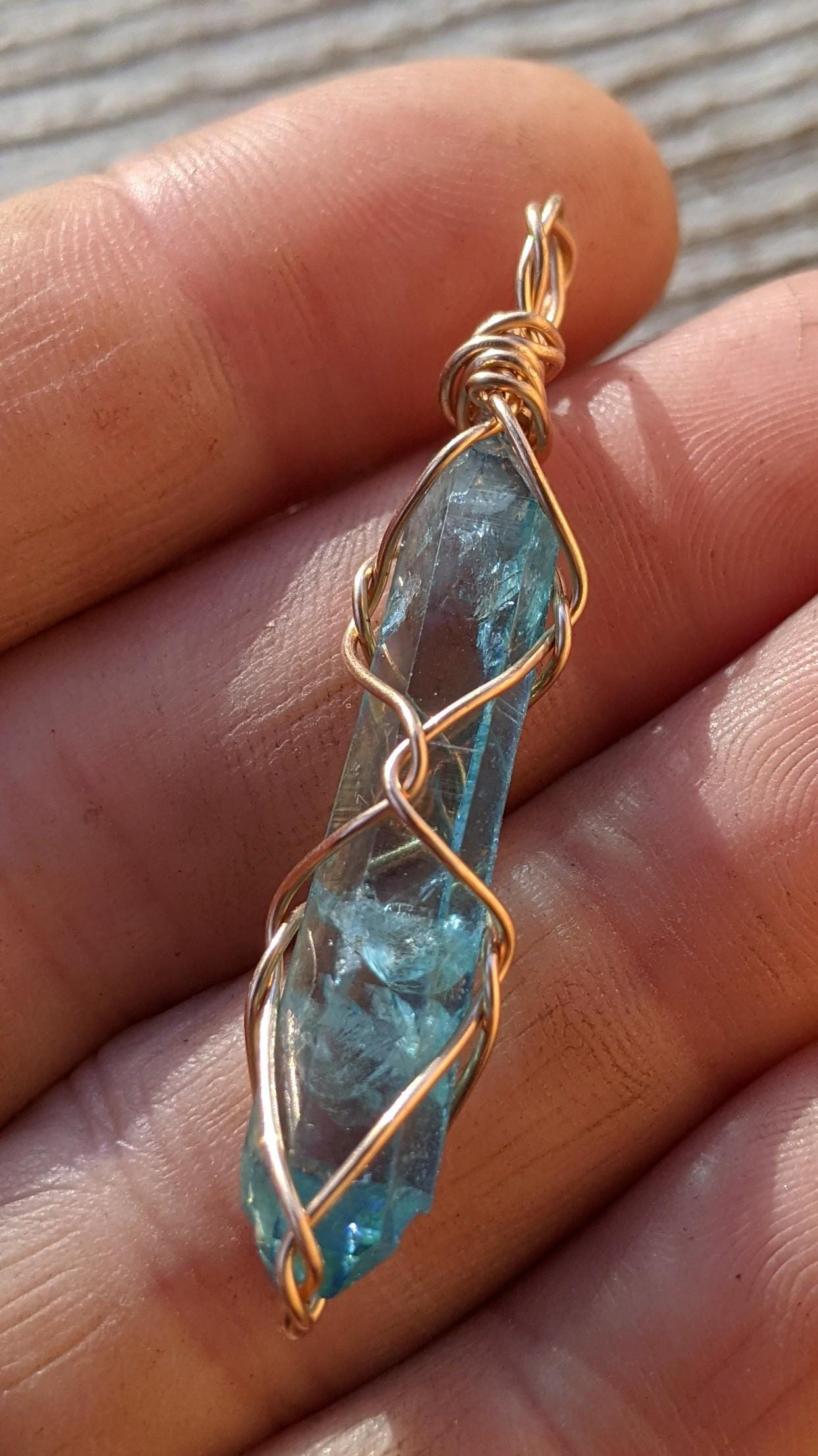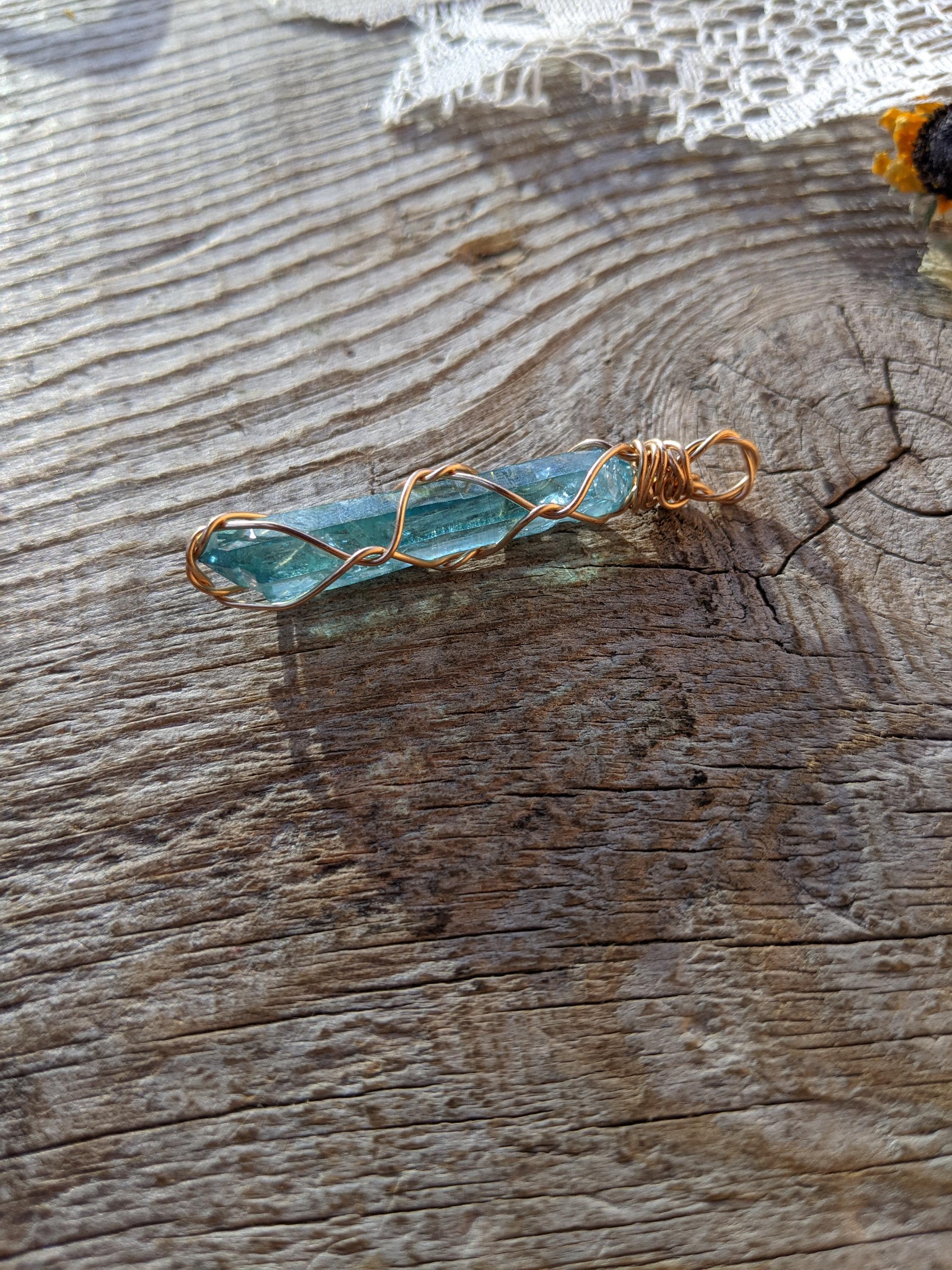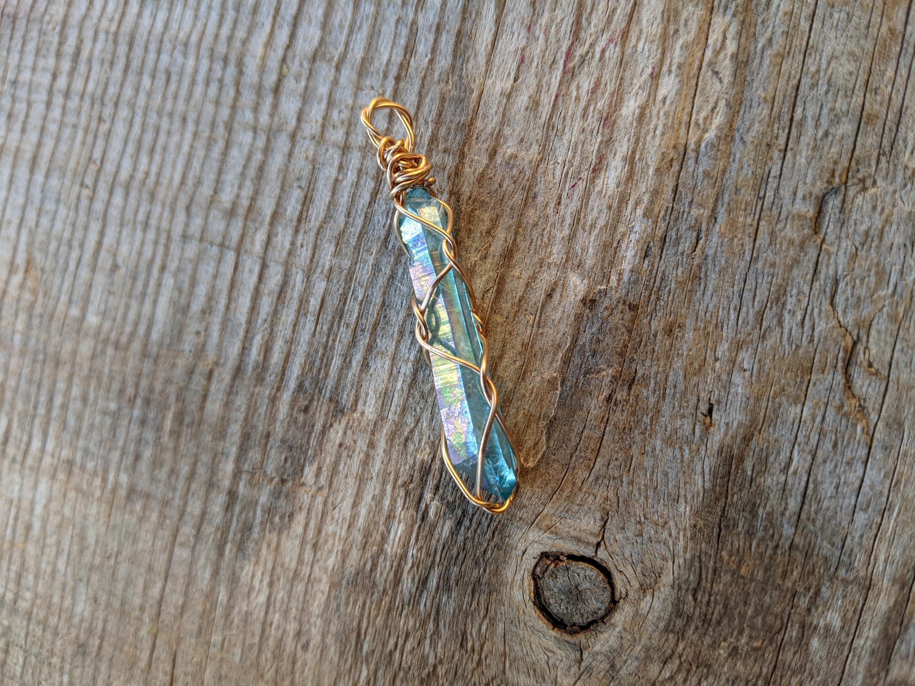 Bronze gold double terminated aqua aura quartz crystal pendant, double terminated blue aura quartz rainbow crystal necklace, rainbow quartz