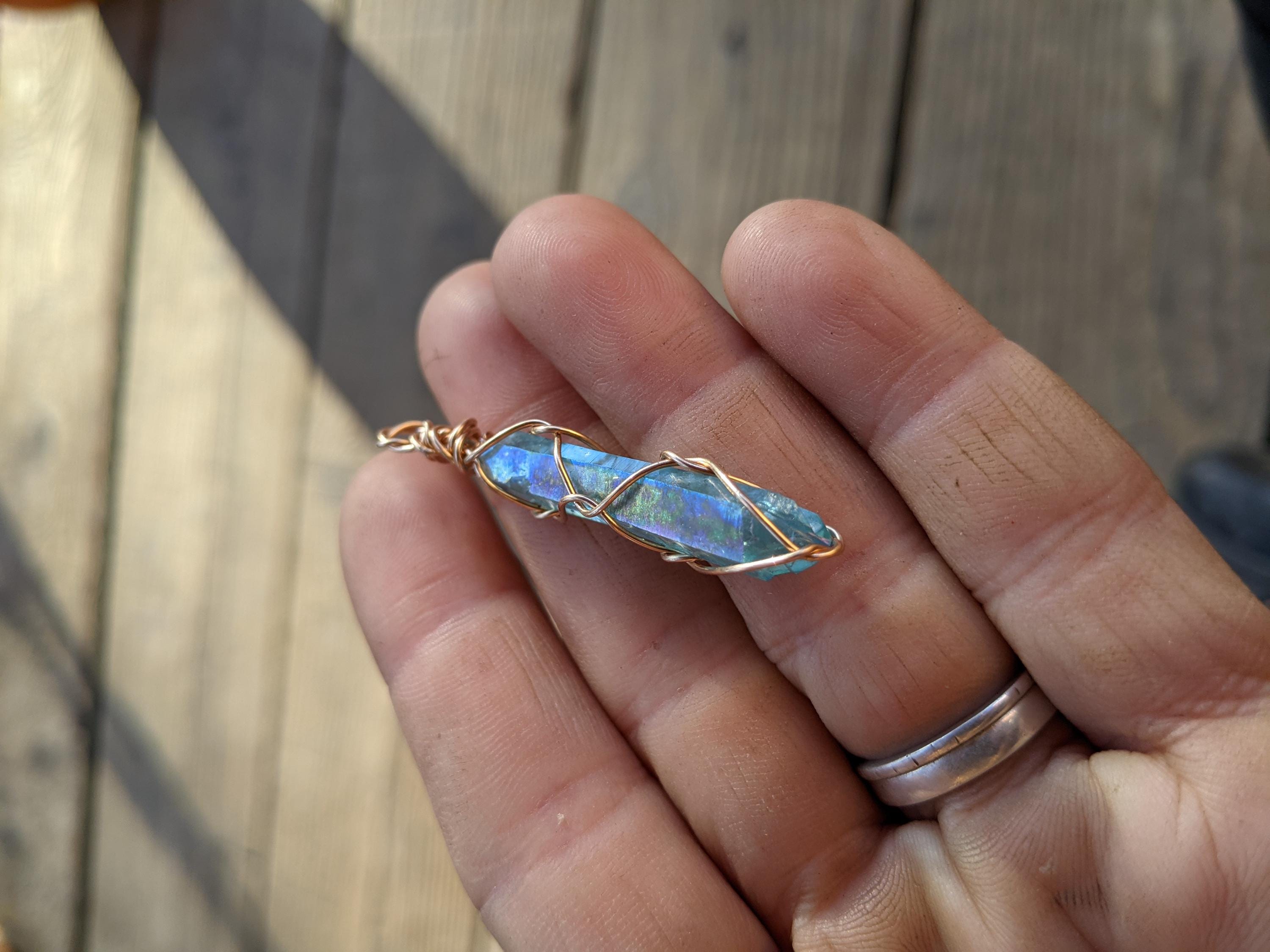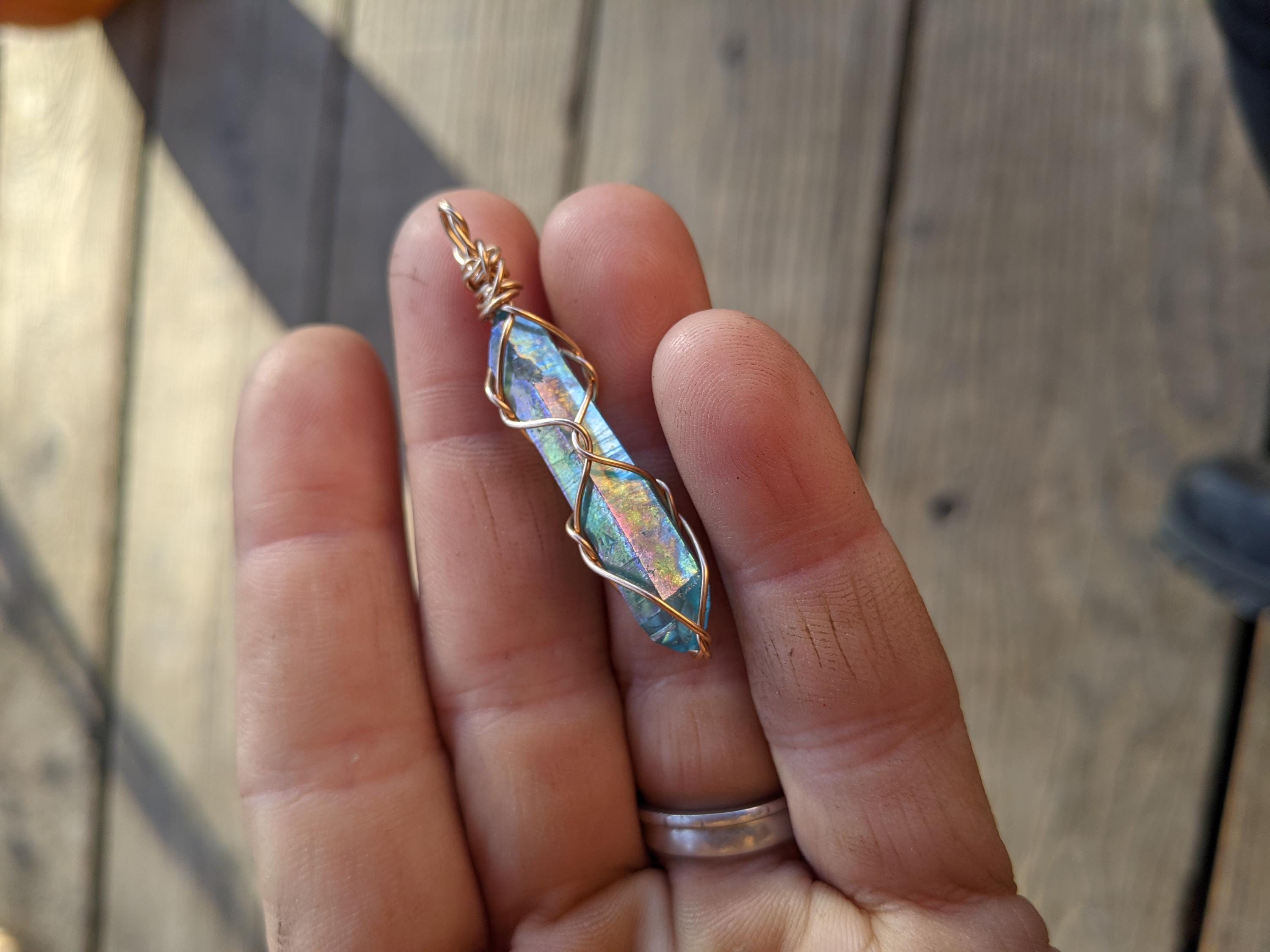 incredible double terminated quartz crystal from Columbia that has been bonded in a vacuum chamber with solid gold! the scientific process result is this stunning aqua aura rainbow crystal that will never fade in color, wash or rub off!!