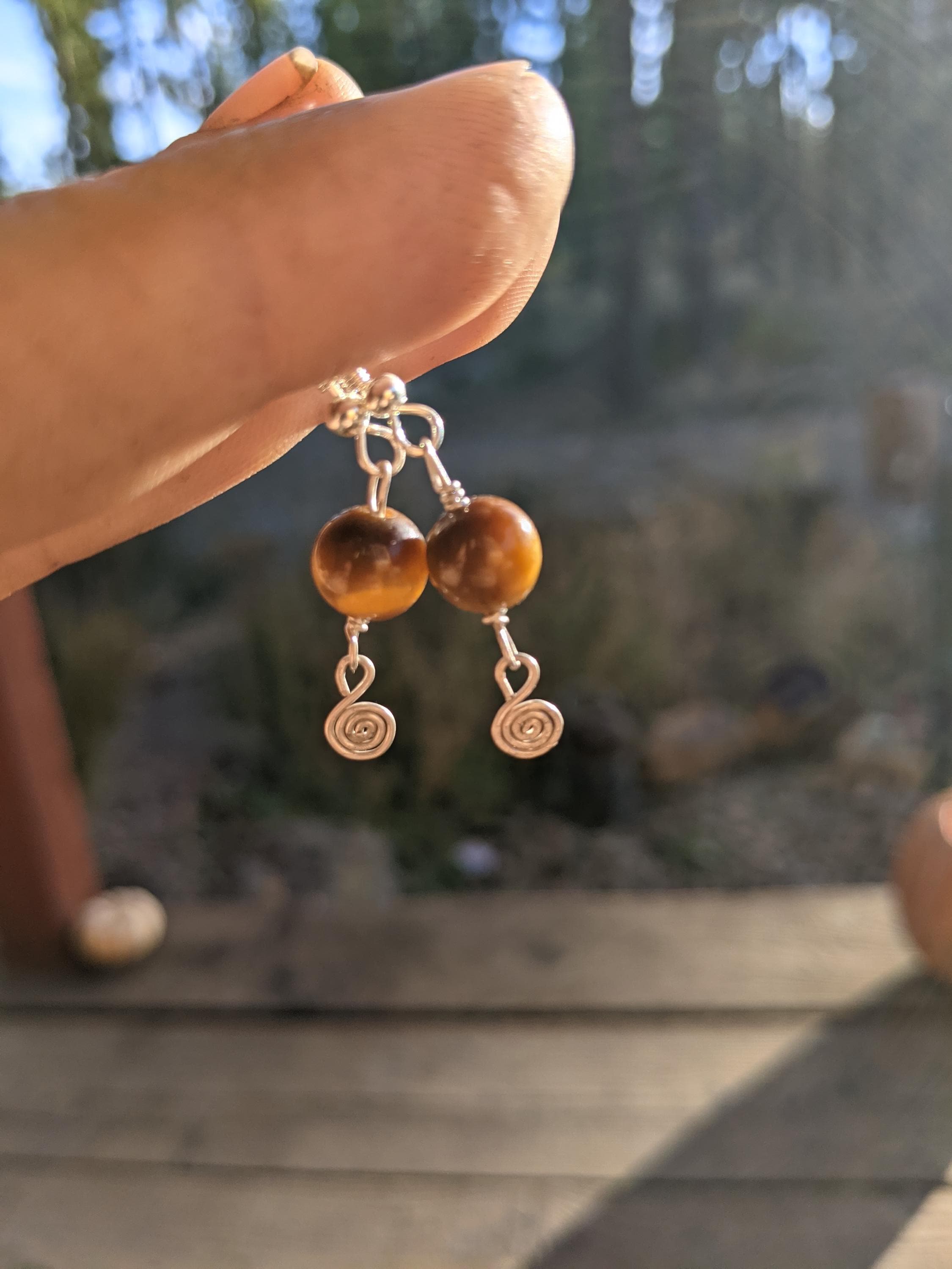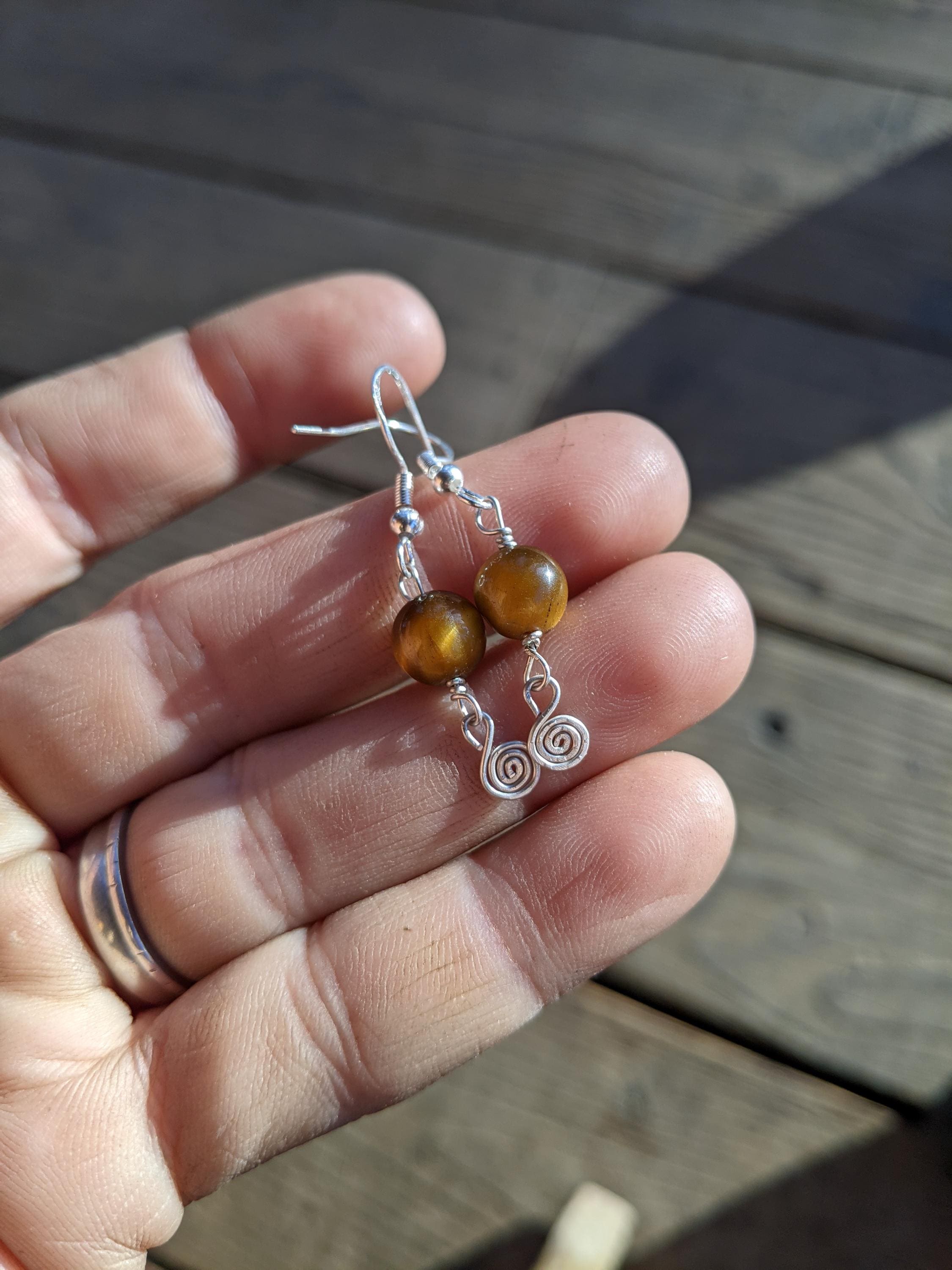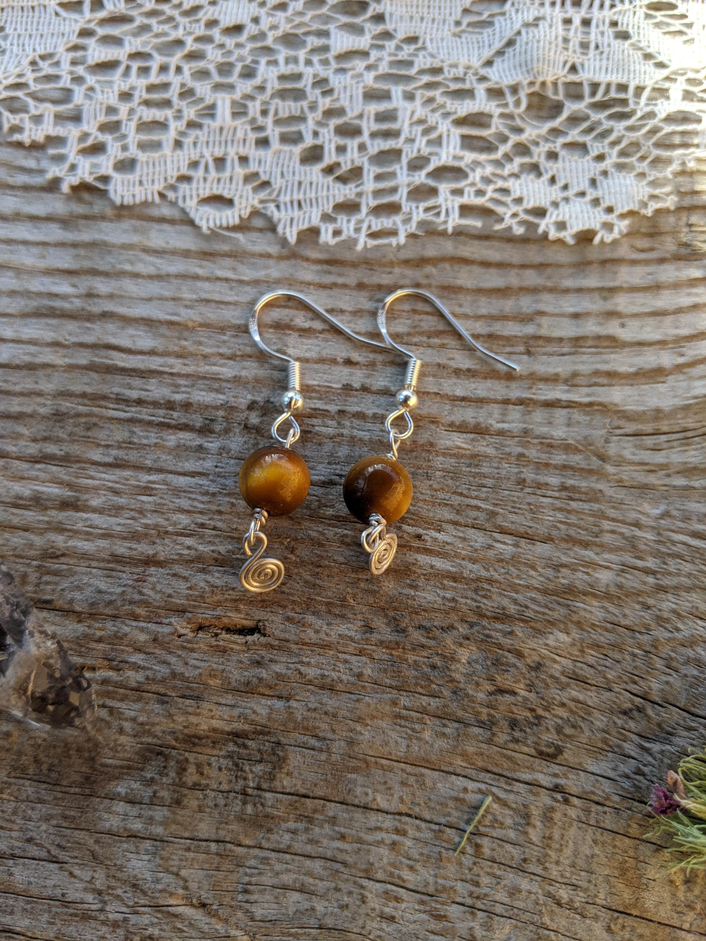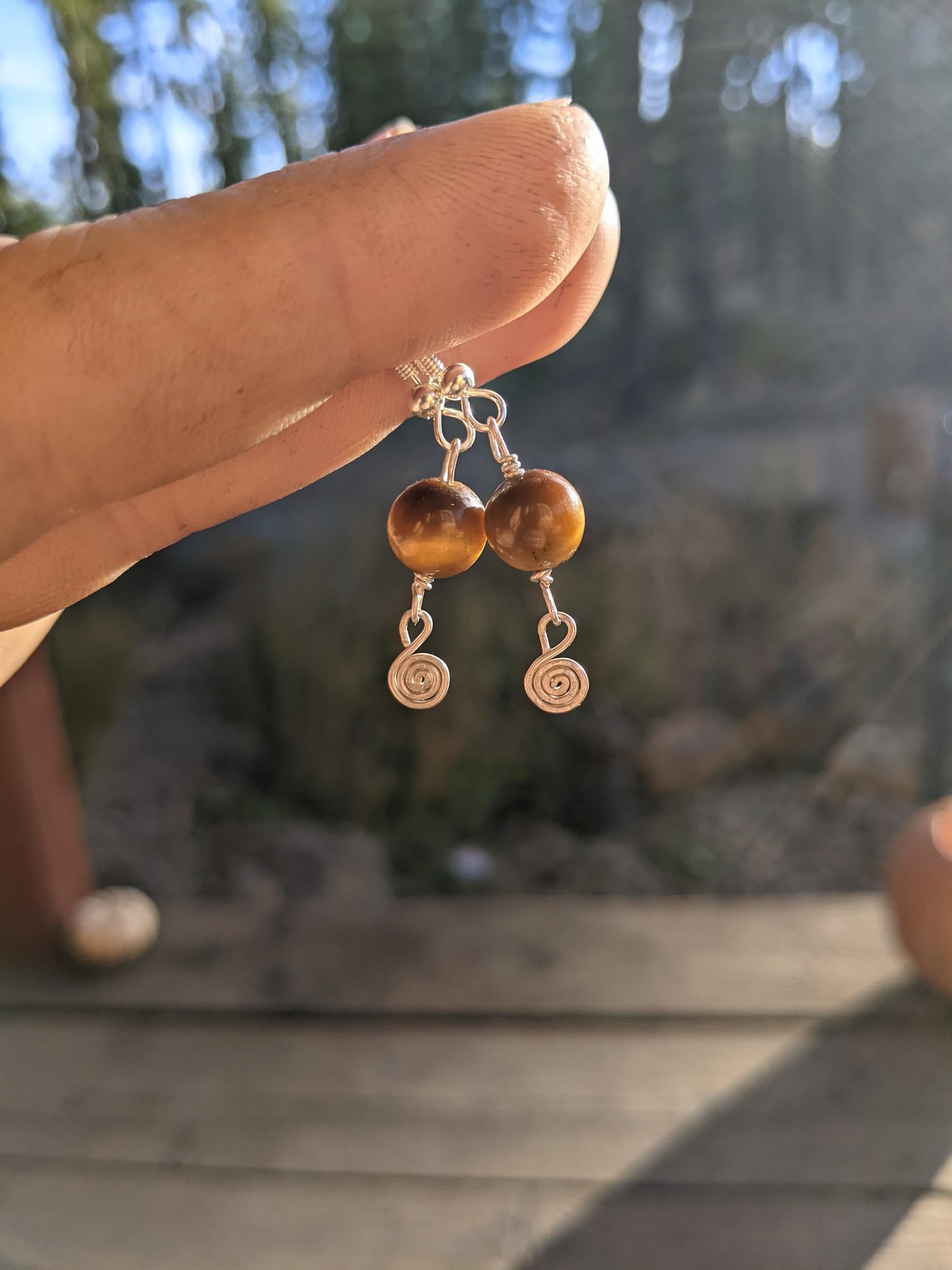 Honestly so sweet and adorable little shiny polished tigerseye crystals with sterling silver swirlys below them (i made by hand!)