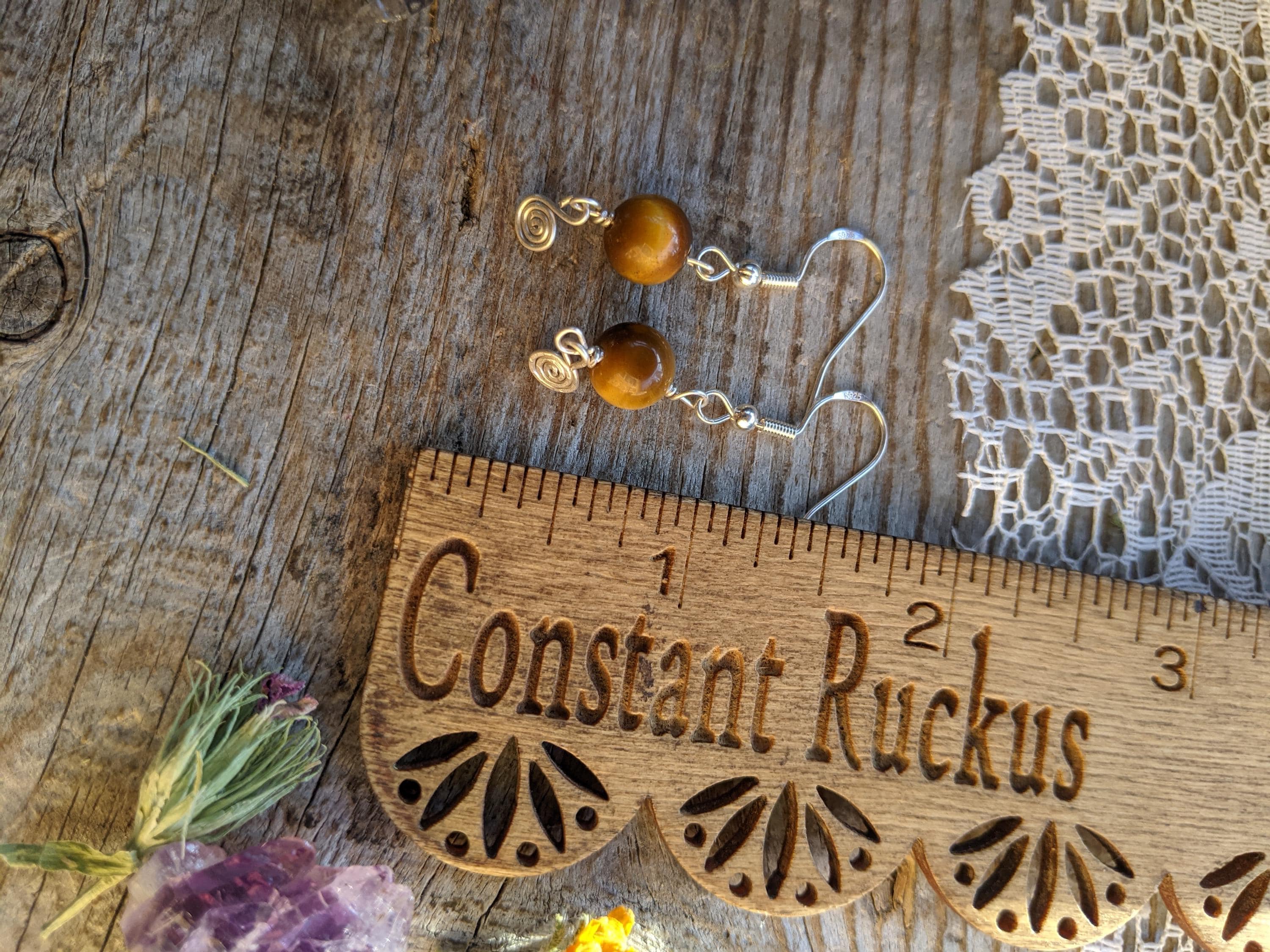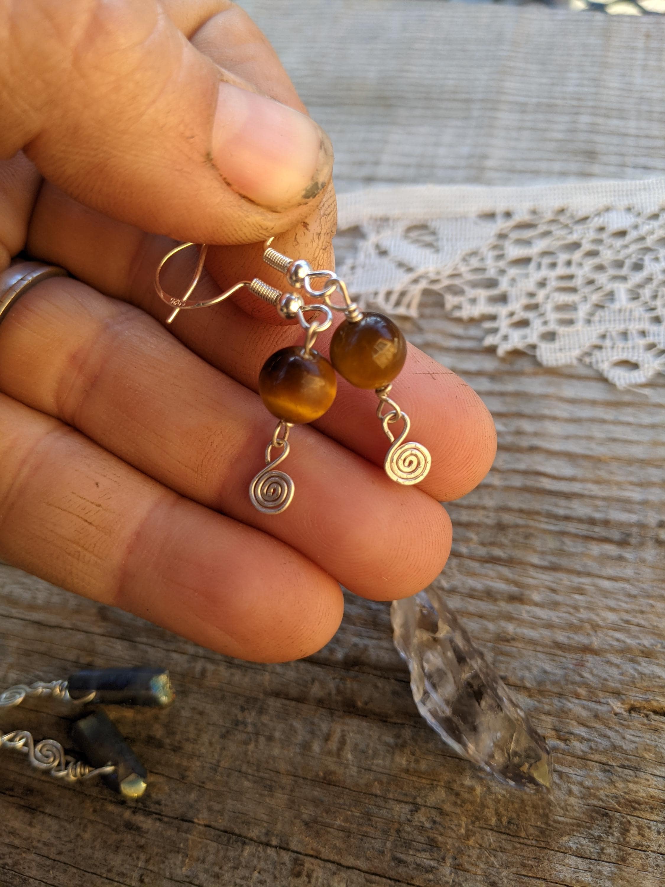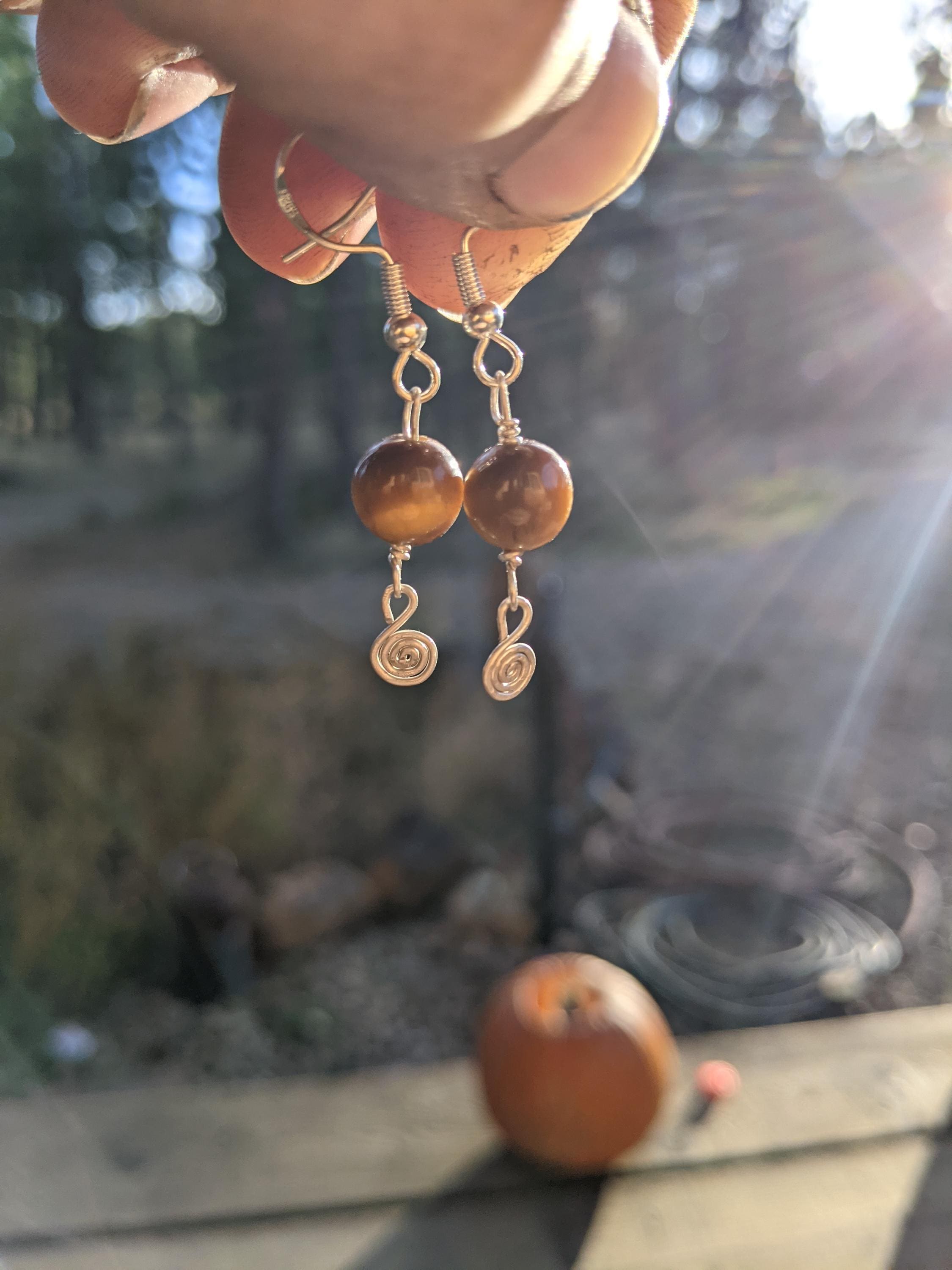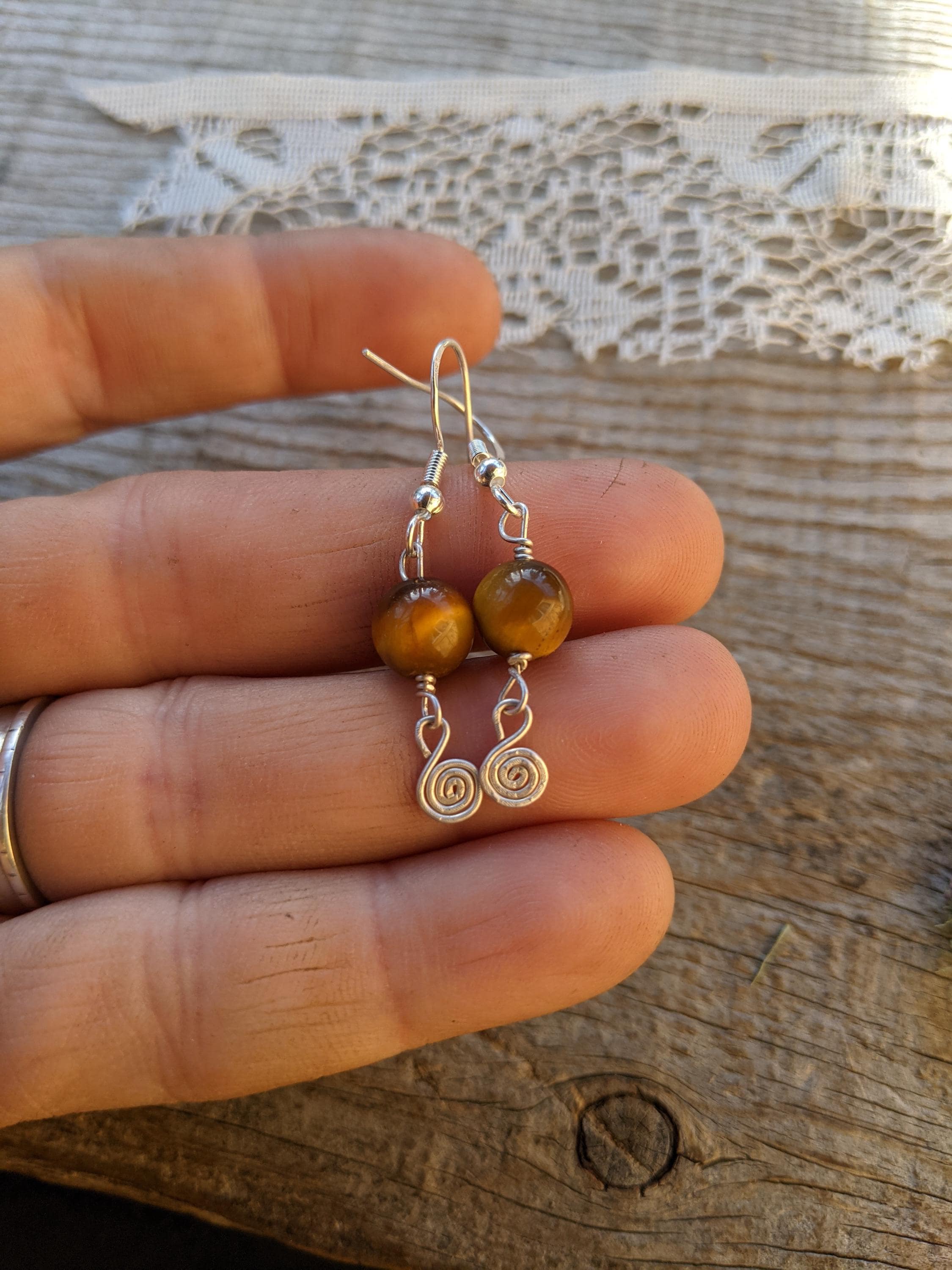 Honestly so sweet and adorable little shiny polished tigerseye crystals with sterling silver swirlys below them (i made by hand!)