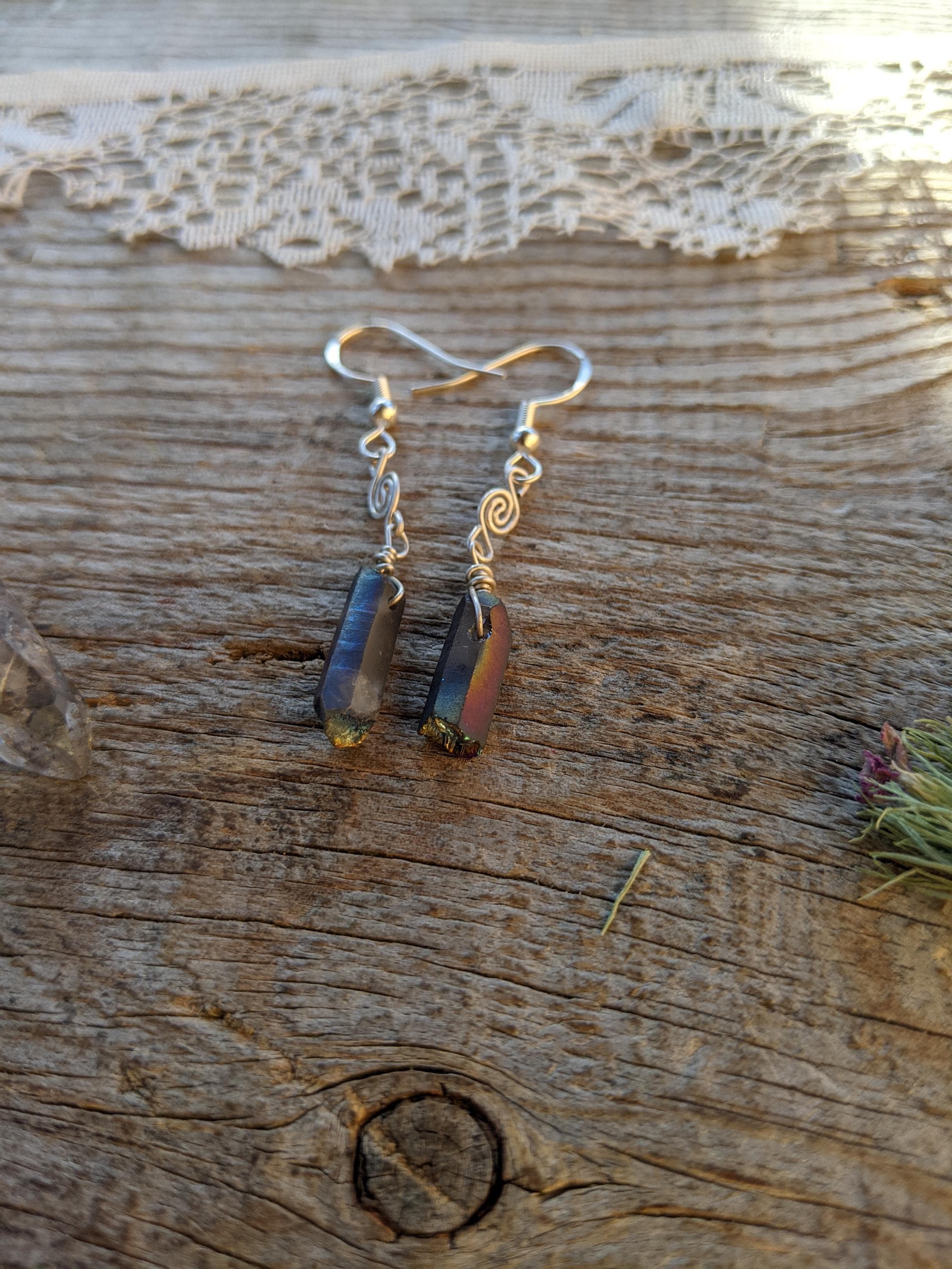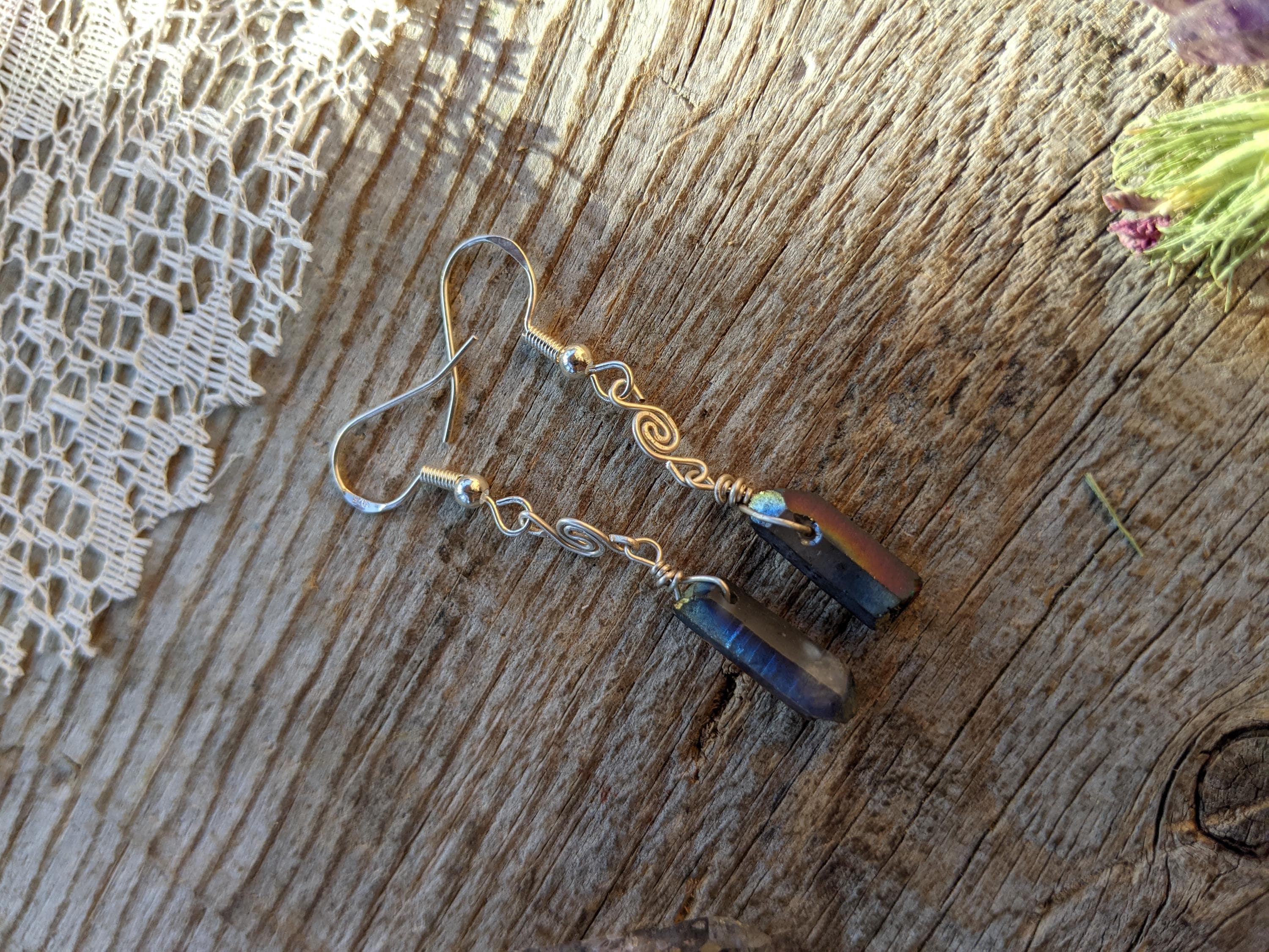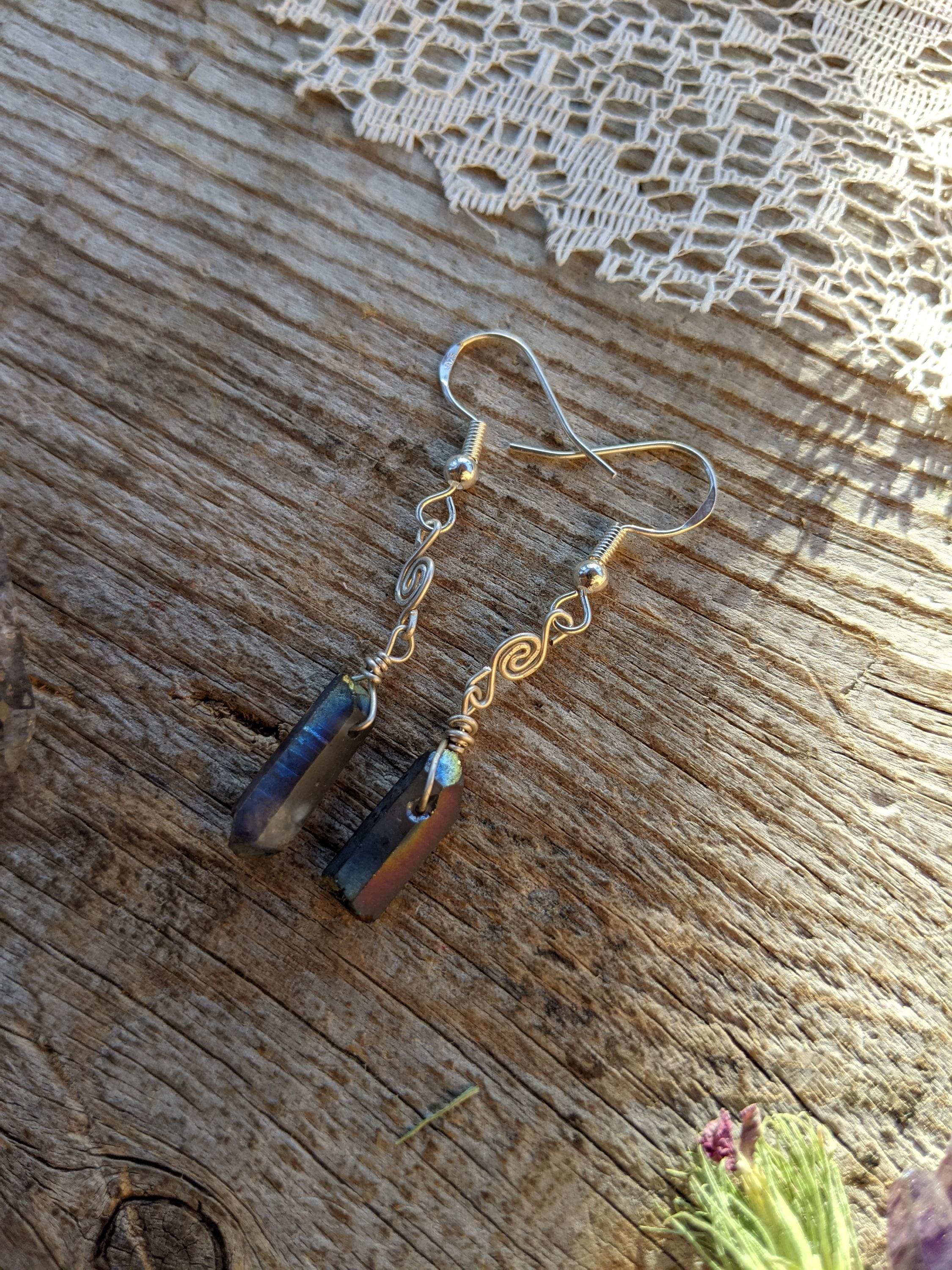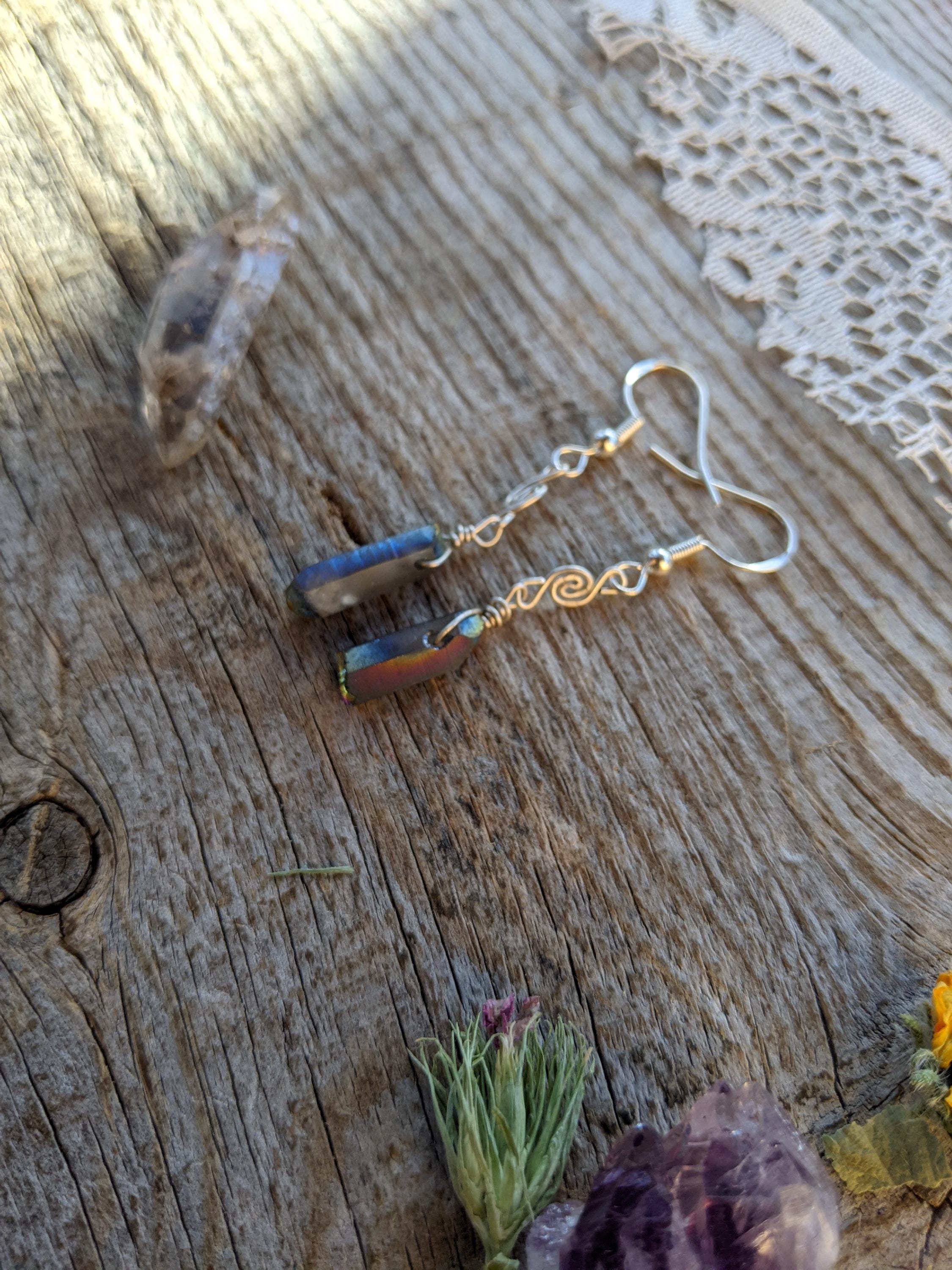 Rainbow aura quartz crystal earrings in sterling silver with little swirls handmade by me :)