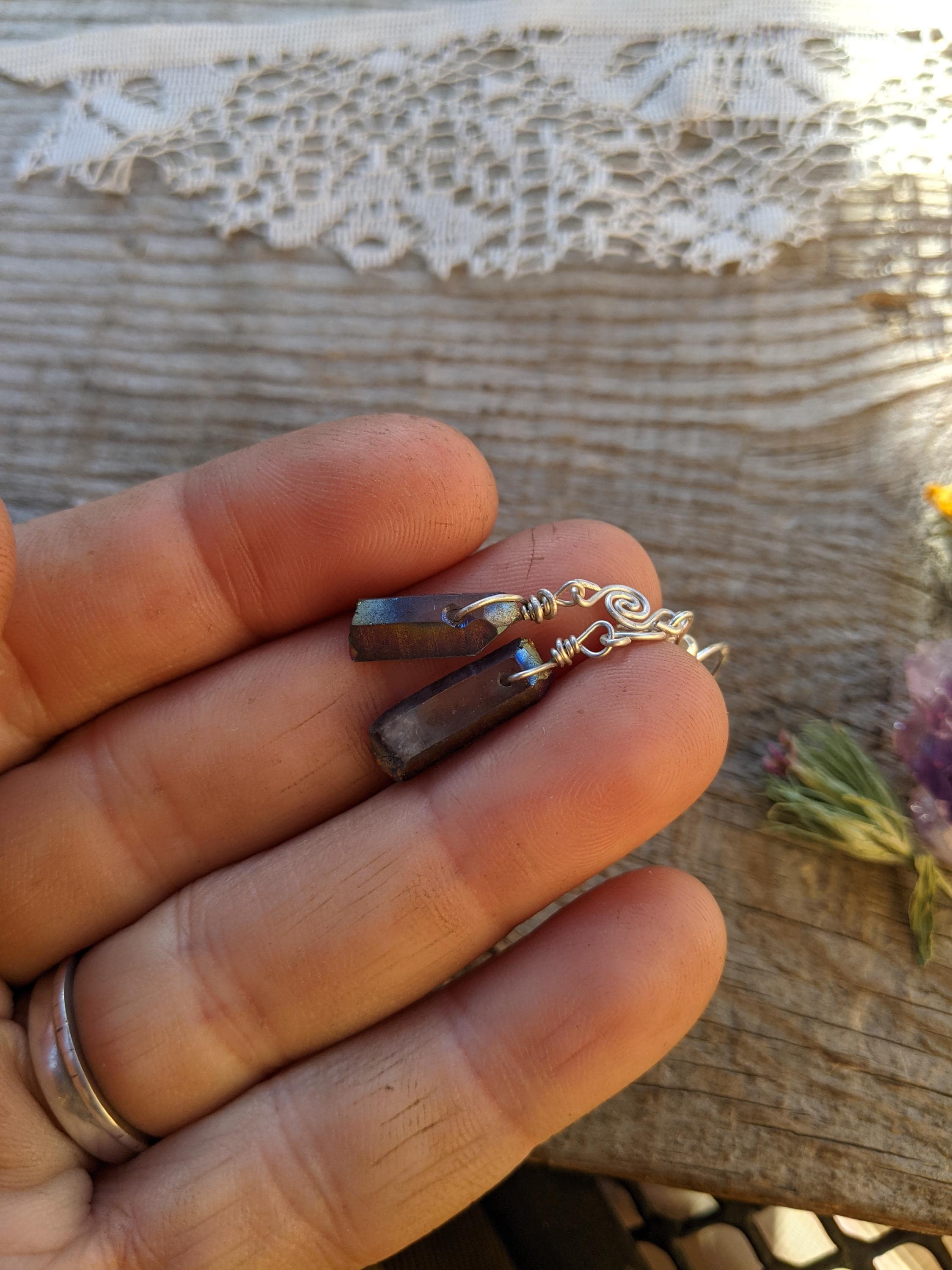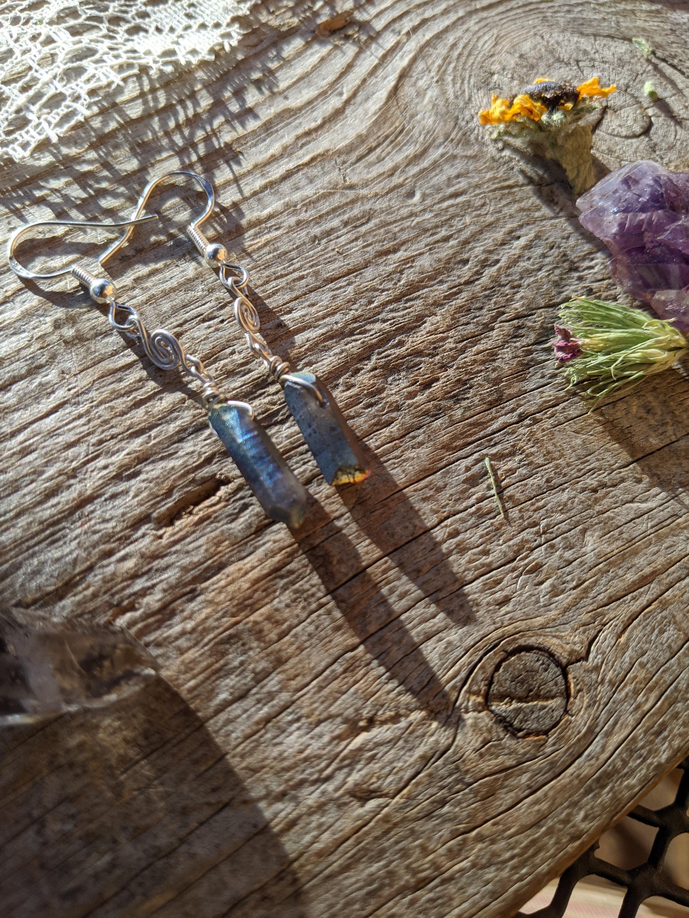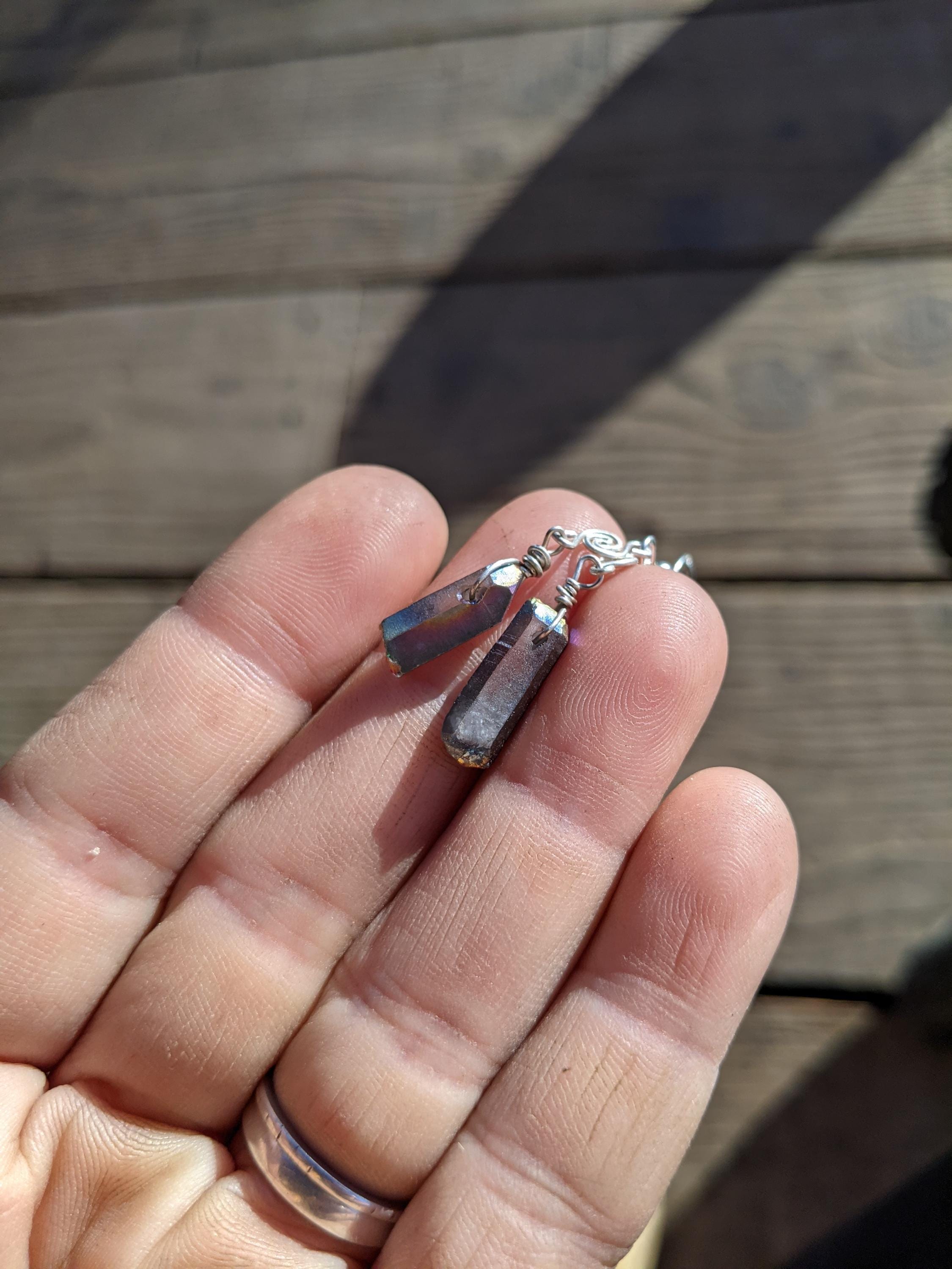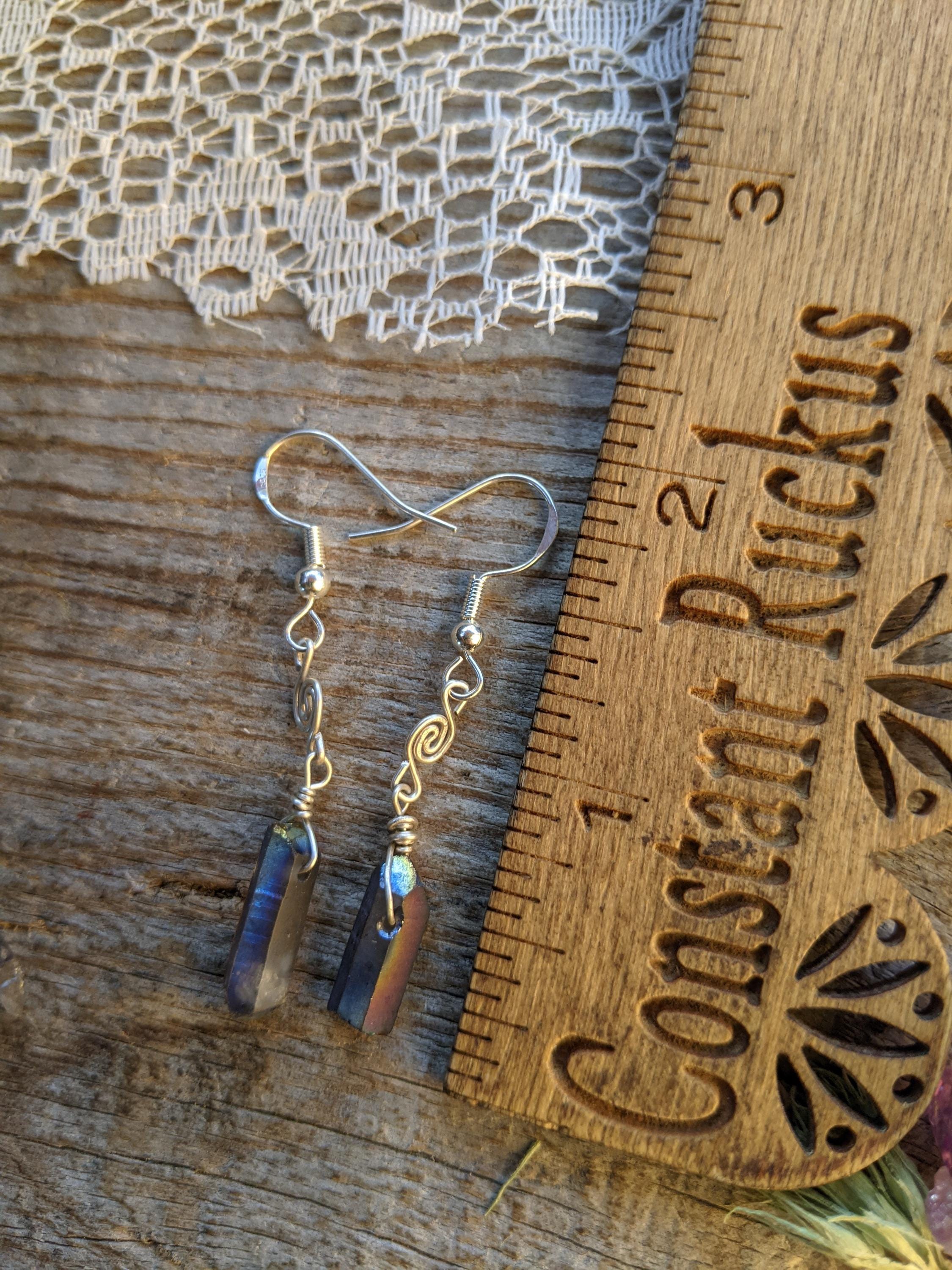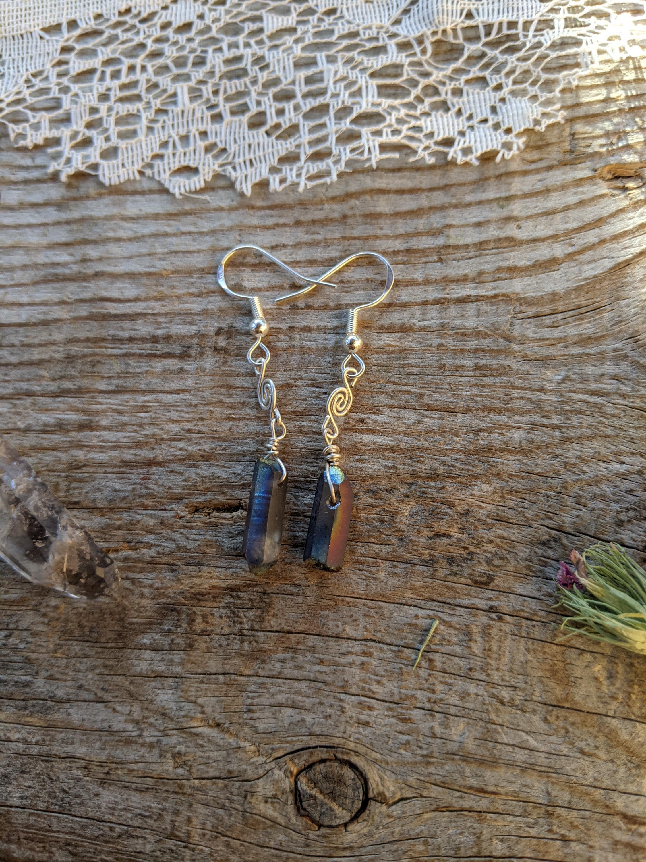 Rainbow aura quartz crystal earrings in sterling silver with little swirls handmade by me :)