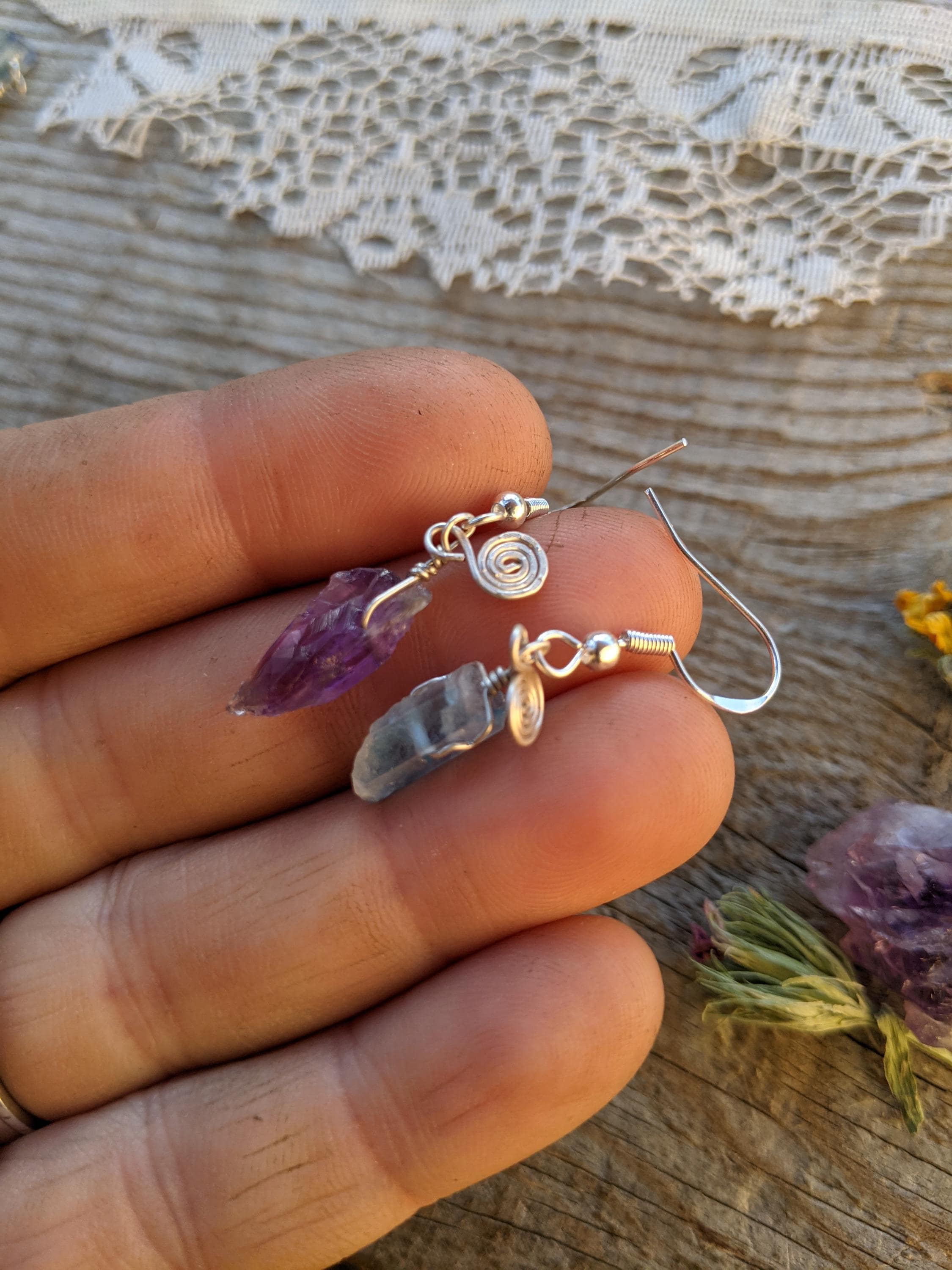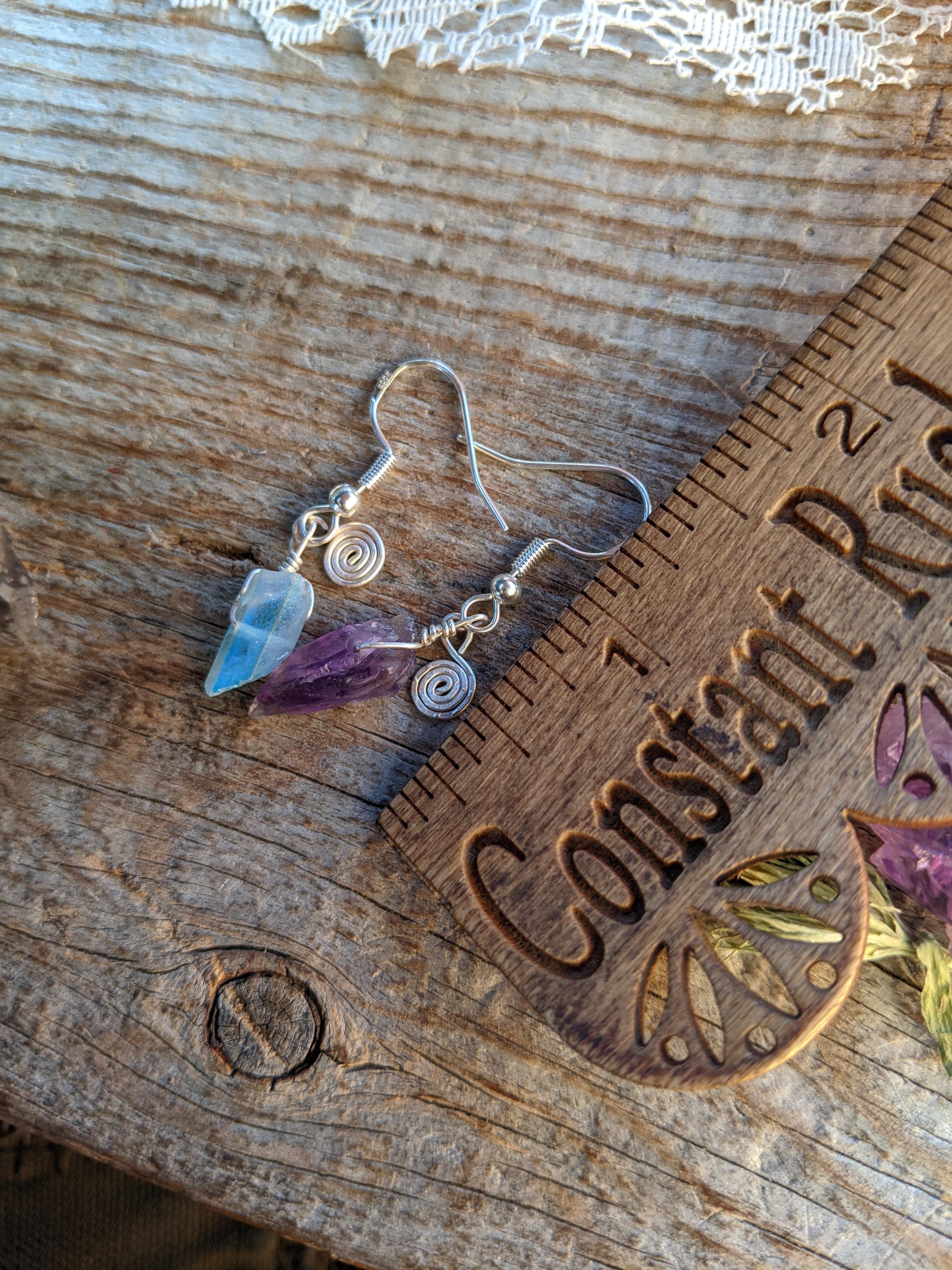 Mismatched Amethyst and Aqua Aura Quartz Earrings, aqua aura quartz crystal earrings, amethyst earrings, raw crystal earrings, natural ameth