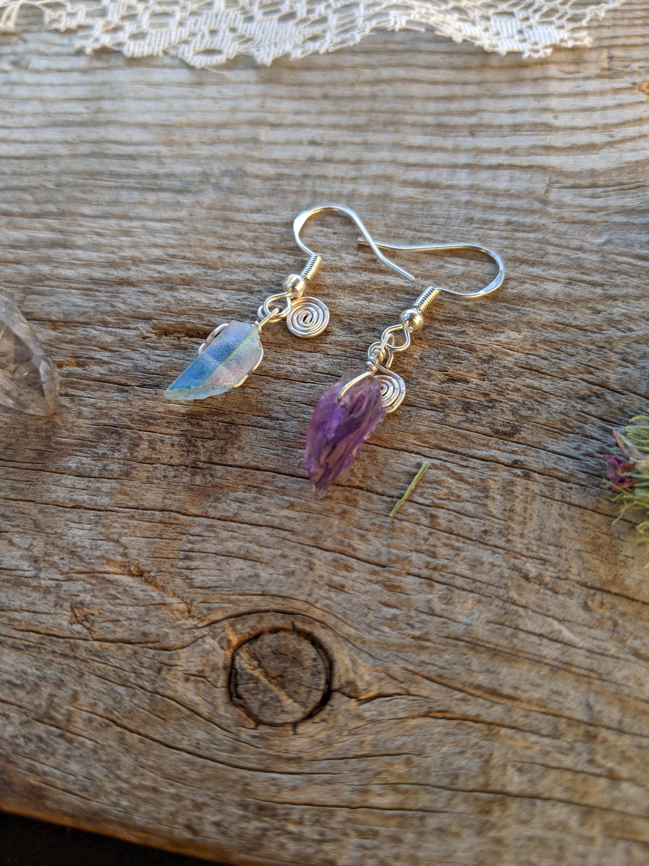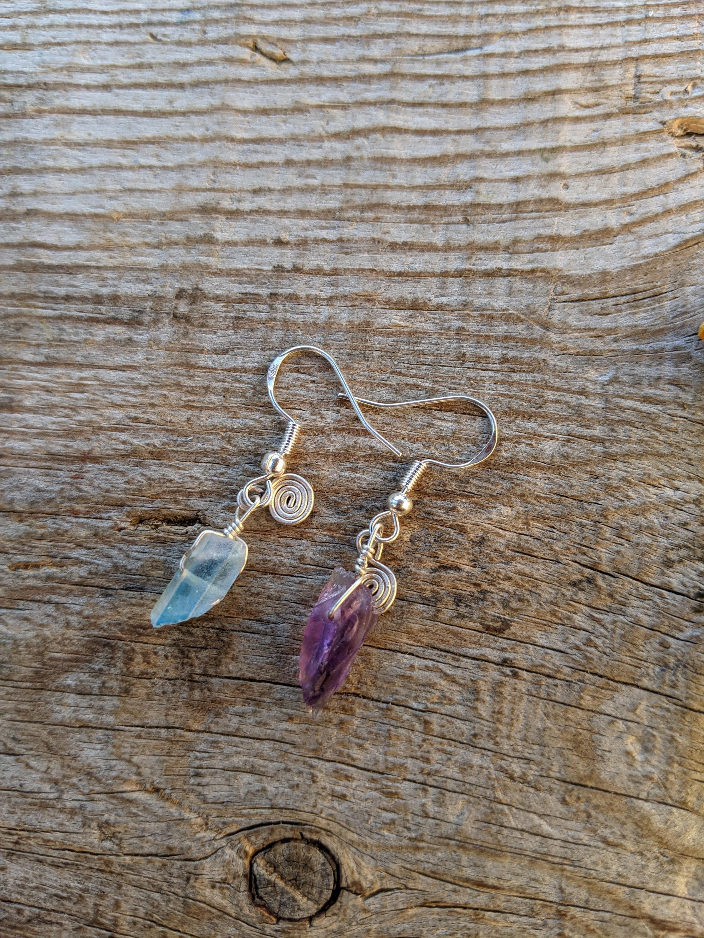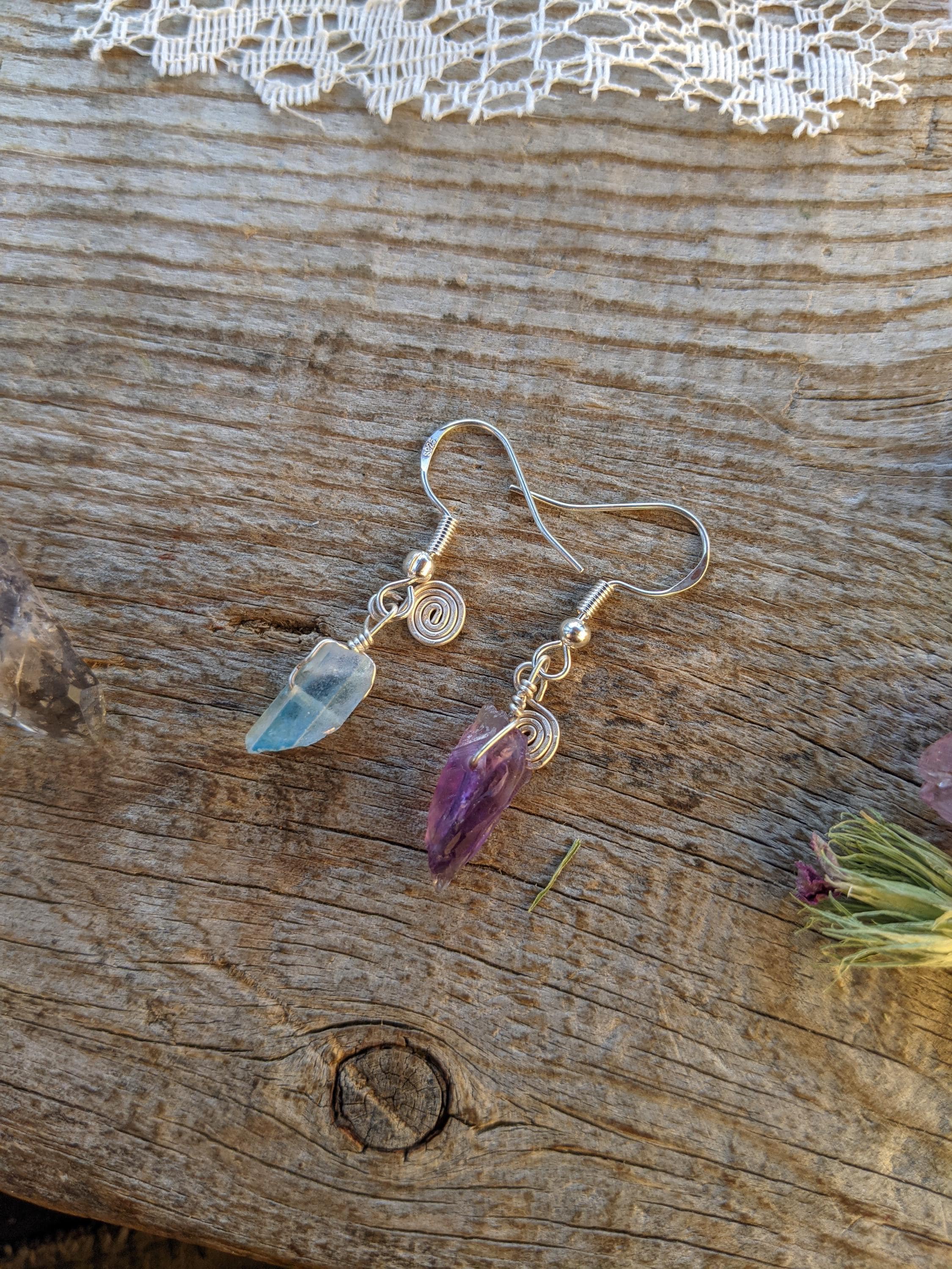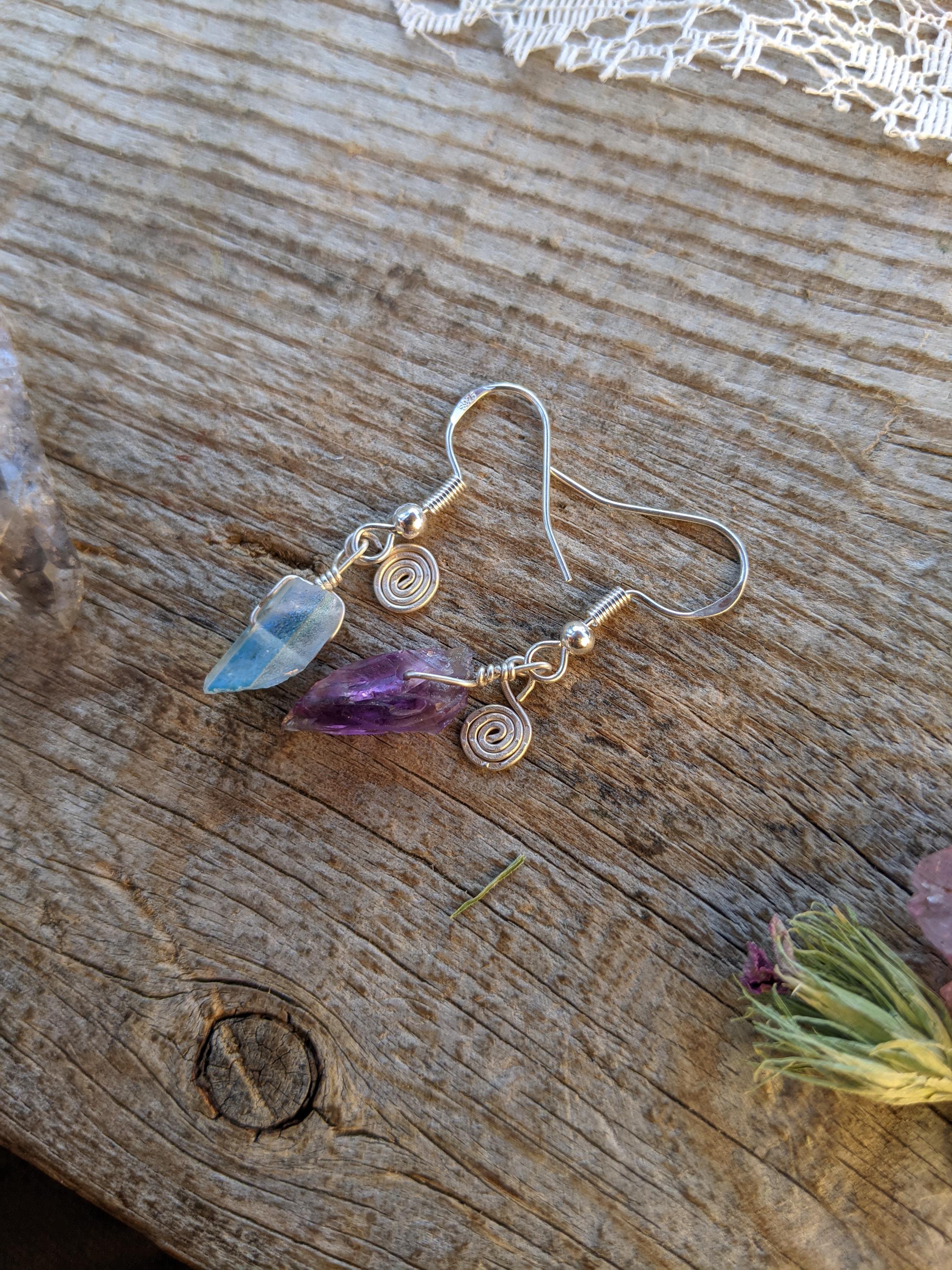 A unique pair of mismatched raw amethyst and aqua aura quartz crystals, wire wrapped in fine silver. These beautiful crystals shine in a rainbow of colors.