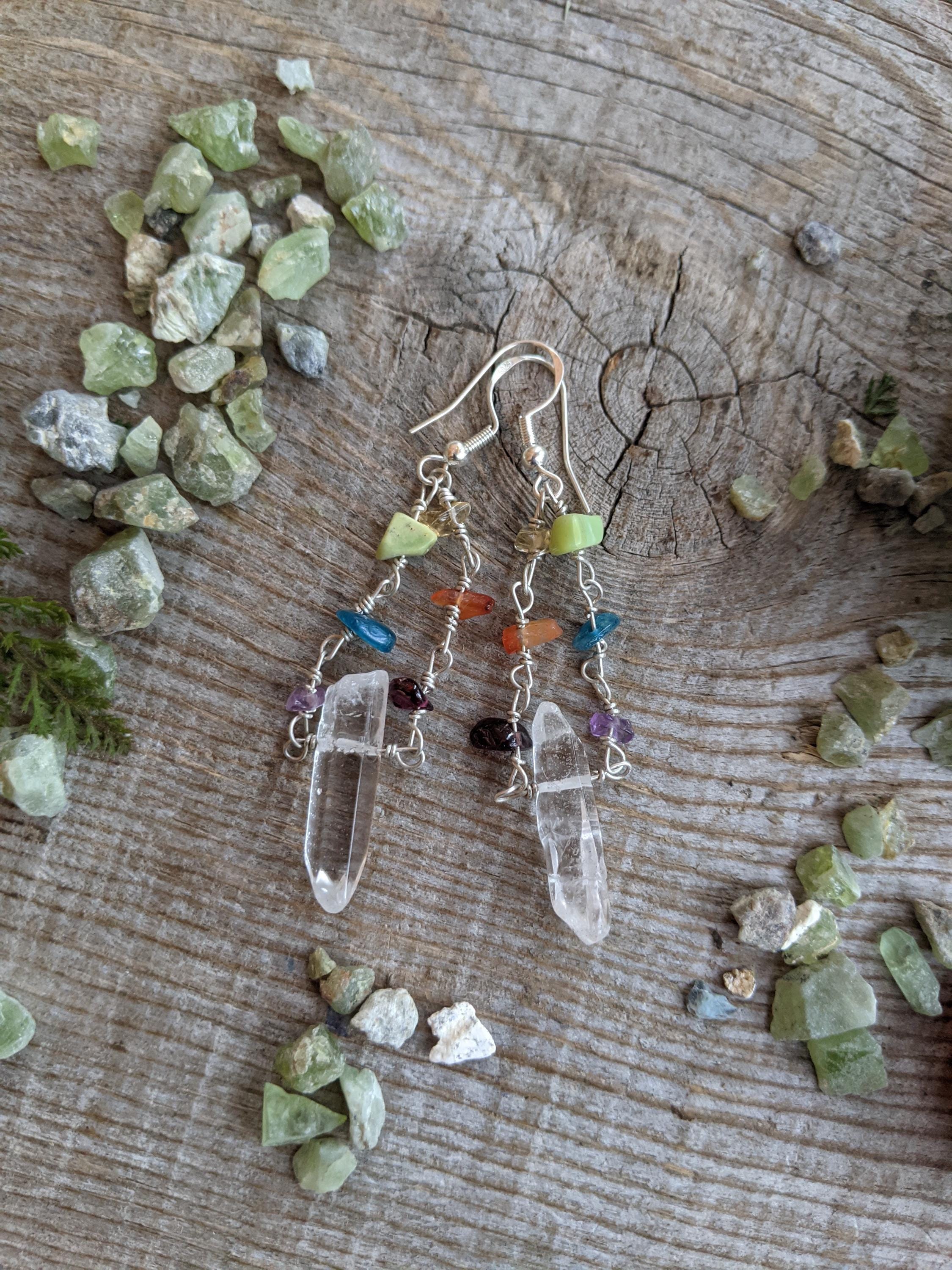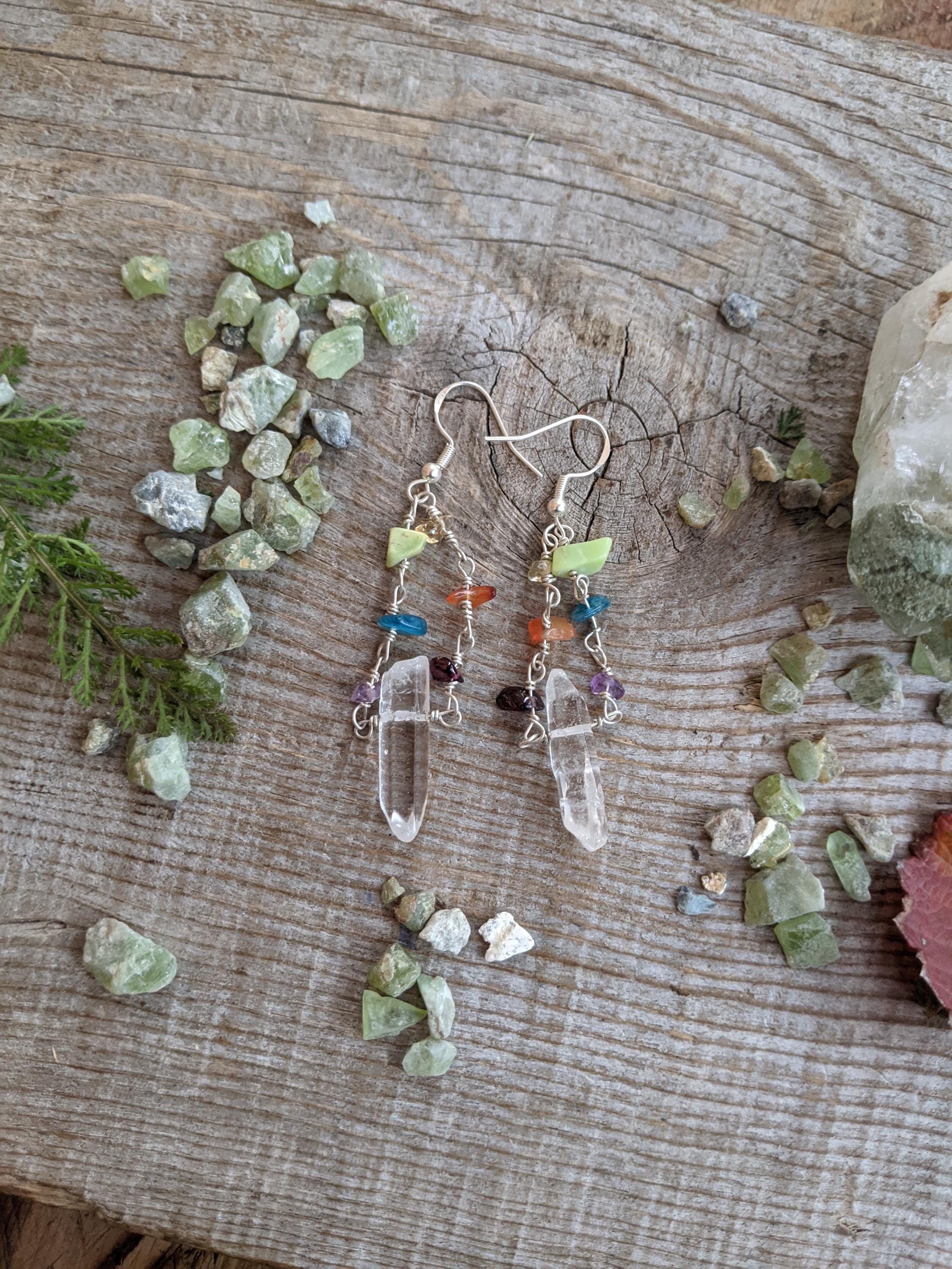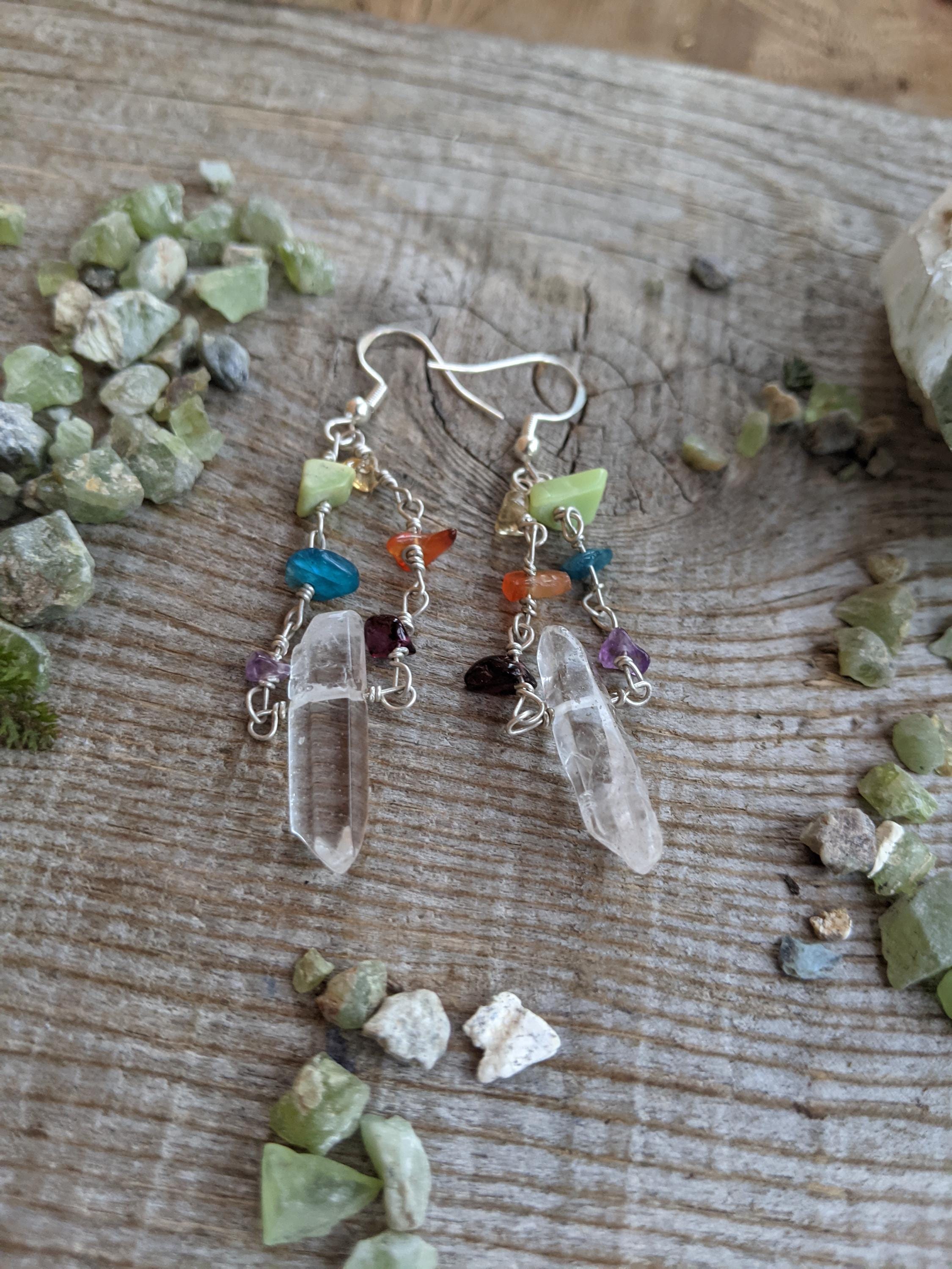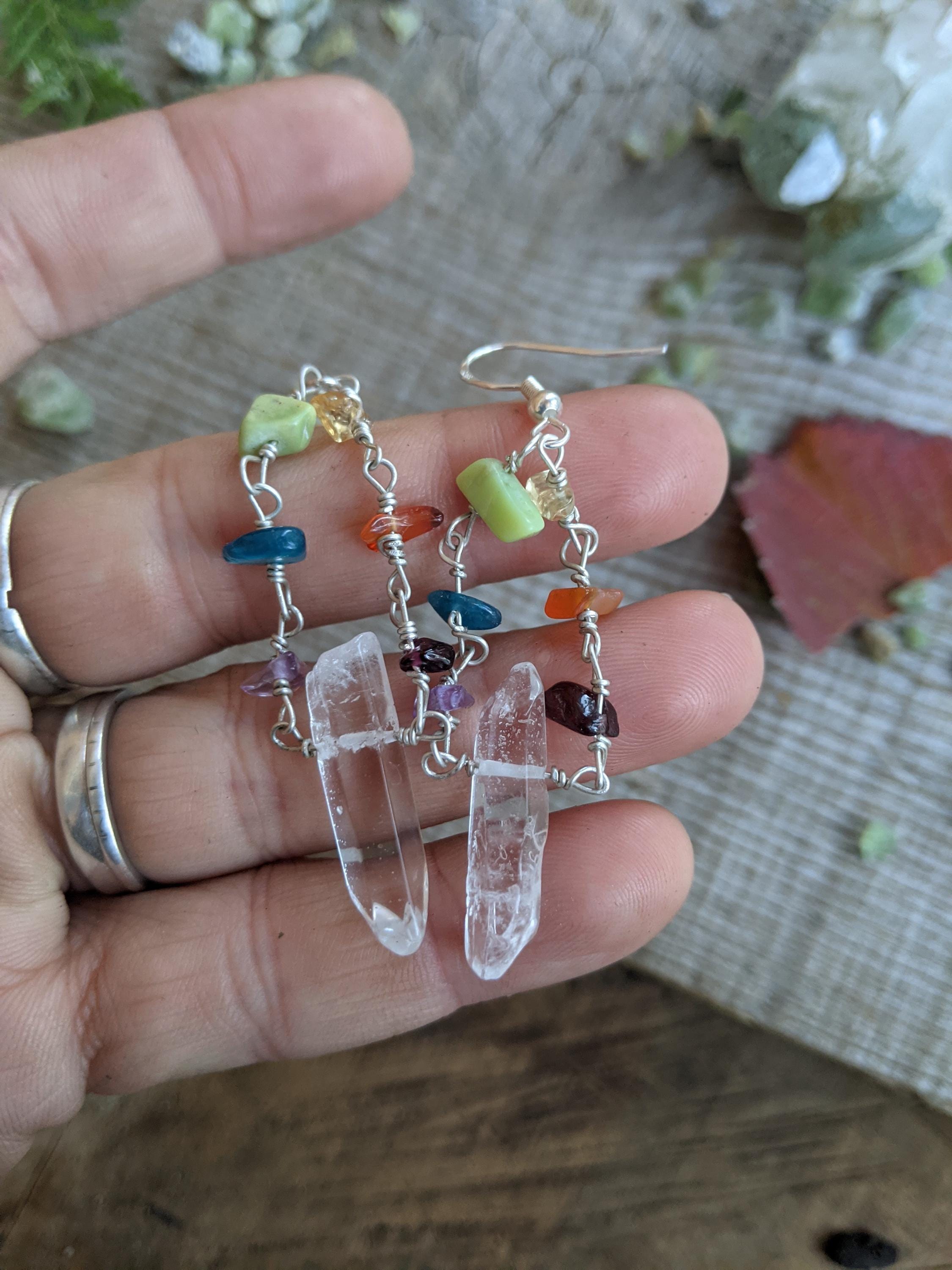 chakra crystal earrings featuring polished natural authentic crystals including garnet, carnelian, citrine, chrysophrase, blue apatite and amethyst and rose quartz crystals along with a big beautiful polished clear quartz crystal