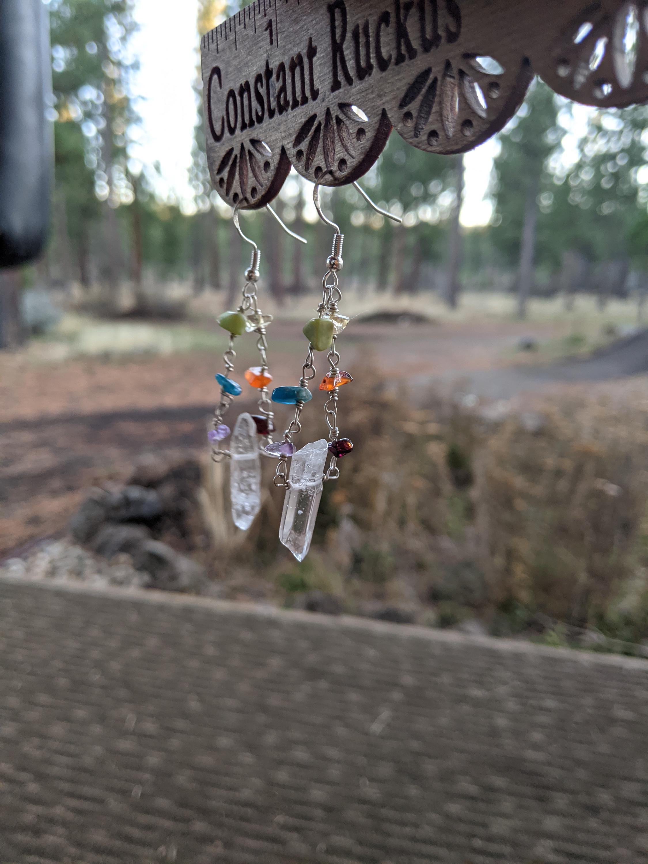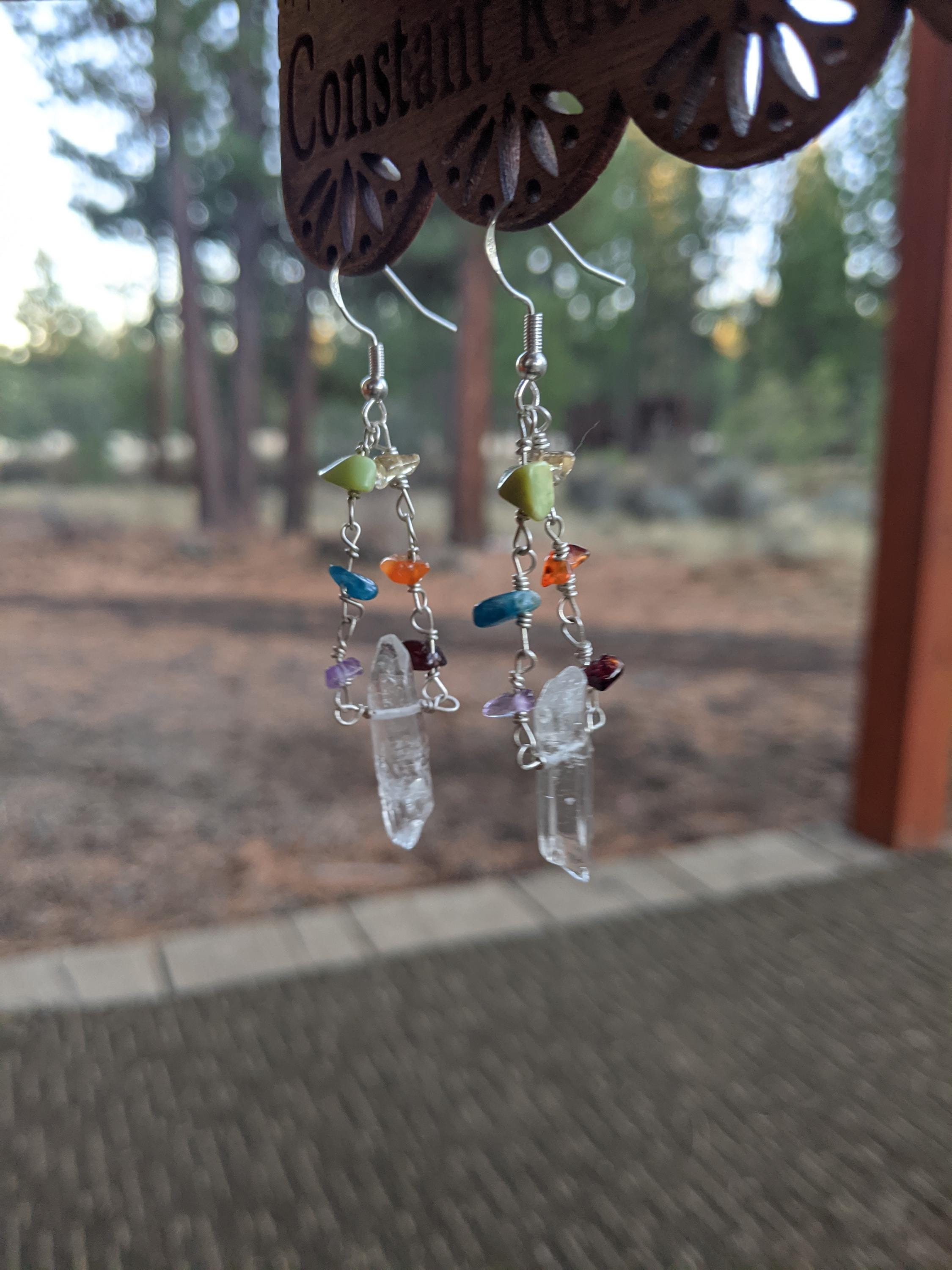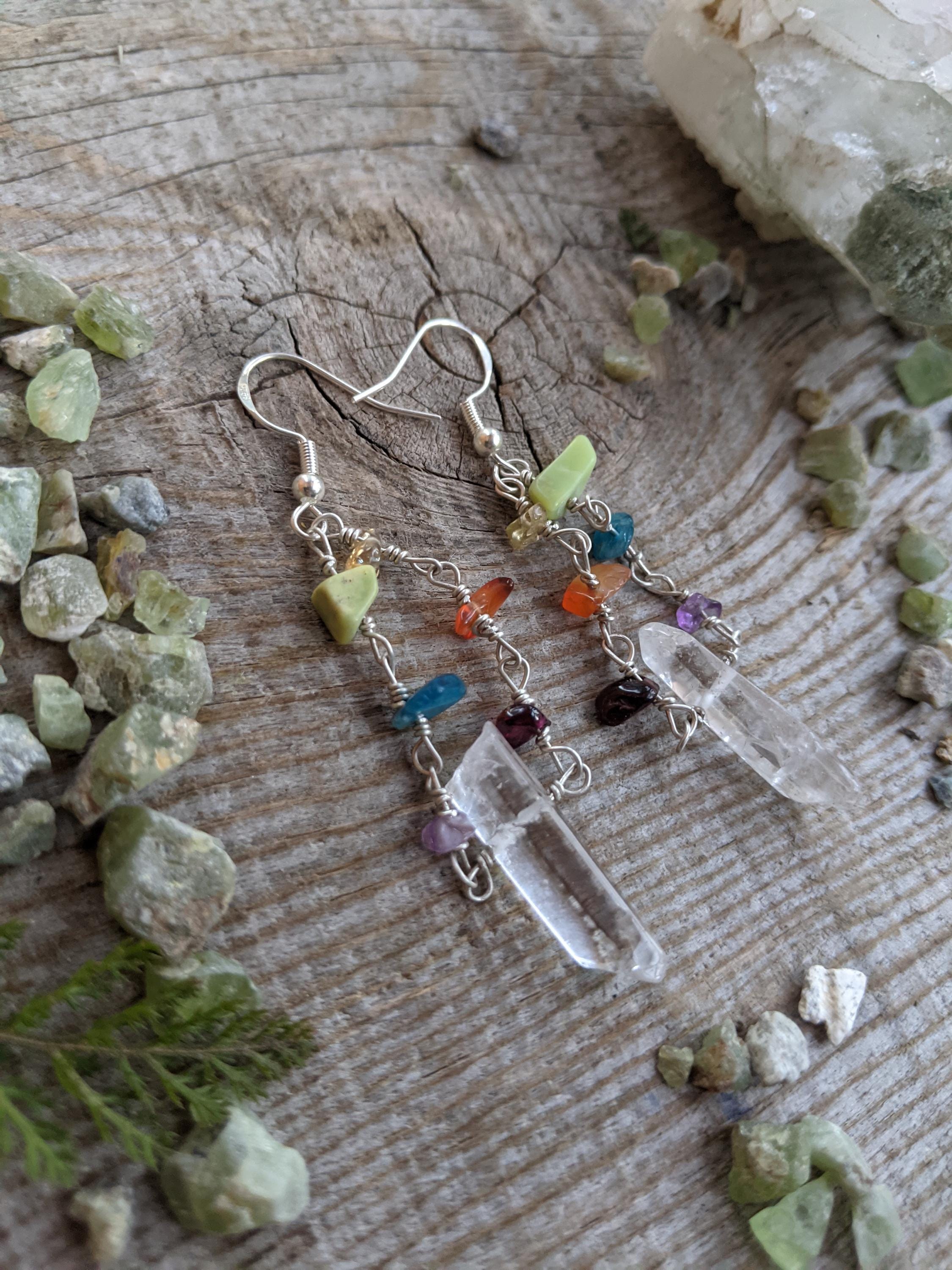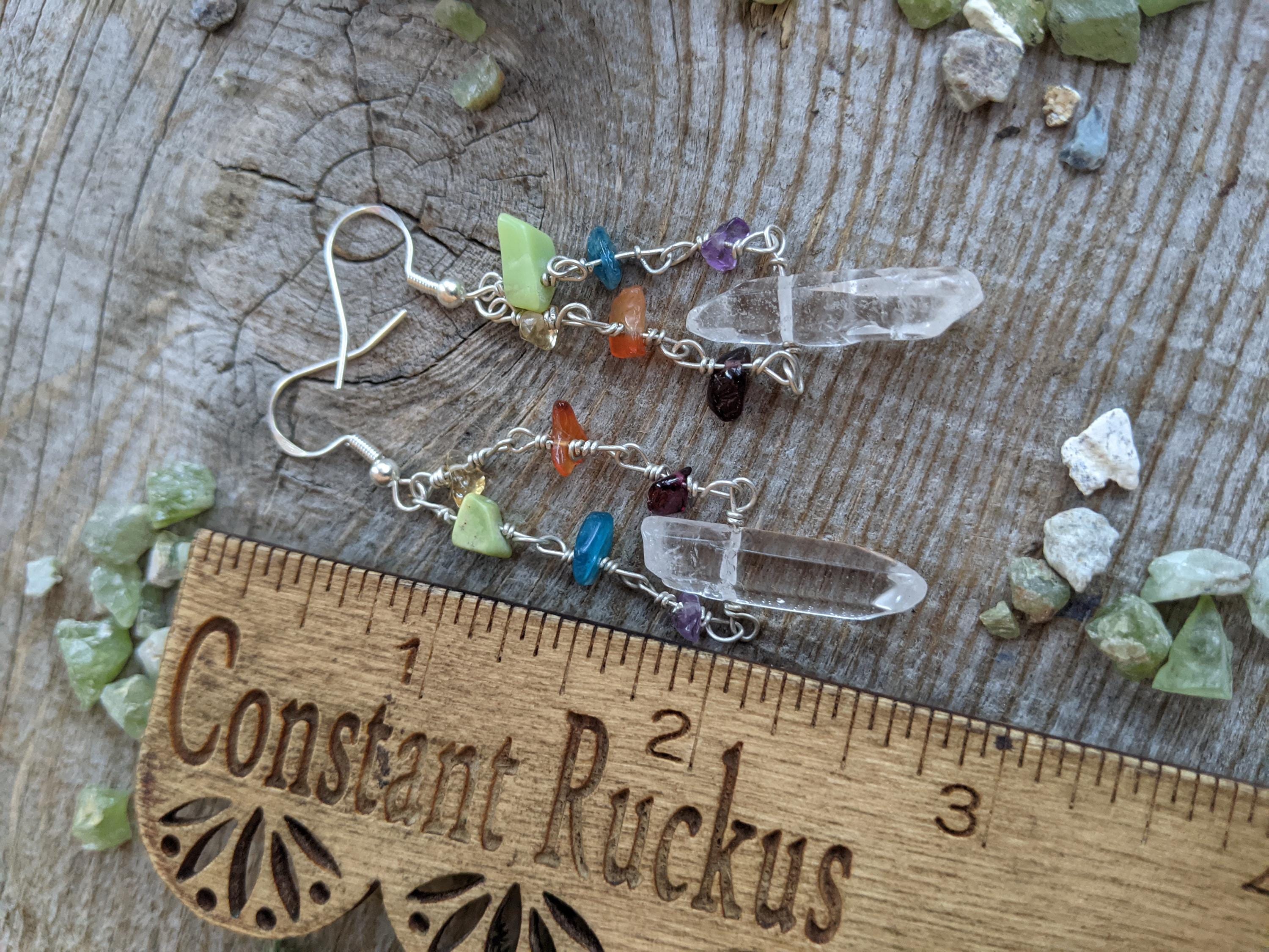 chakra crystal earrings featuring polished natural authentic crystals including garnet, carnelian, citrine, chrysophrase, blue apatite and amethyst and rose quartz crystals along with a big beautiful polished clear quartz crystal