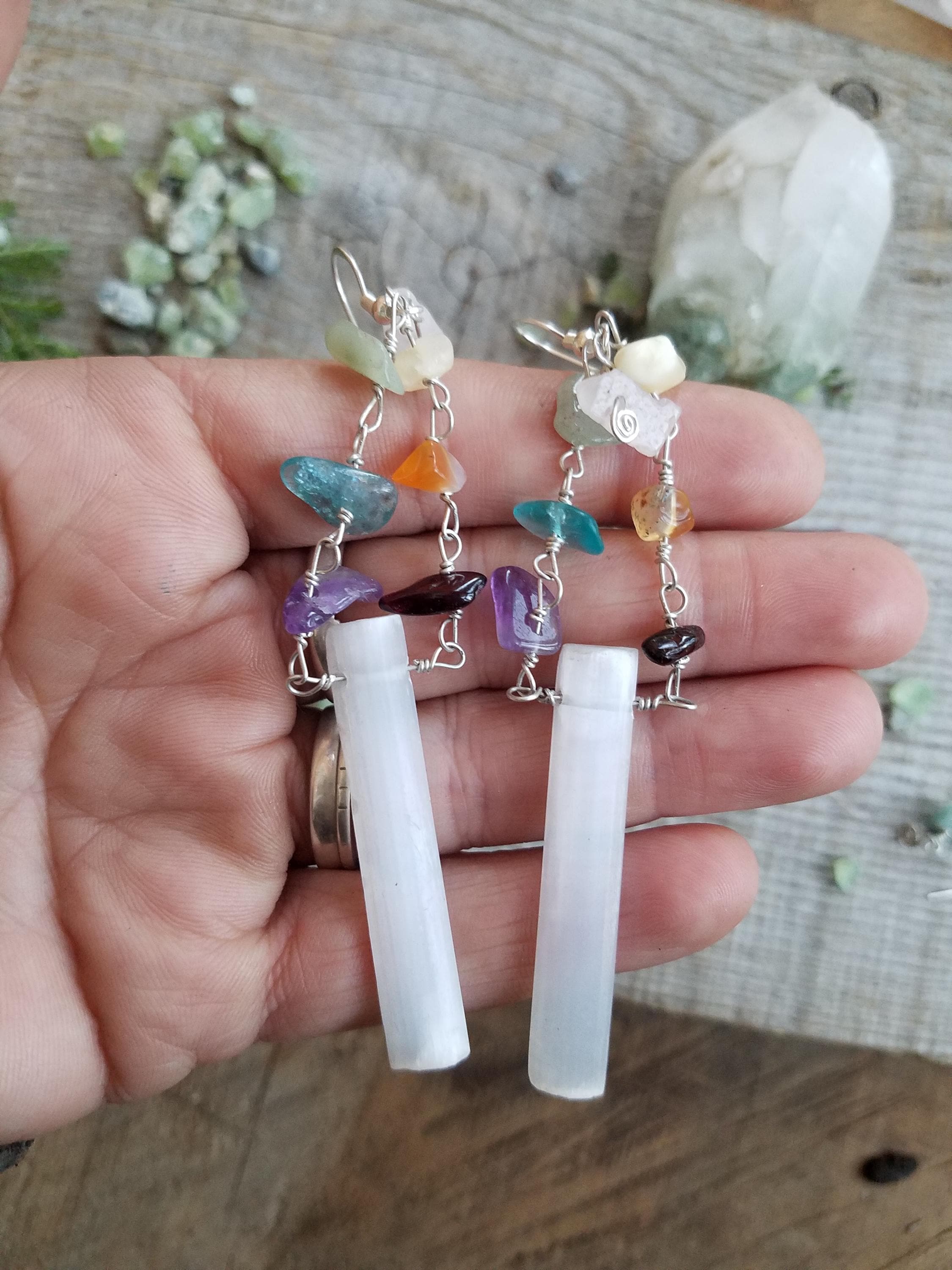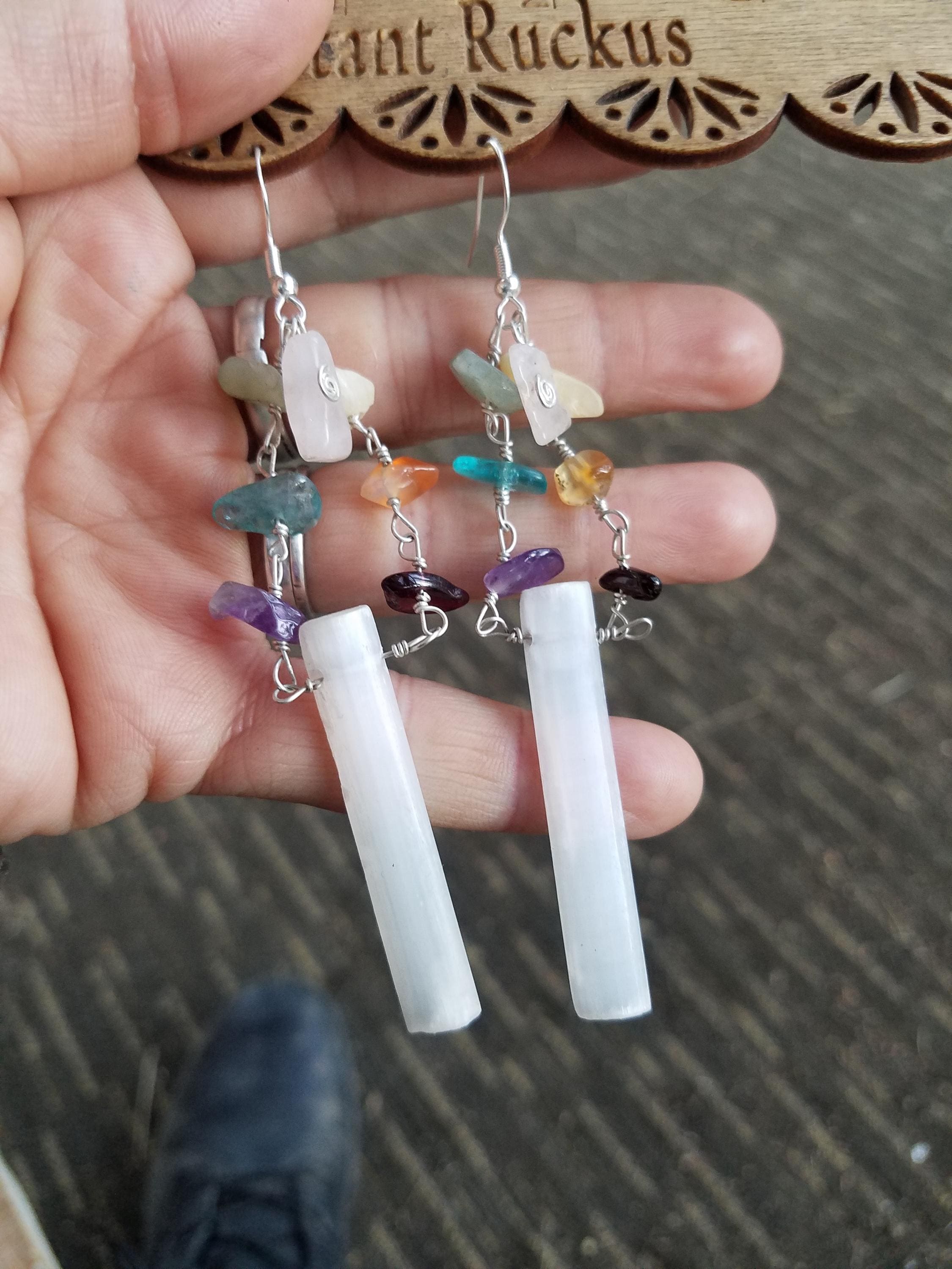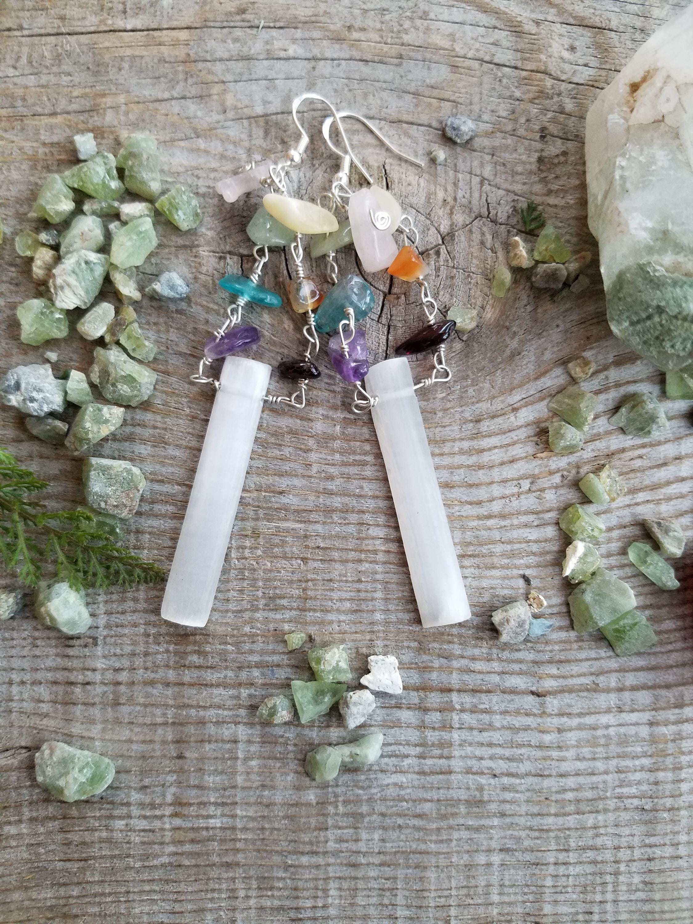 Rainbow Selenite earrings, natural selenite crystal earrings, chakra earrings, rainbow chakra earrings, natural selenite earrings, natural