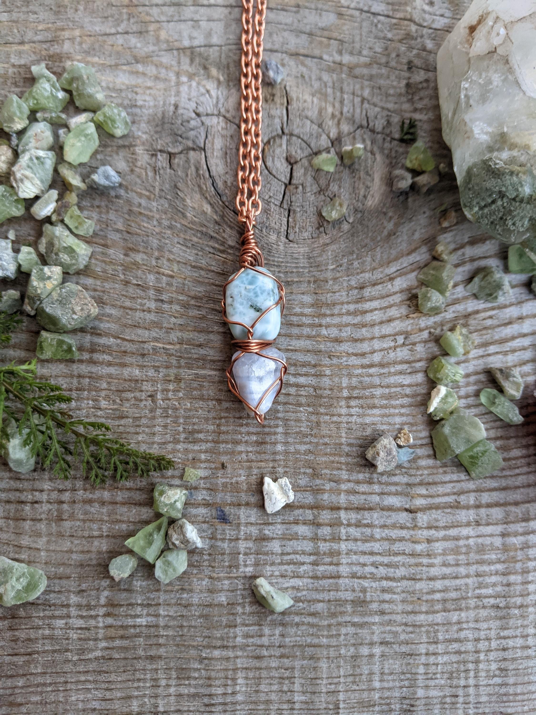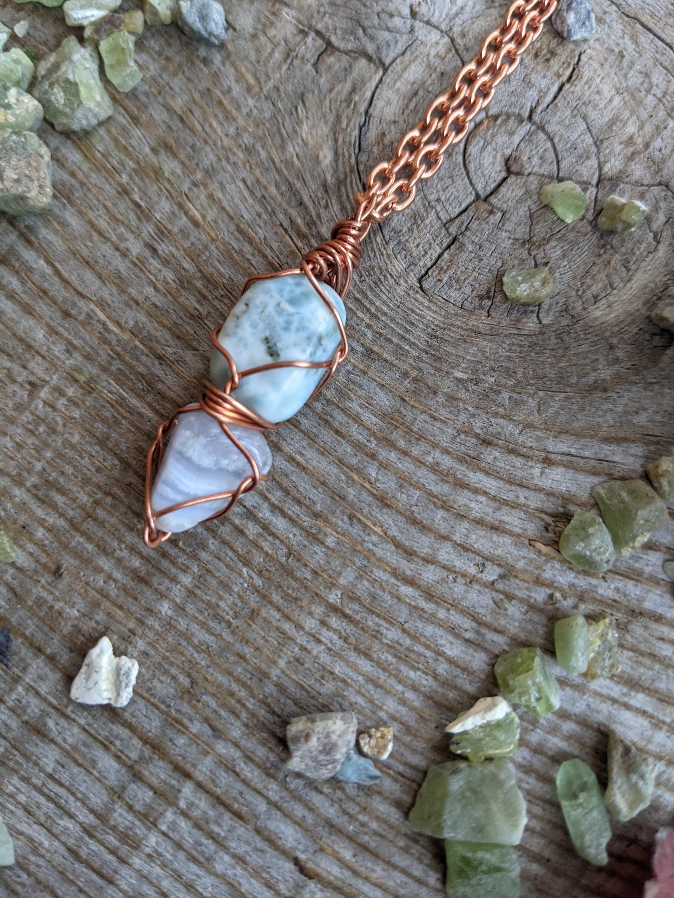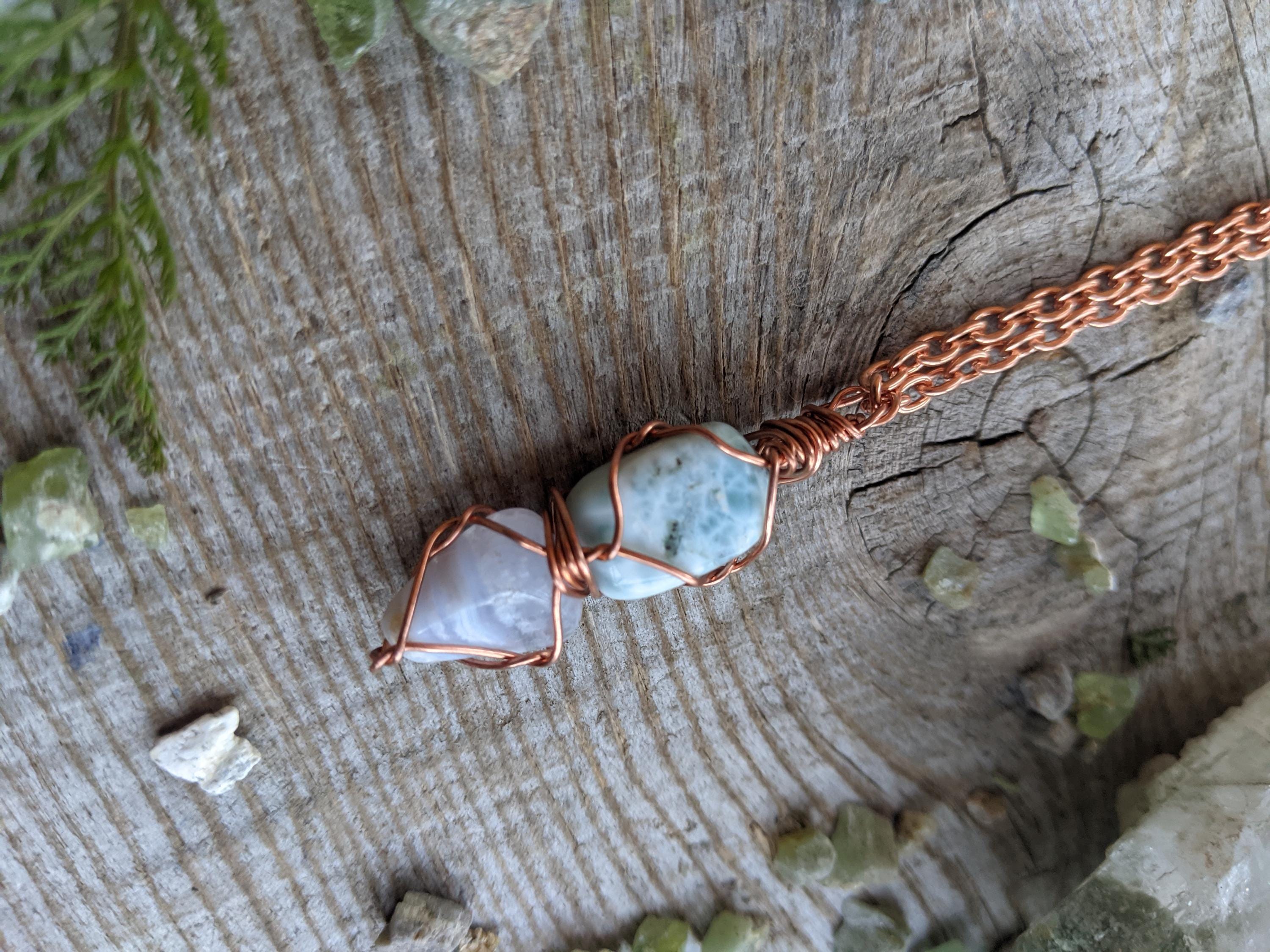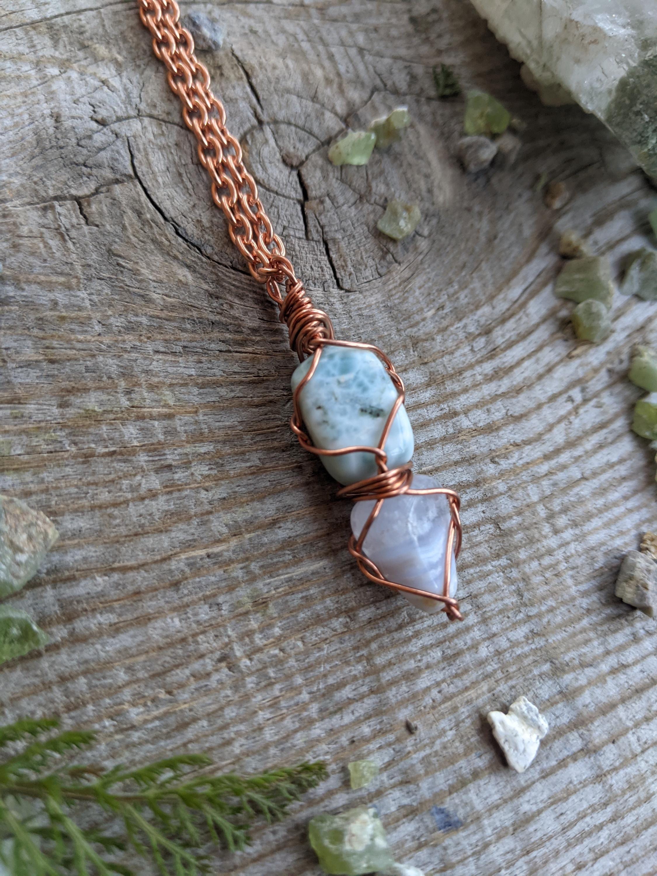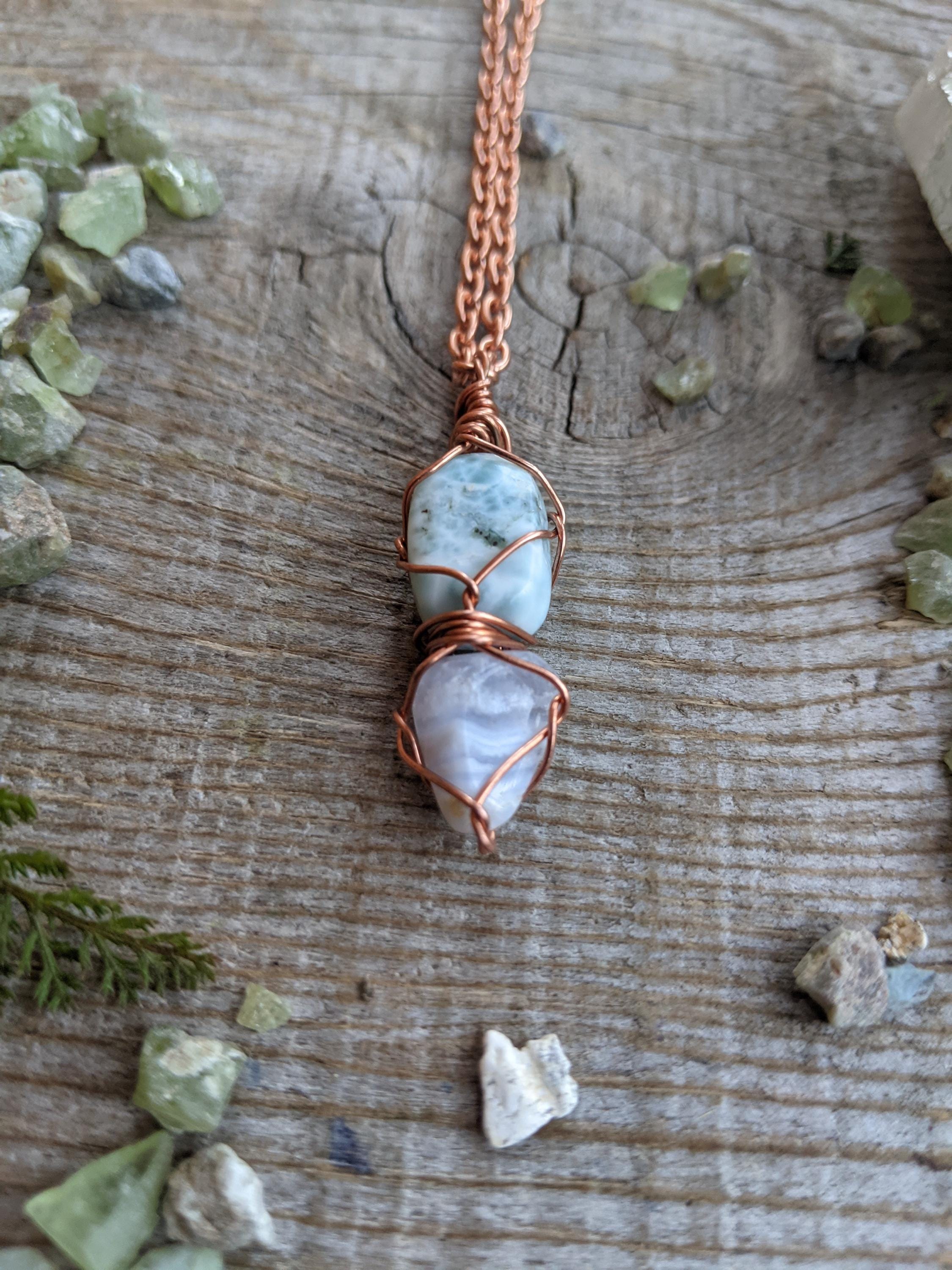 Natural polished larimar and Blue lace agate crystal pendant, copper larimar pendant, copper blue lace agate pendant, natural larimar crysta