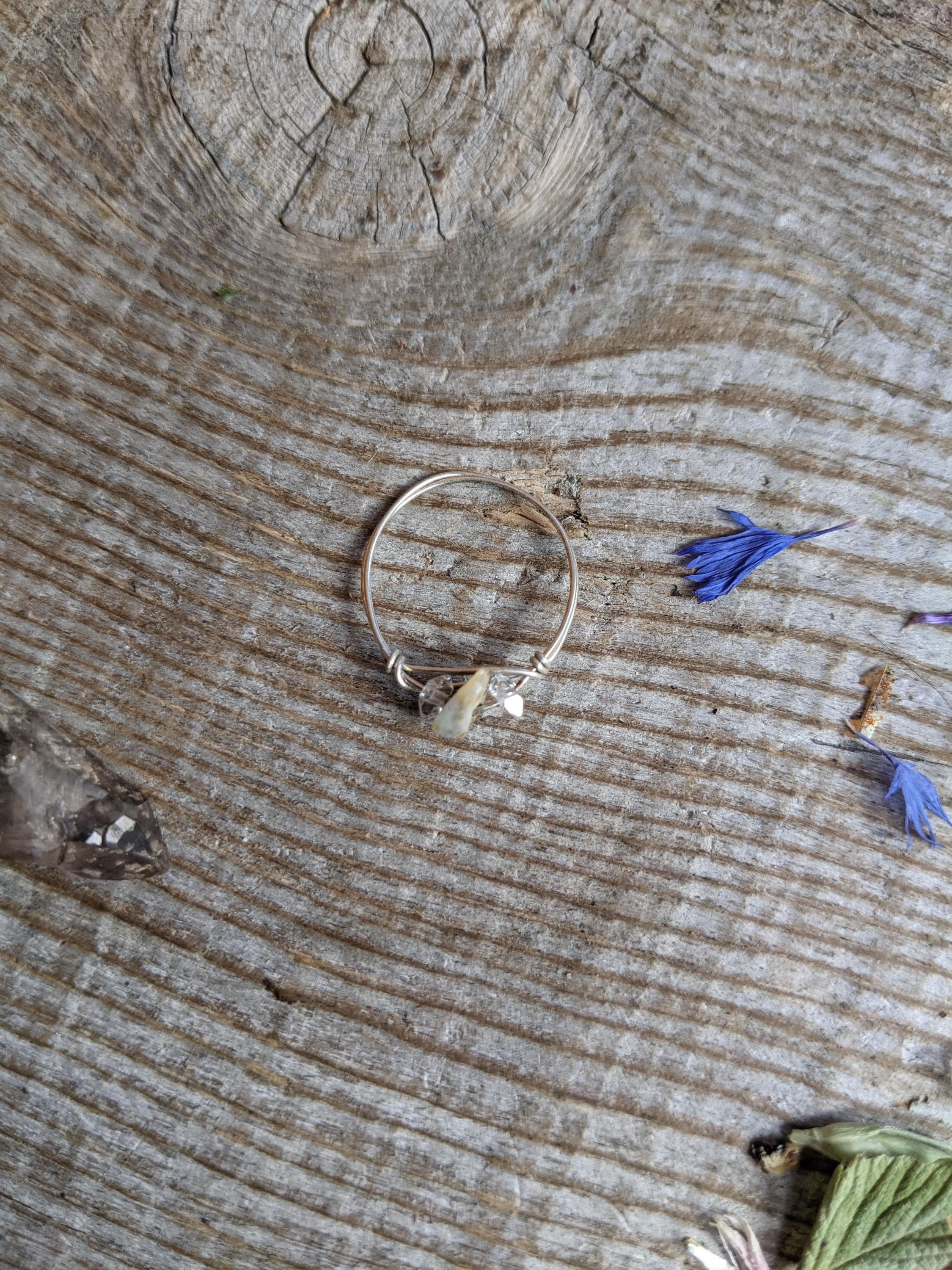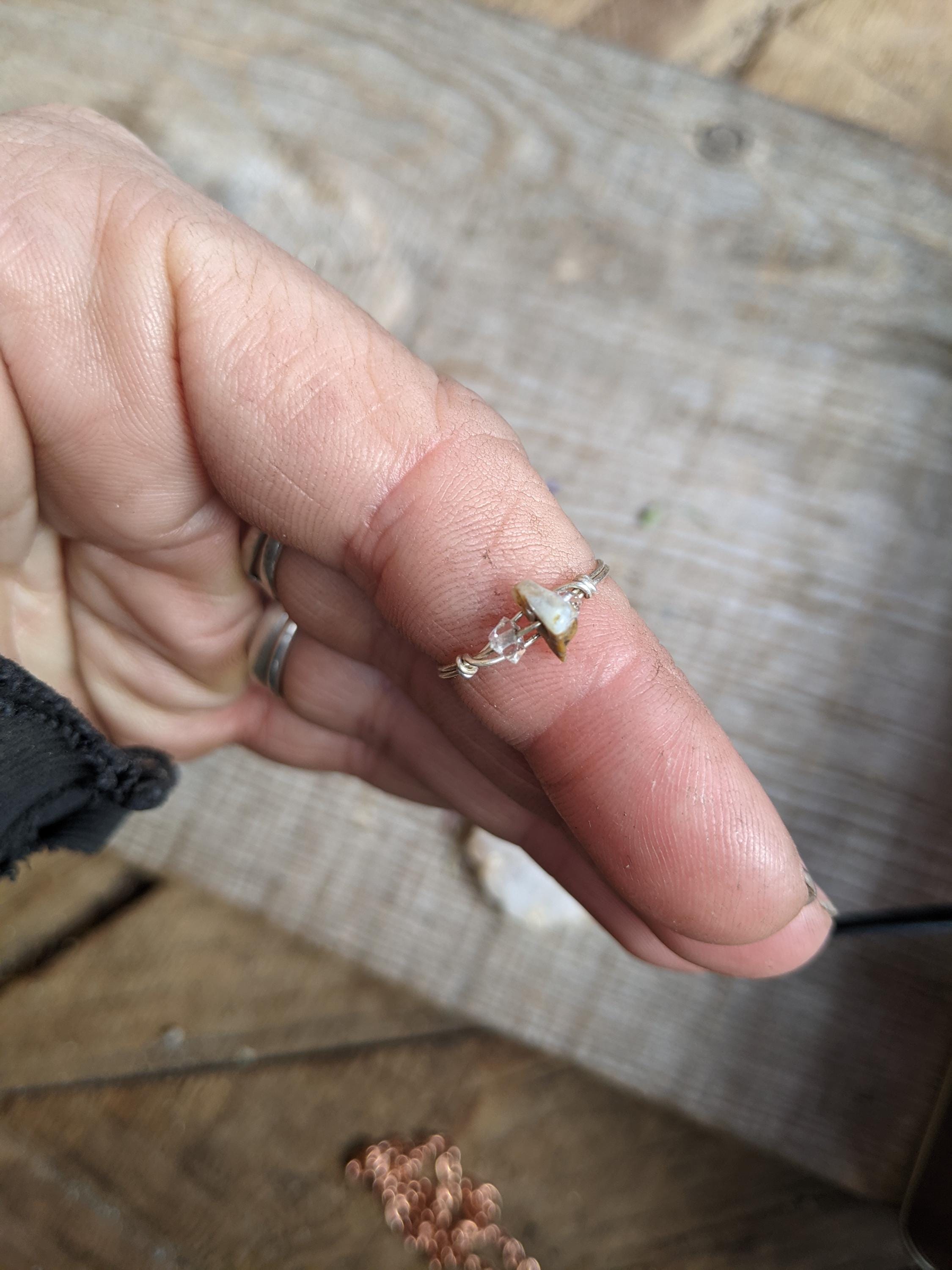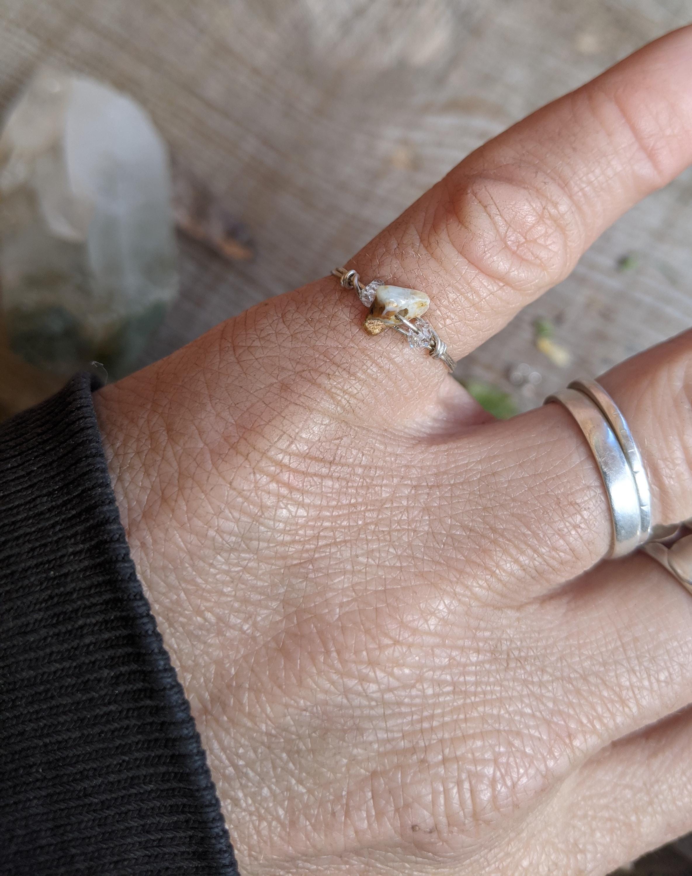 Dainty little opal herkimer diamond ring with a sterling silver band. super tiny mini herkimer crystals are so cute surrounding a rainbow opal right in the center !