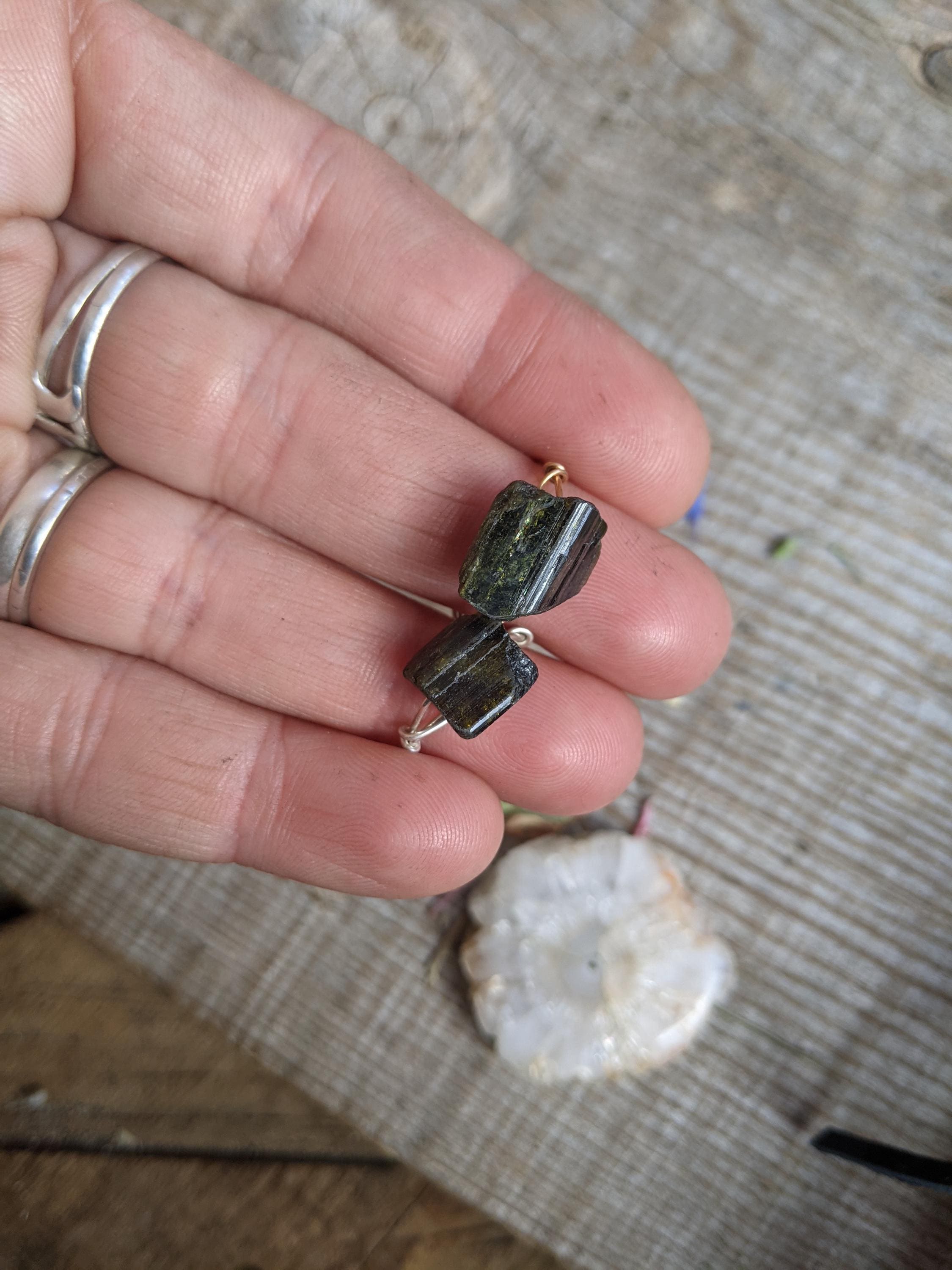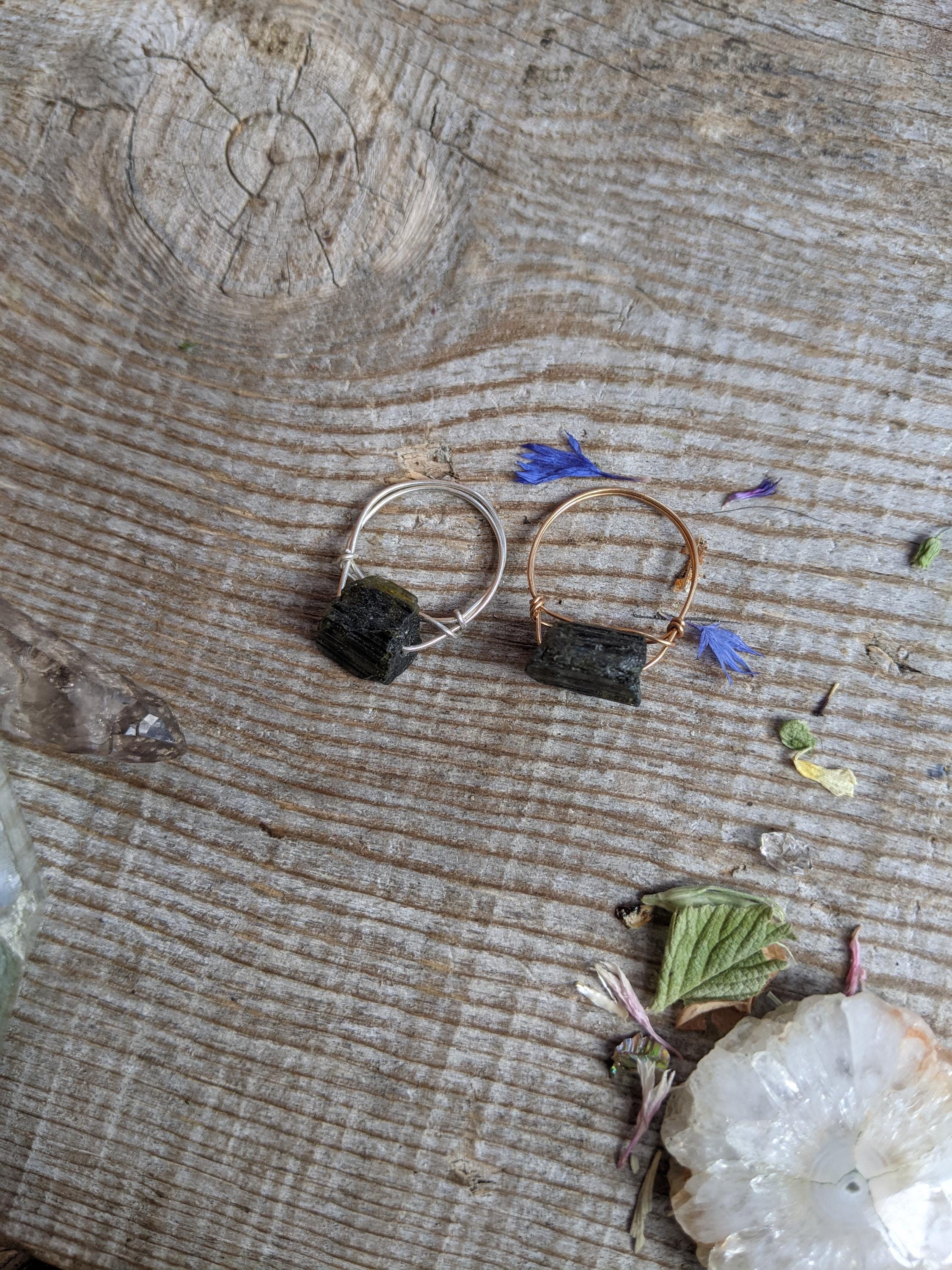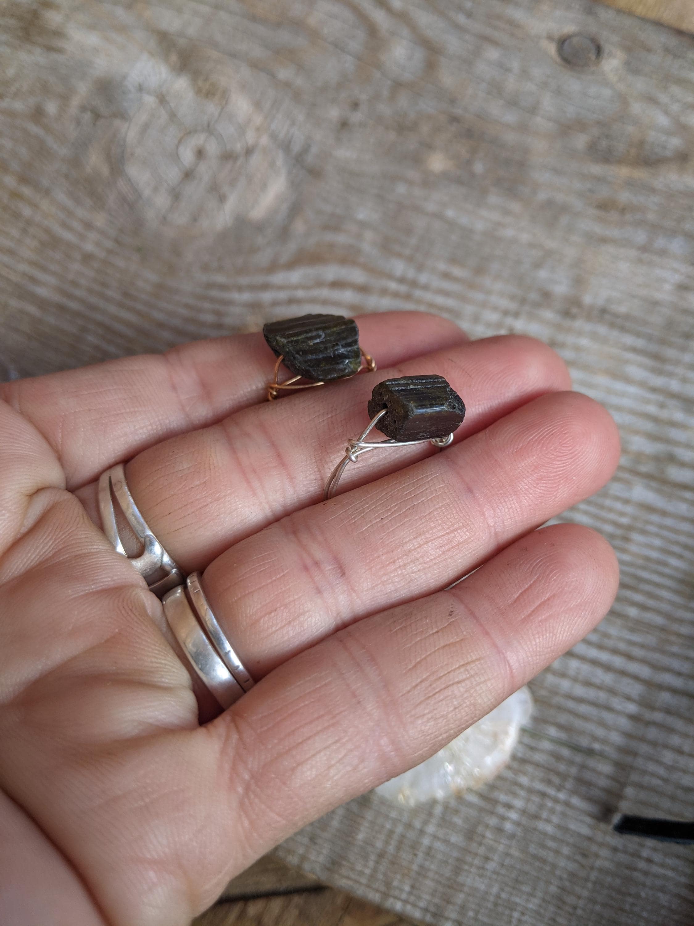 High quality rare dark green tourmaline crystals wrapped into dainty simple ring settings.
