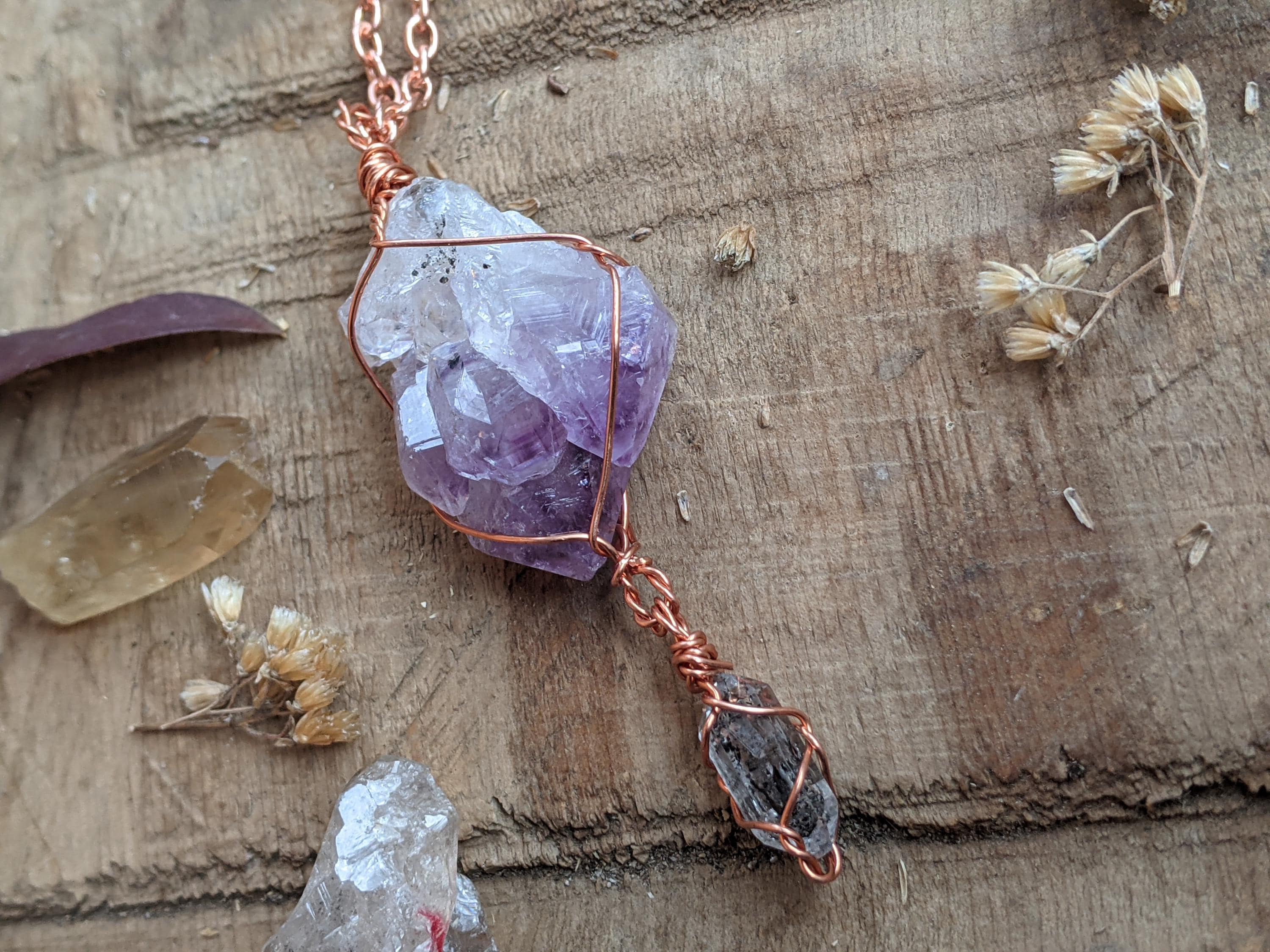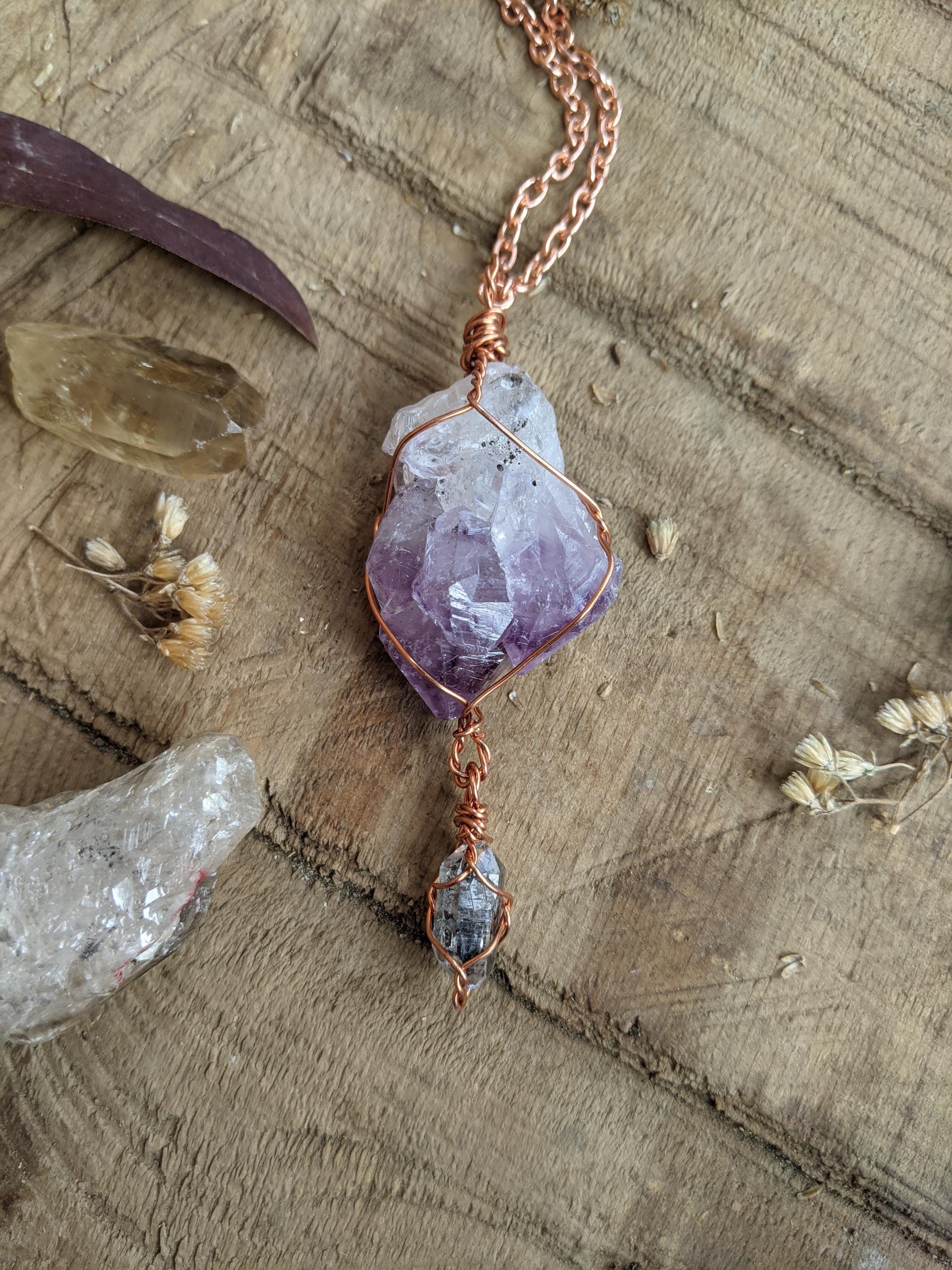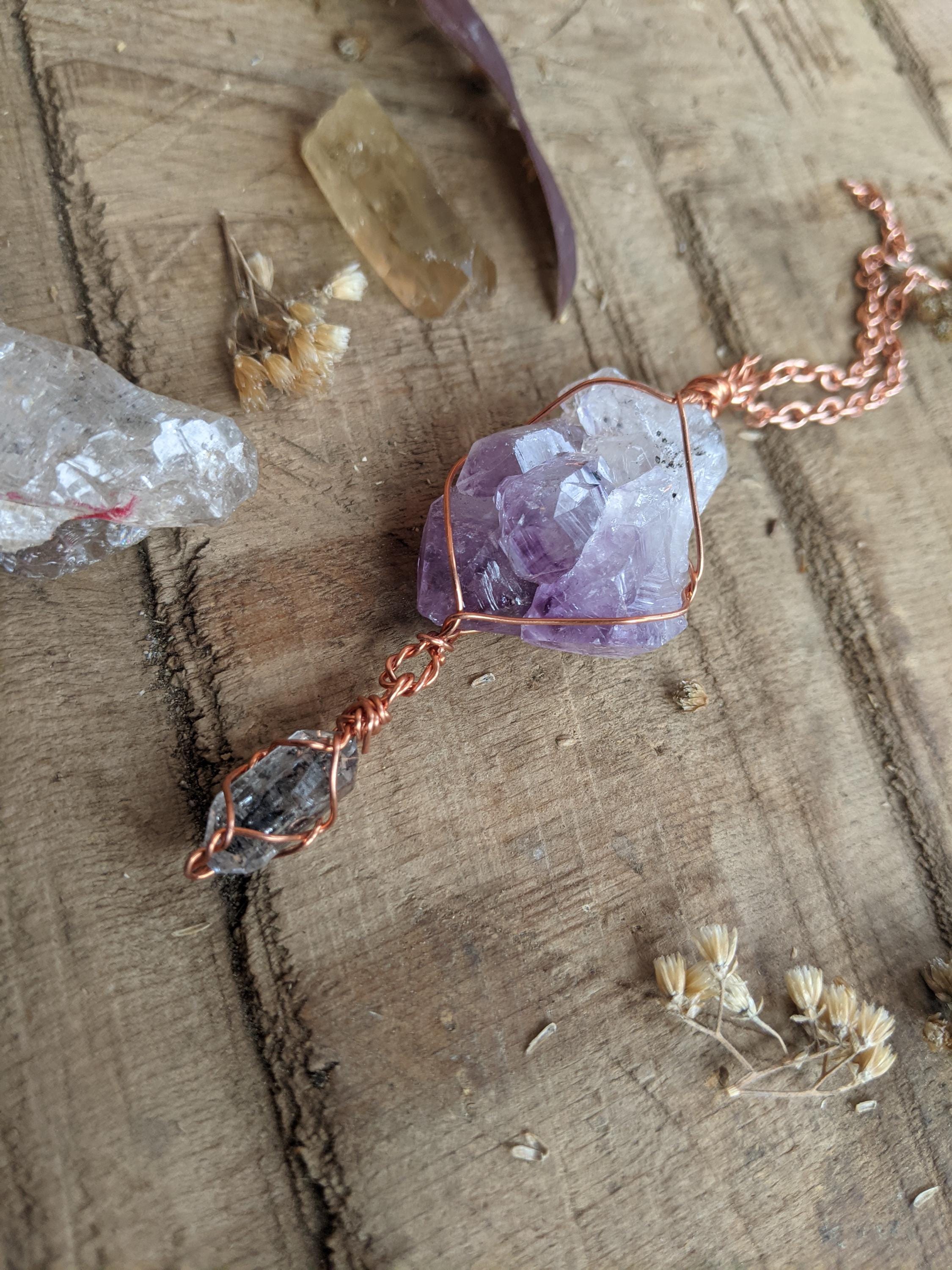 Large amethyst cluster and carbon herkimer diamond crystal pendant, amethyst pendant, amethyst necklace, herkimer pendant, herkimer necklace