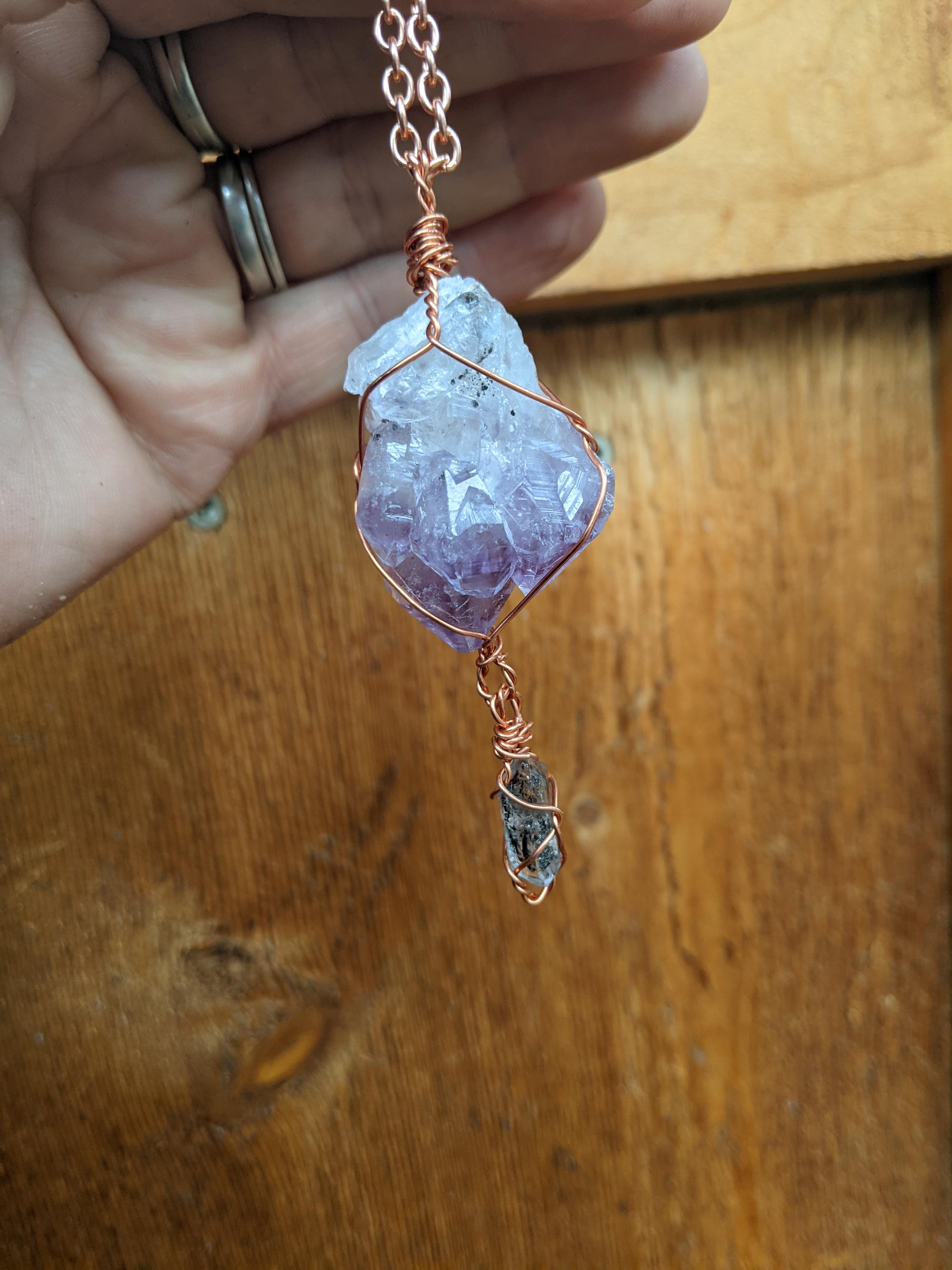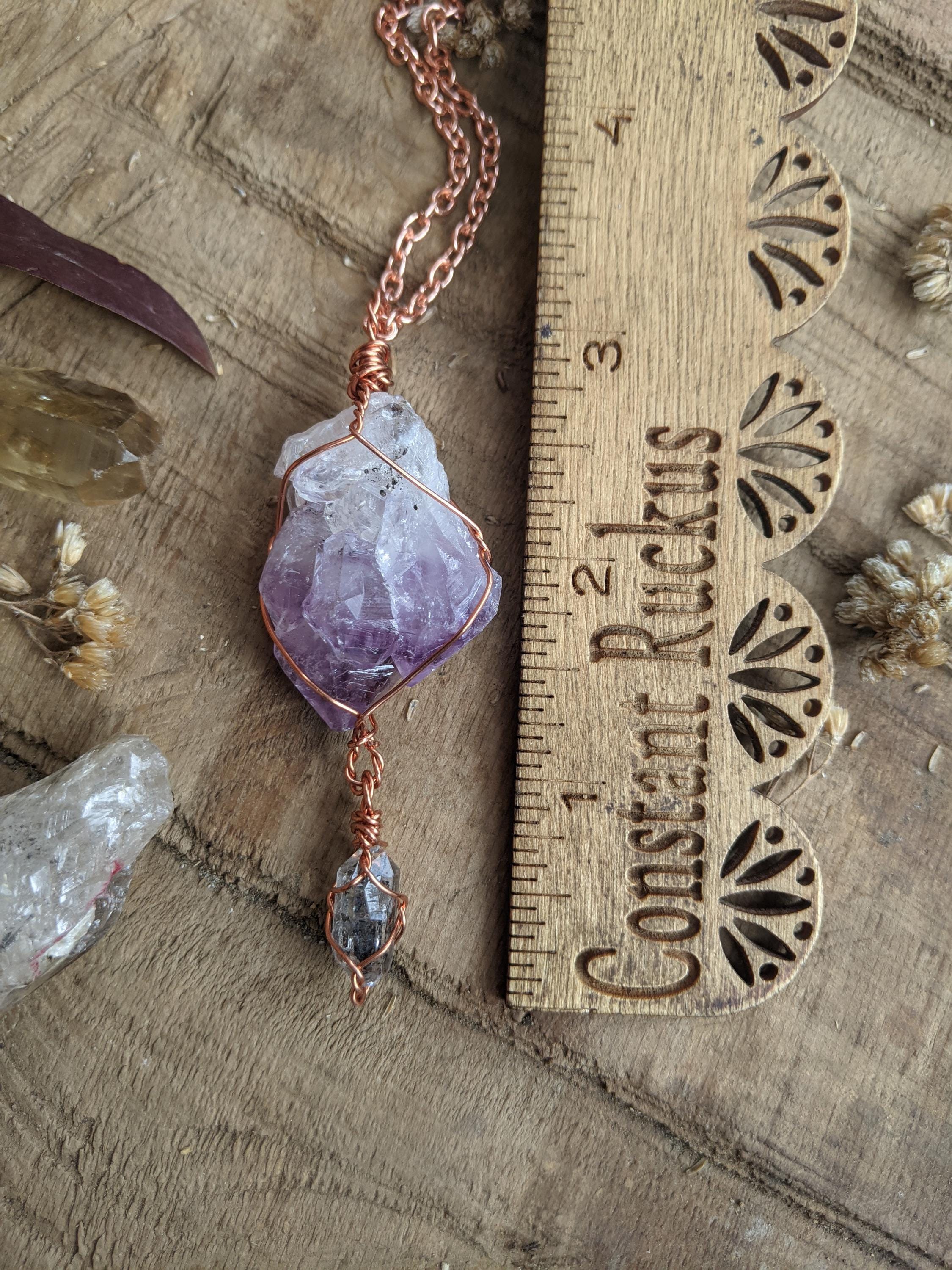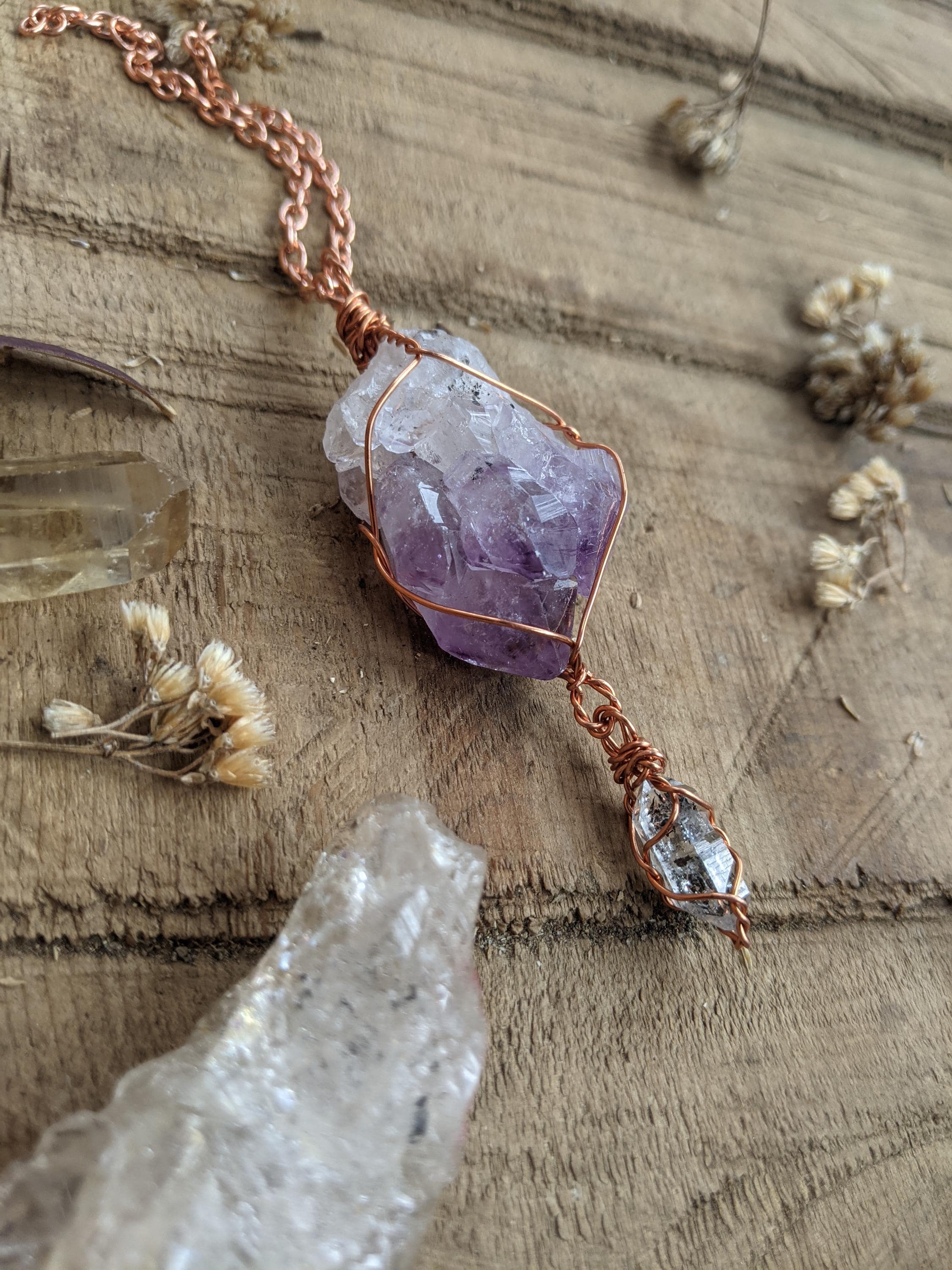 Large amethyst cluster and carbon herkimer diamond crystal pendant, amethyst pendant, amethyst necklace, herkimer pendant, herkimer necklace