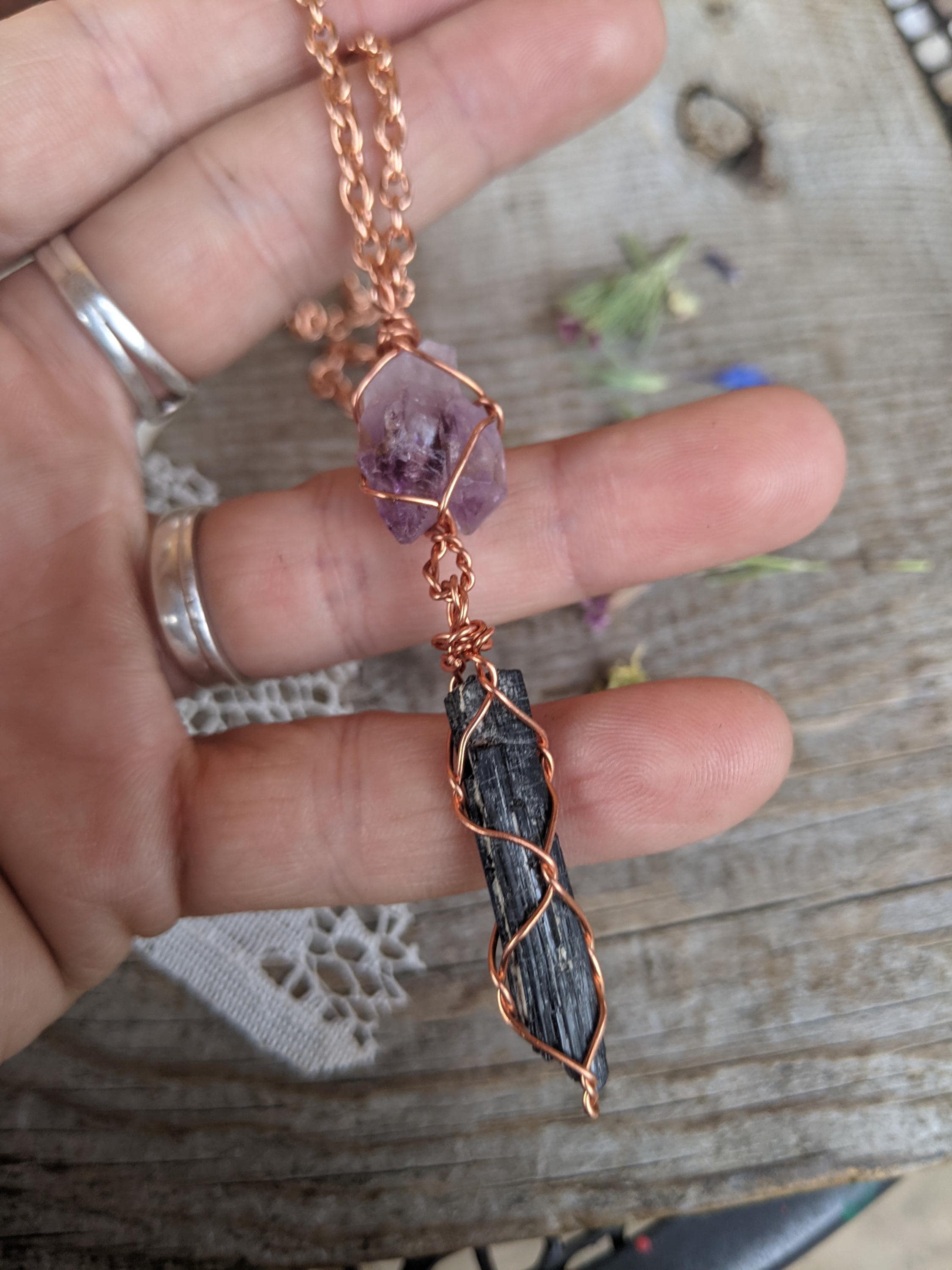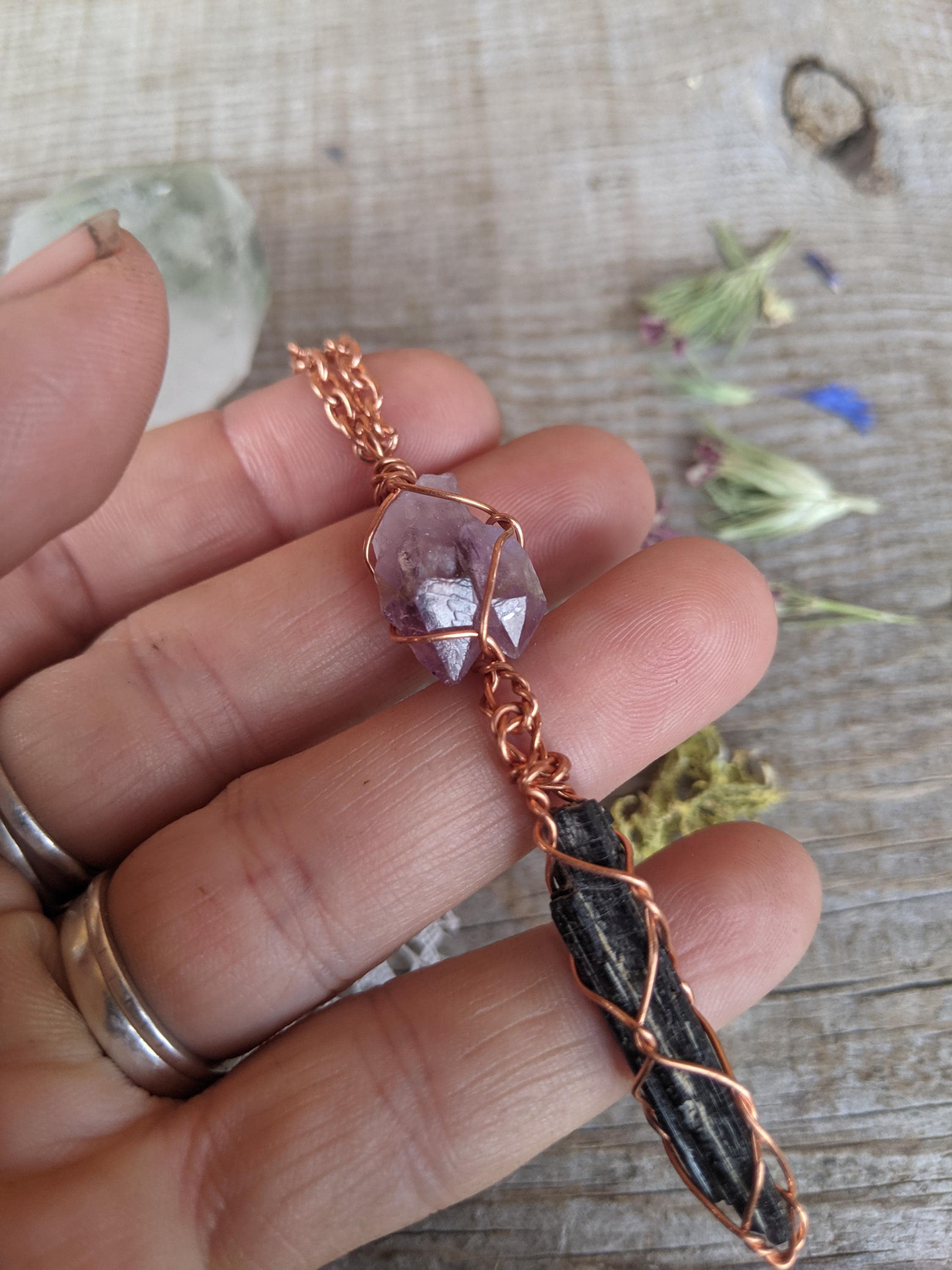 raw all natural twin amethyst crystal point with a raw, rough all natural black tourmaline crystal below it. obviously i love this combo!!!