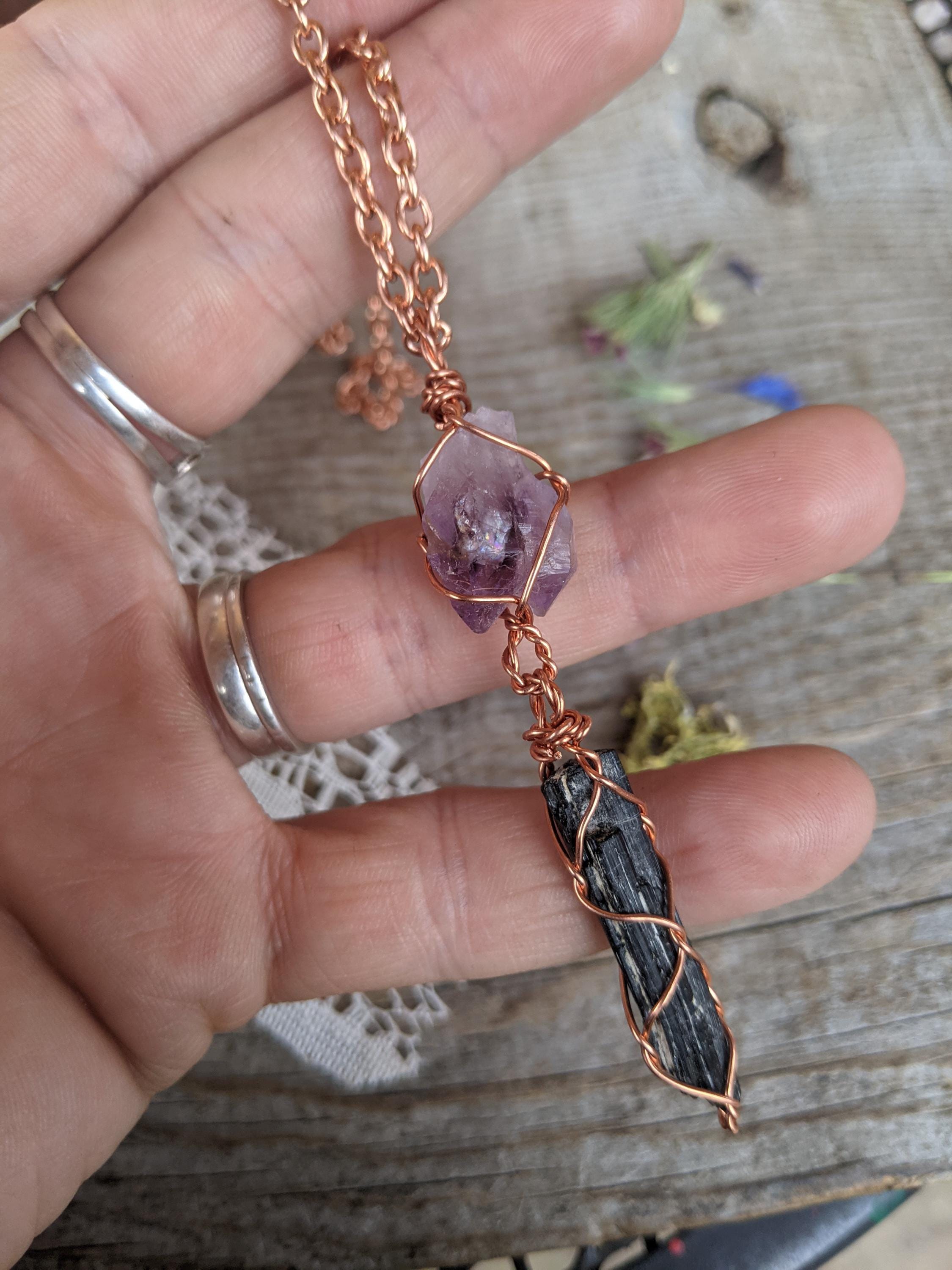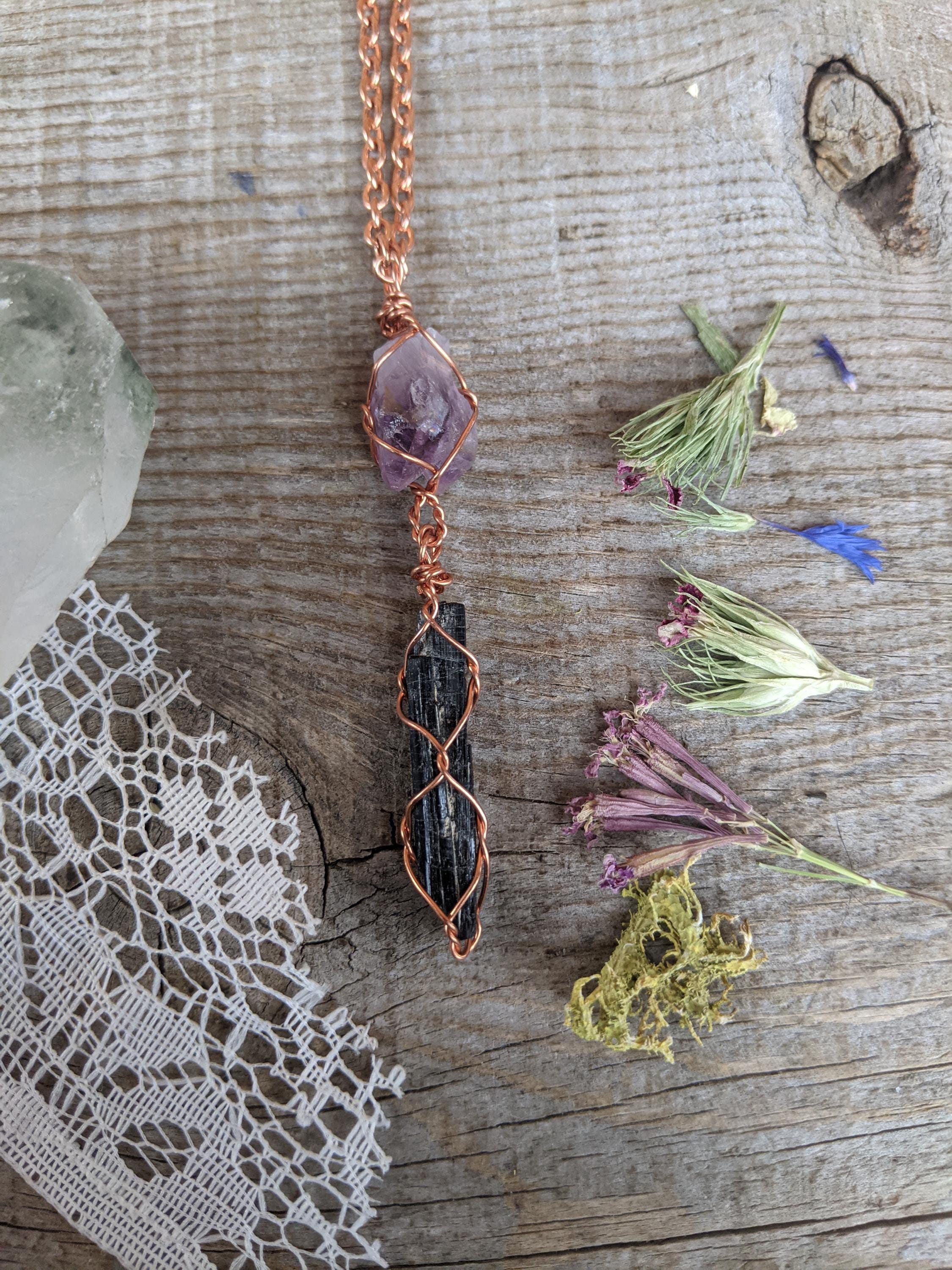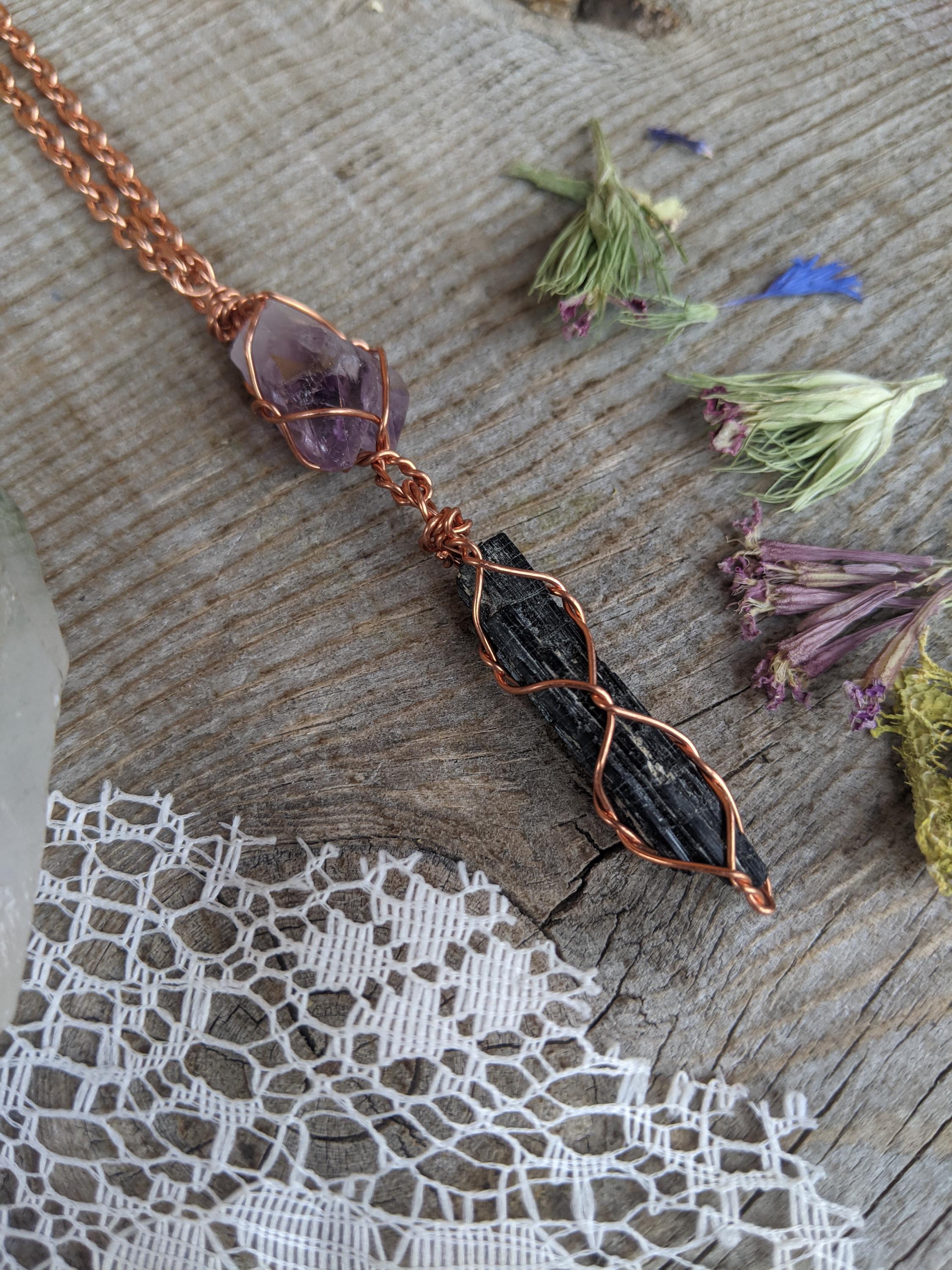 Amethyst twin cluster and black tourmaline crystal pendant, natural raw amethyst pendant, black tourmaline pendant, tourmaline necklace, raw