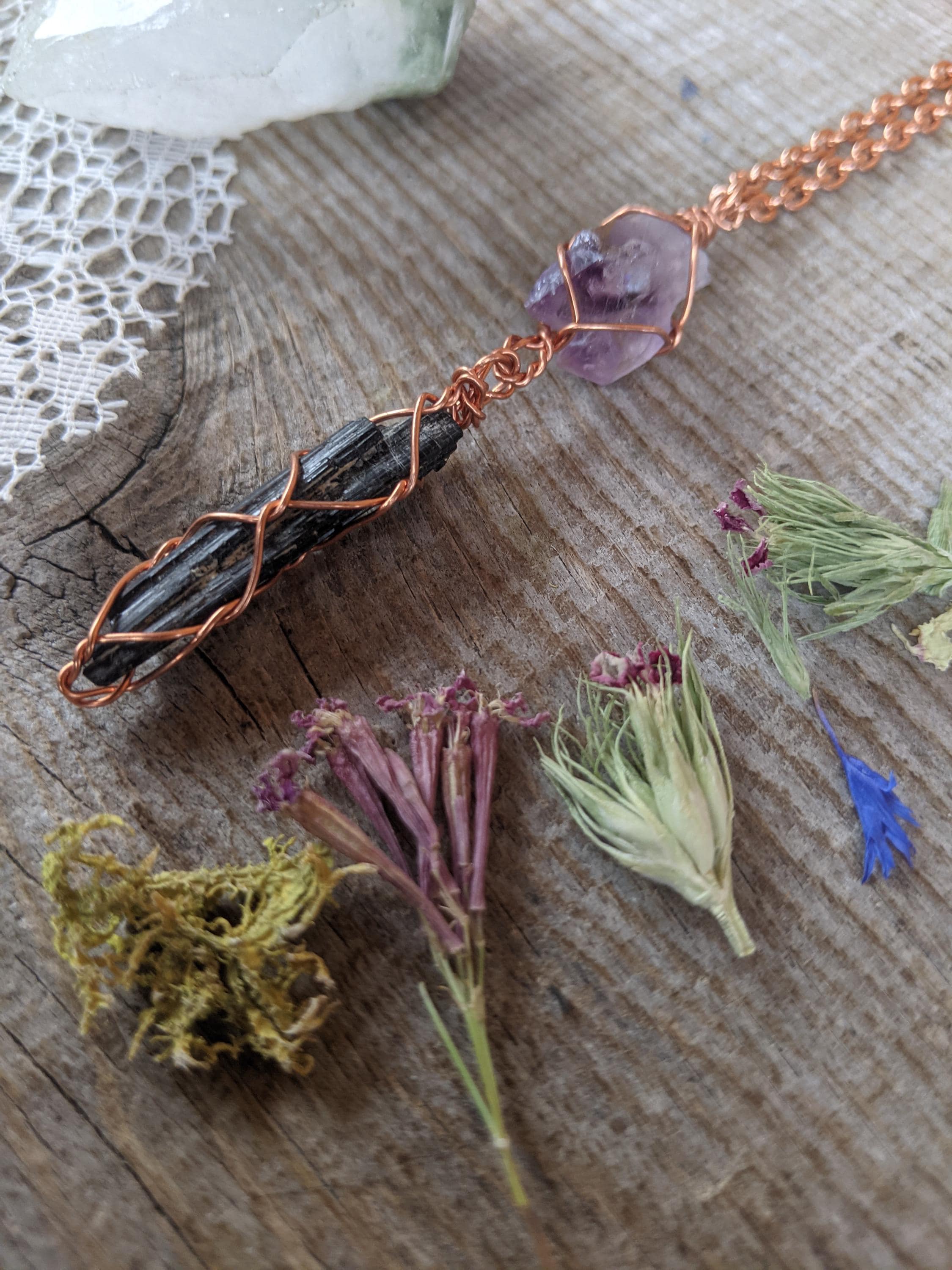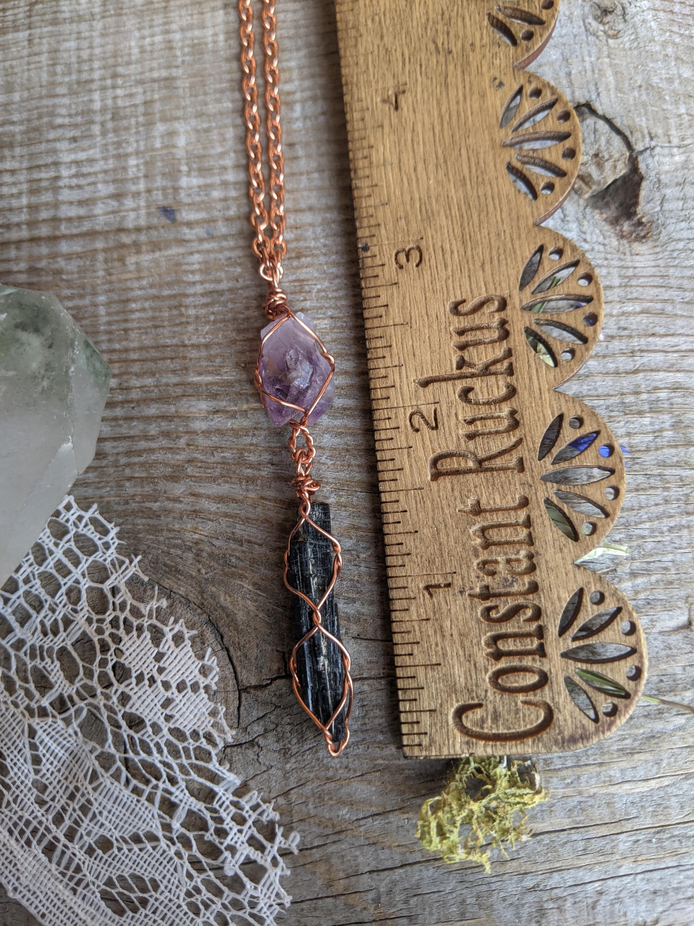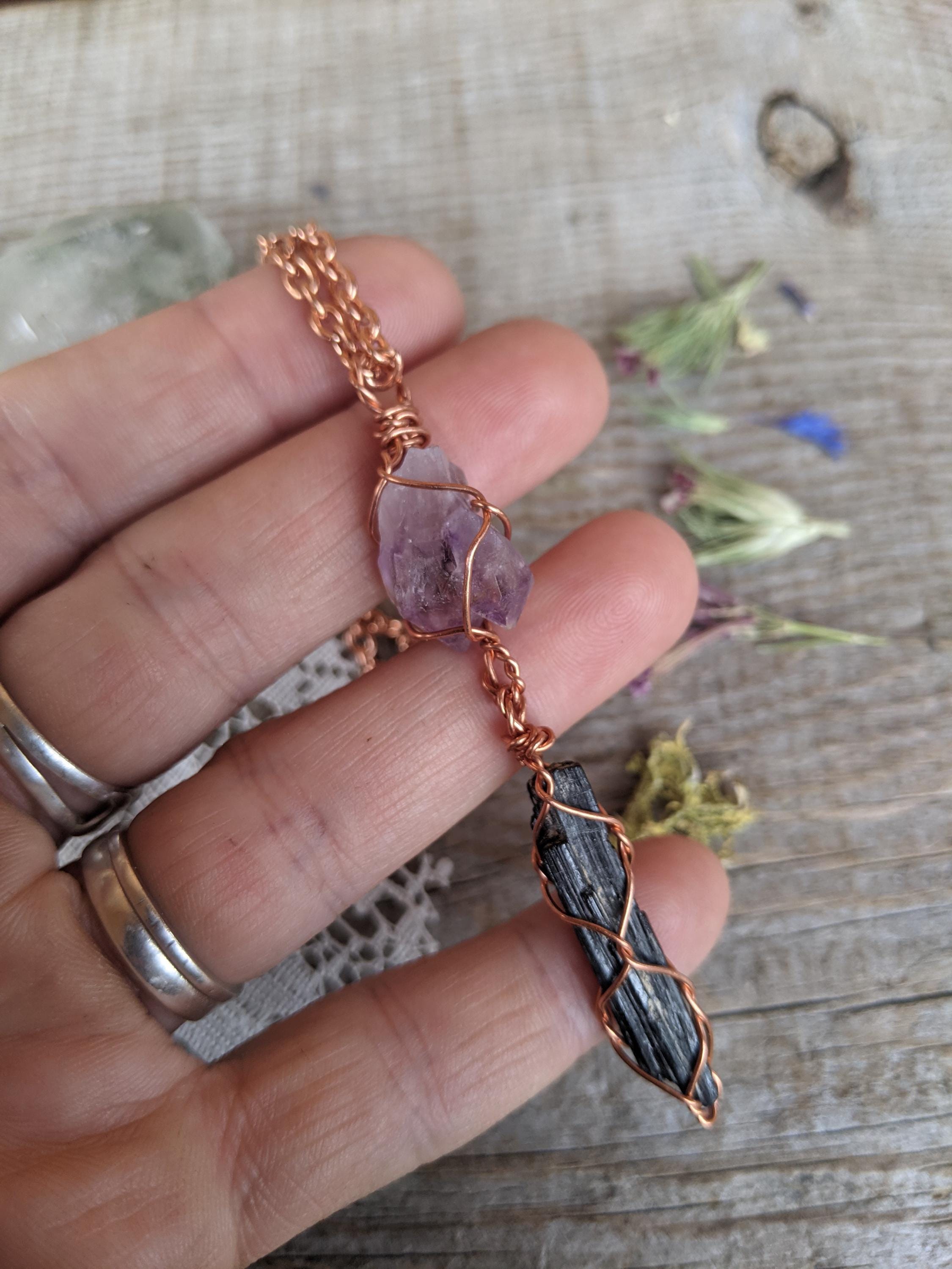 Amethyst twin cluster and black tourmaline crystal pendant, natural raw amethyst pendant, black tourmaline pendant, tourmaline necklace, raw