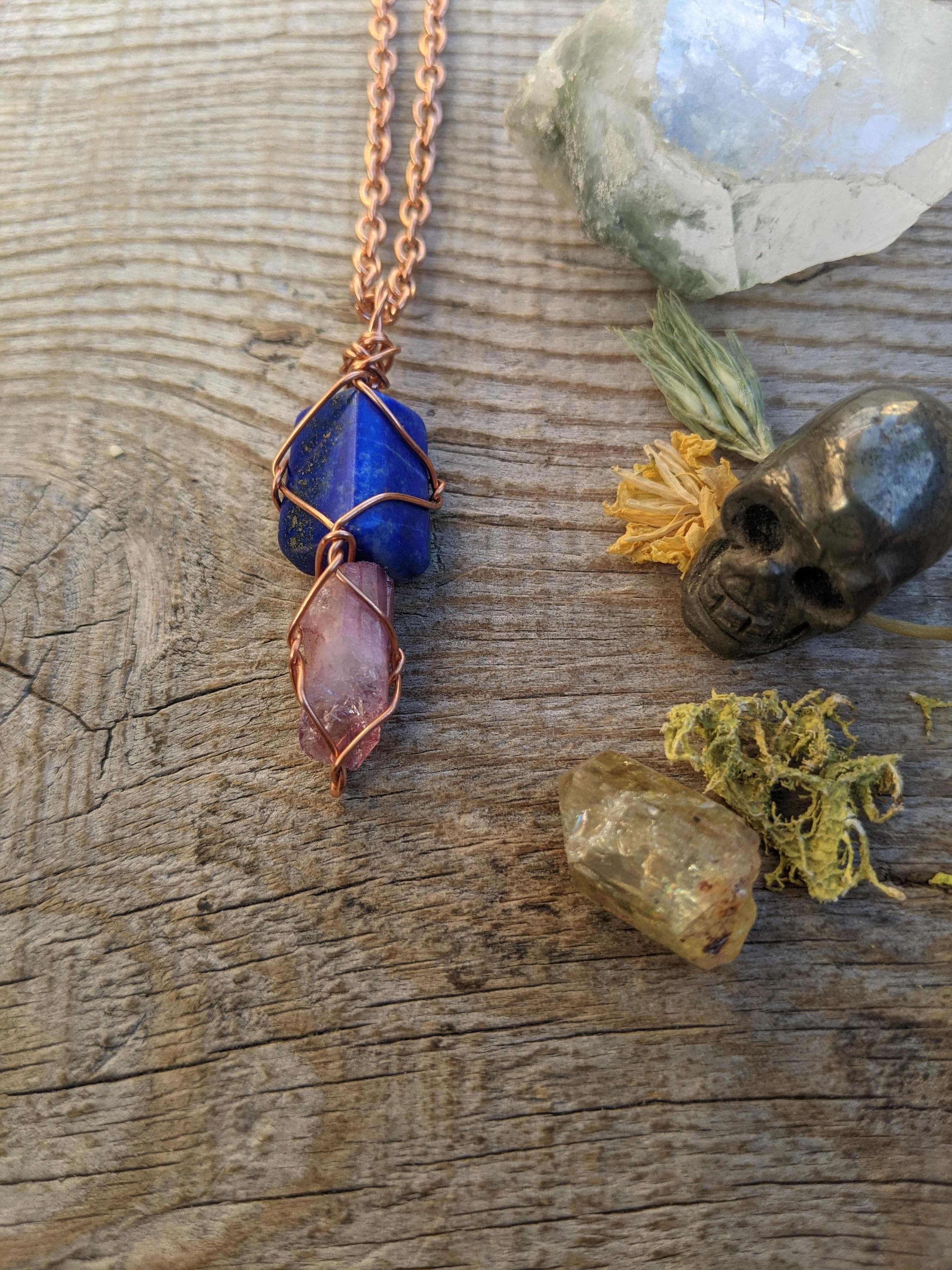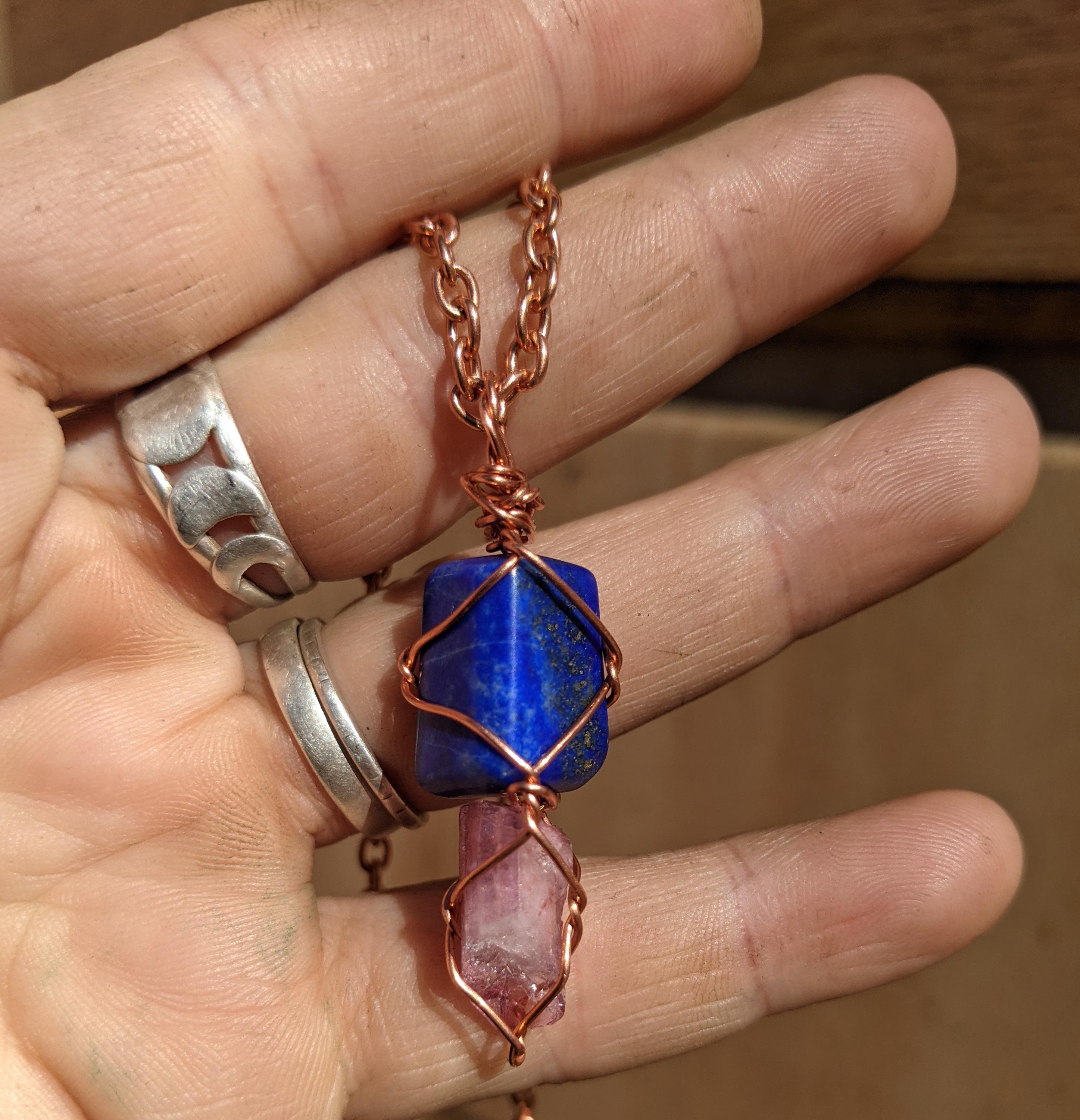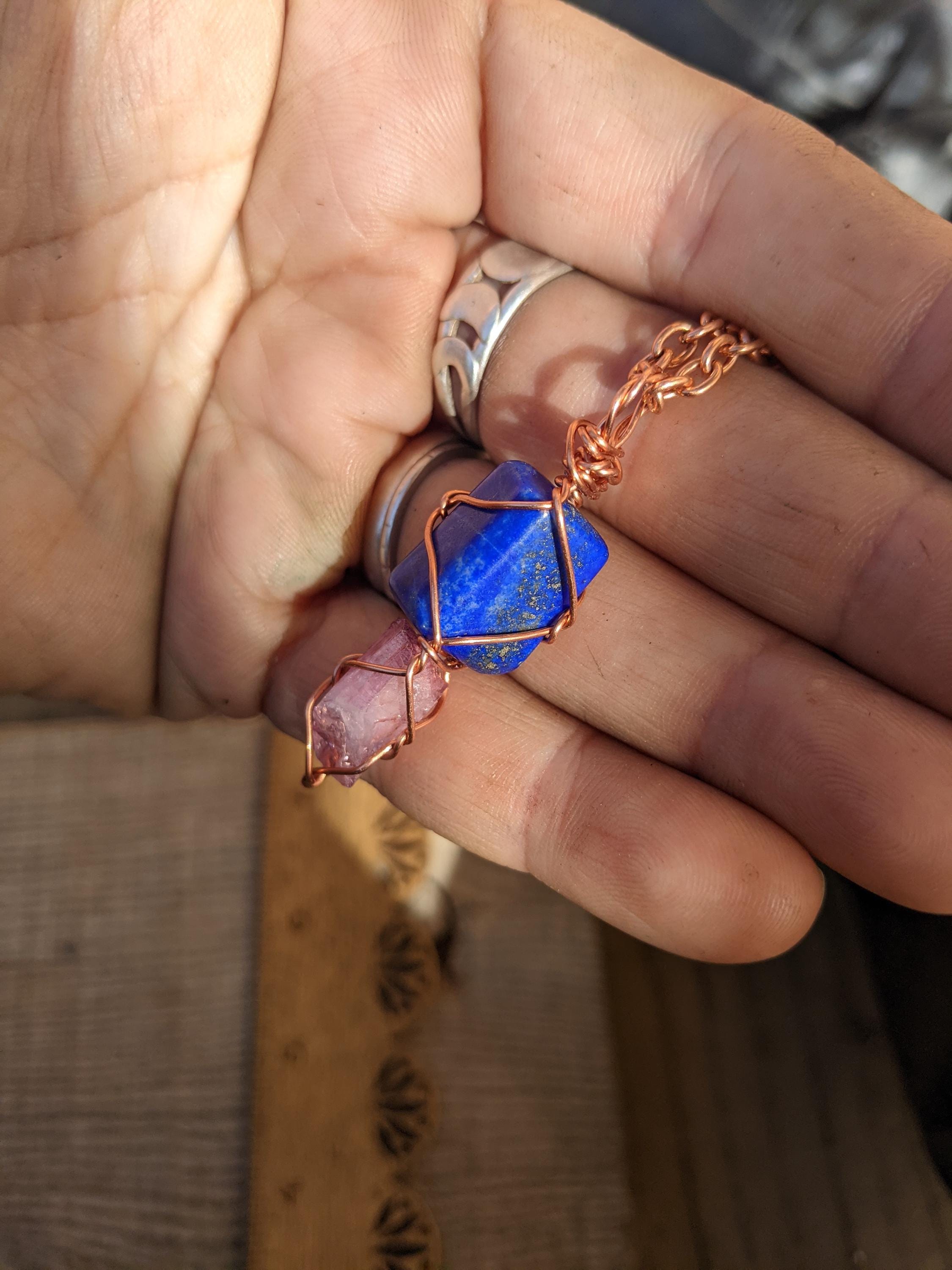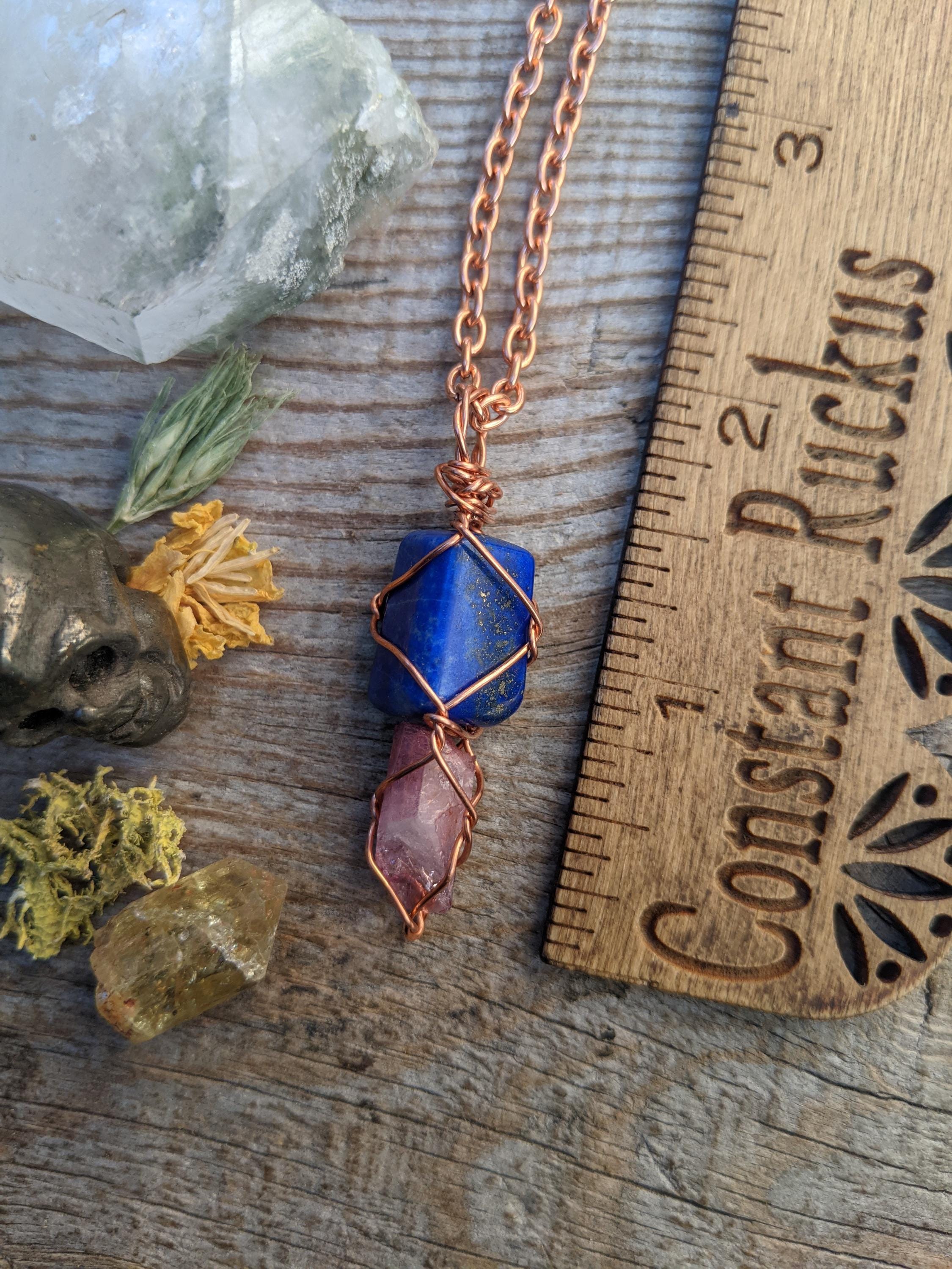 Beautiful dark blue lapis lazuli crystal paired with an adorable rose aura quartz crystal below it. the pink and blue are just darling together !