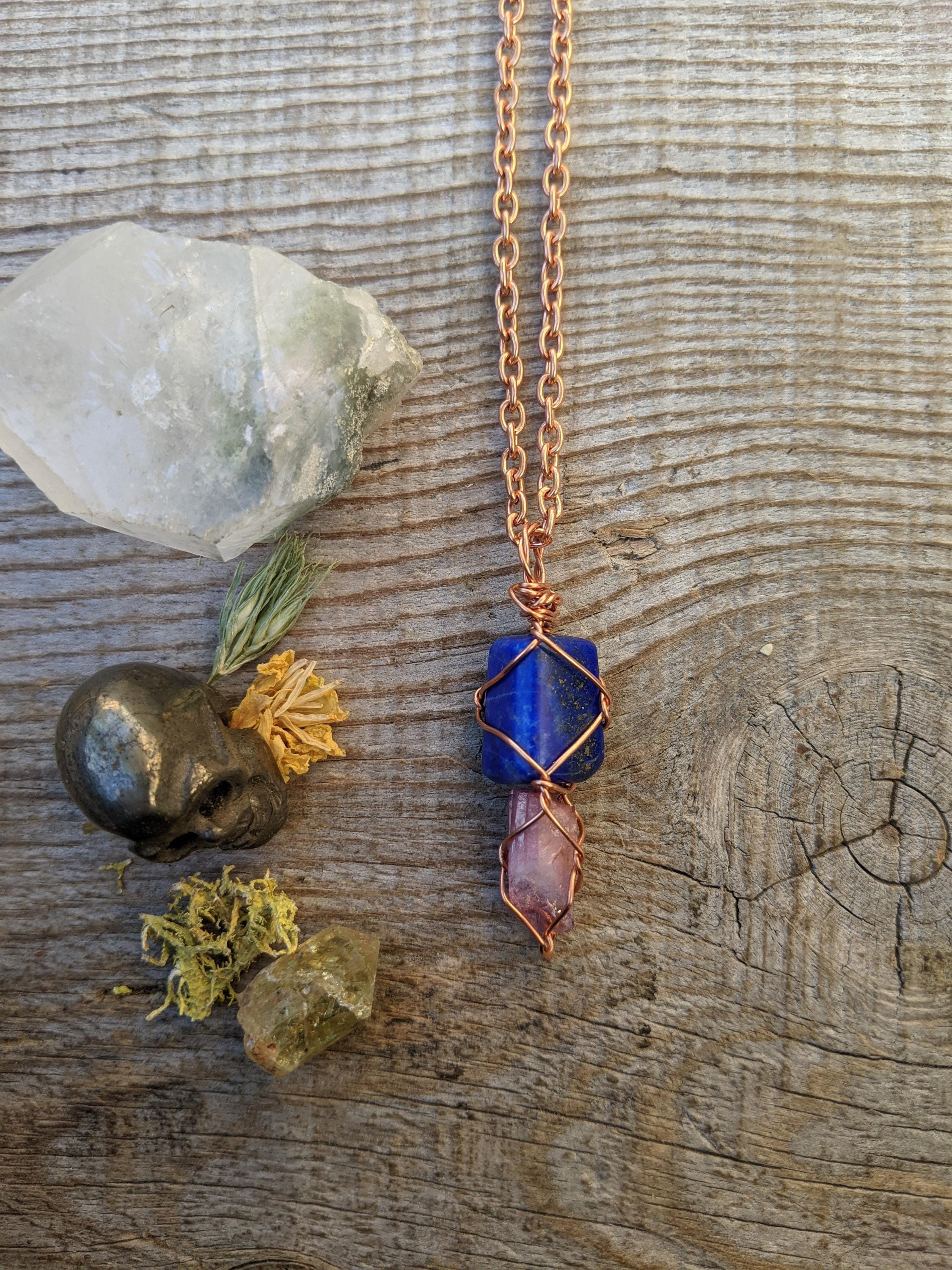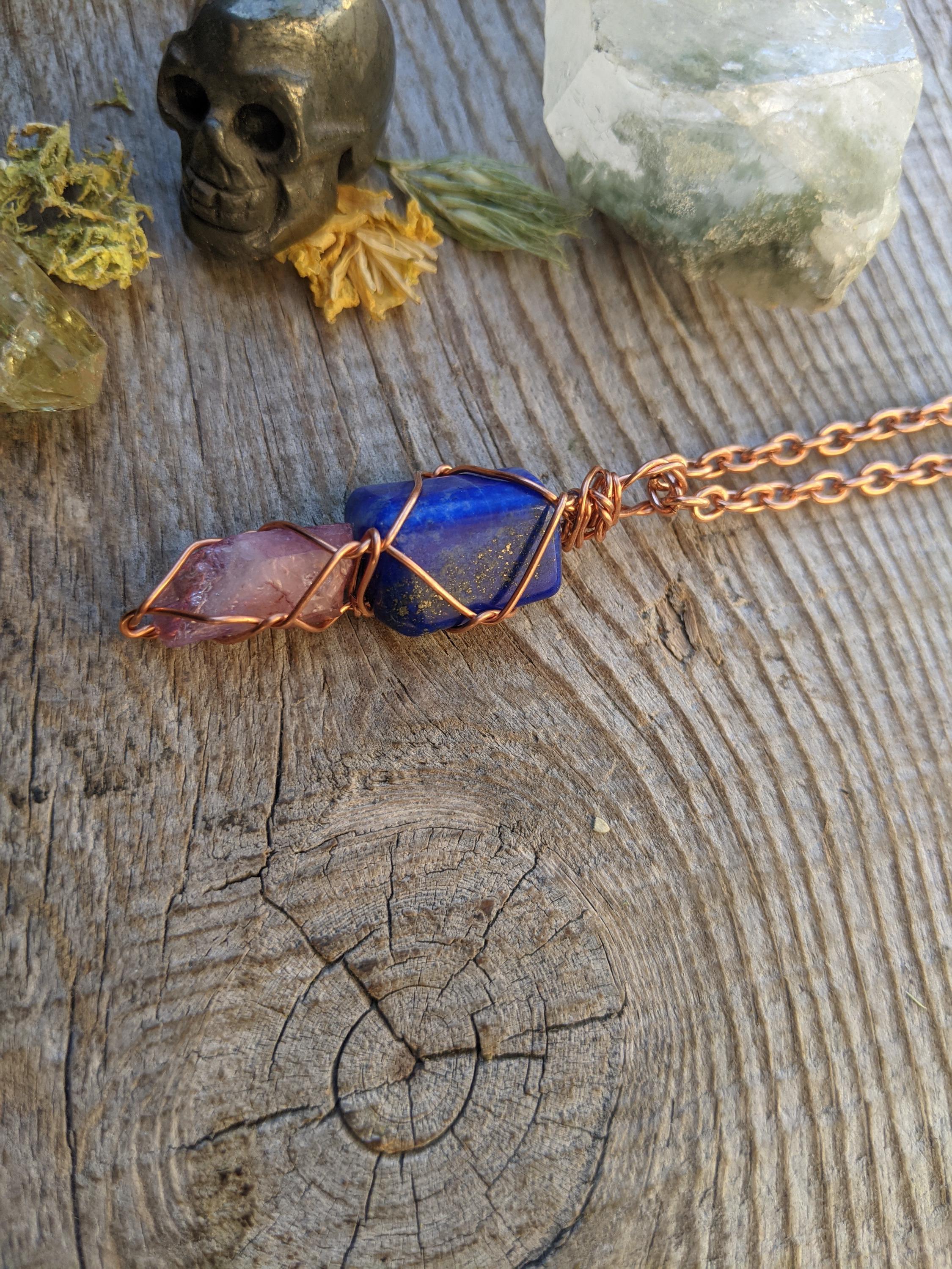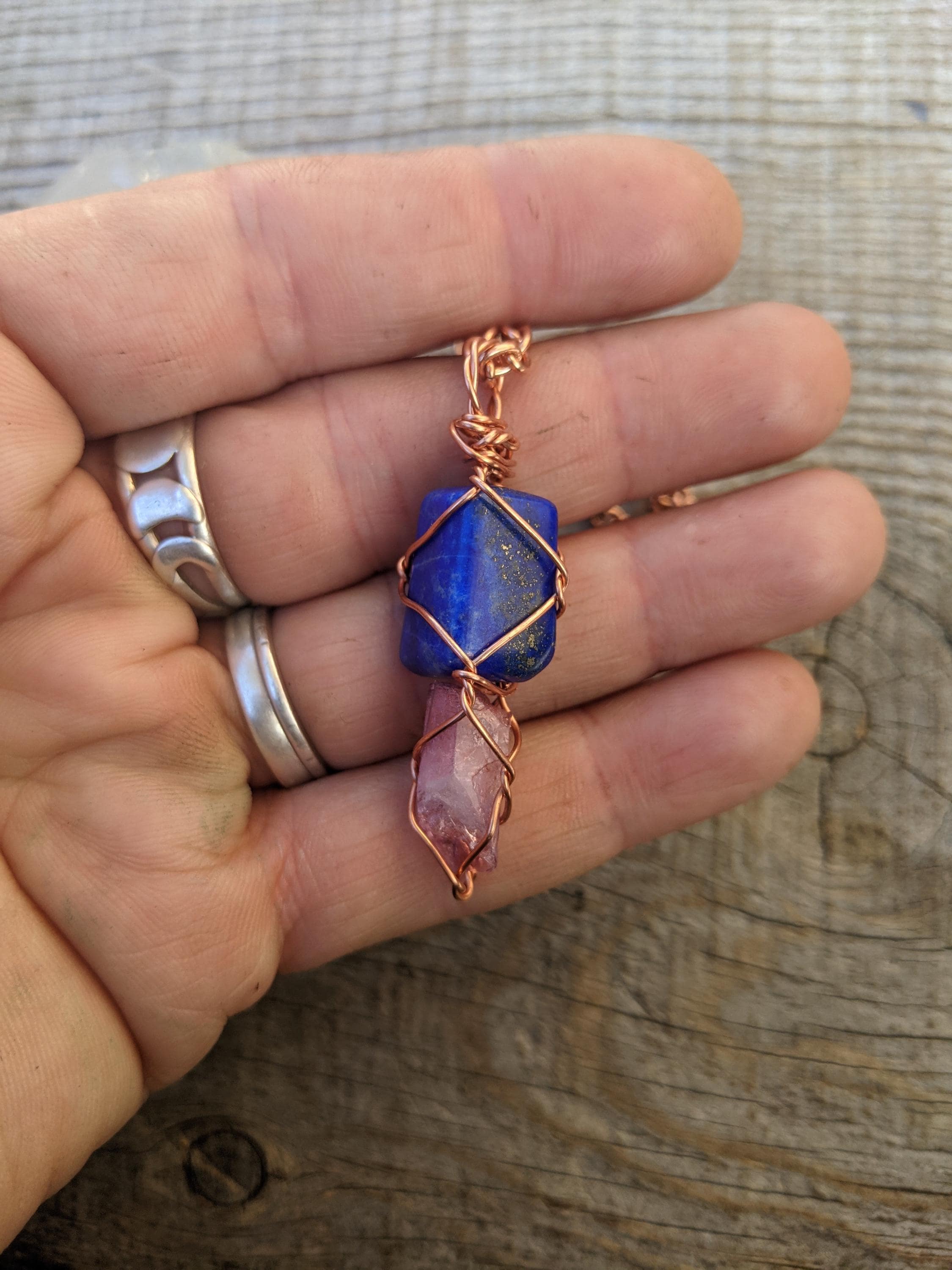 Lapis Lazuli and rose aura quartz crystal pendant, natural lapis lazuli pendant, rose aura rainbow quartz pendant, aura quartz necklace