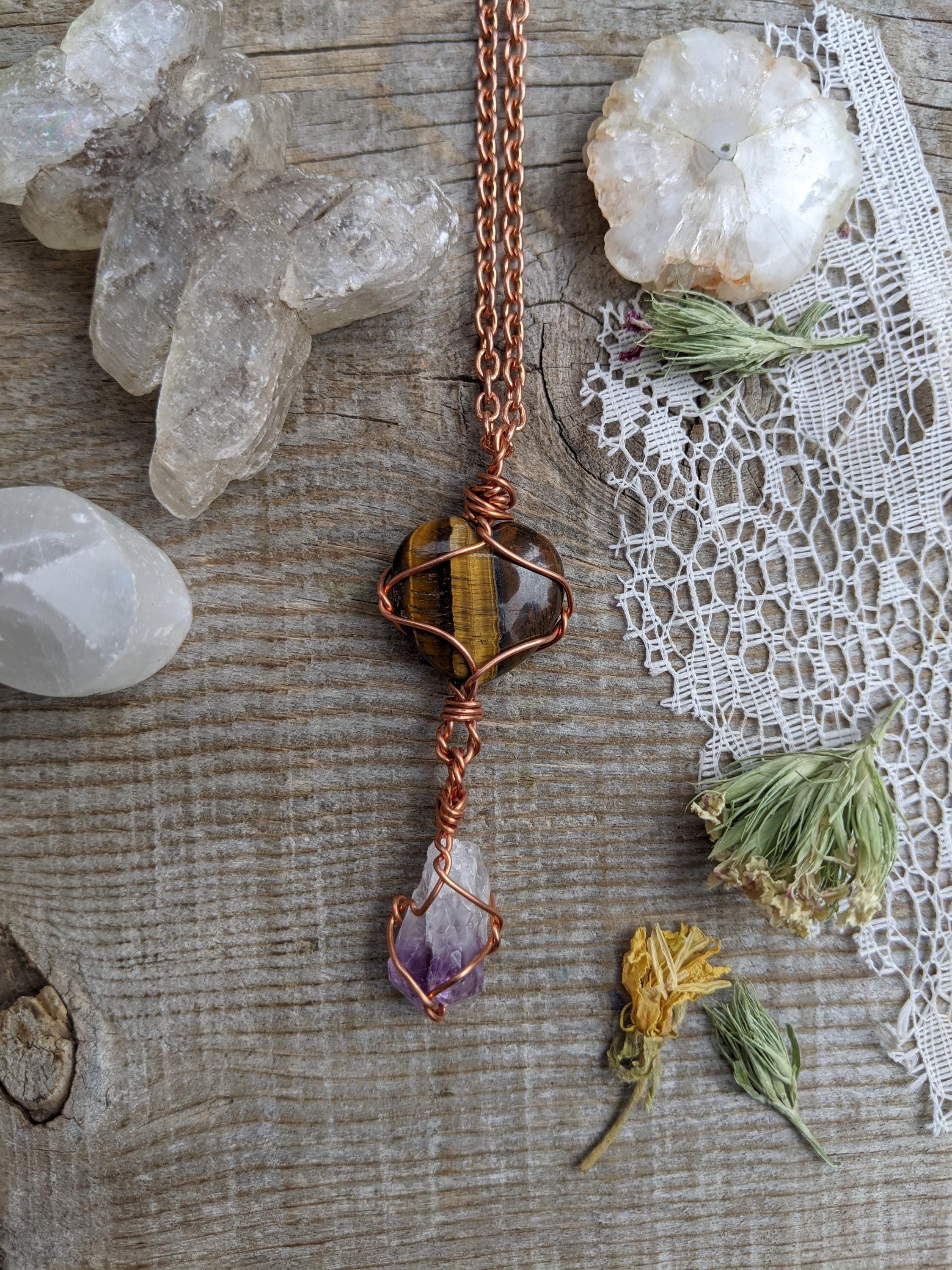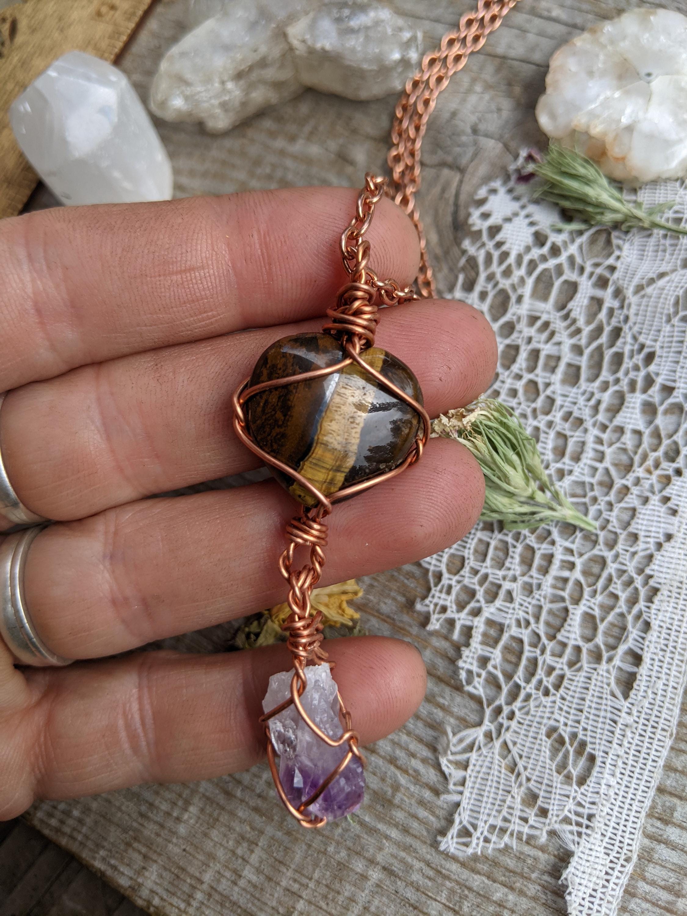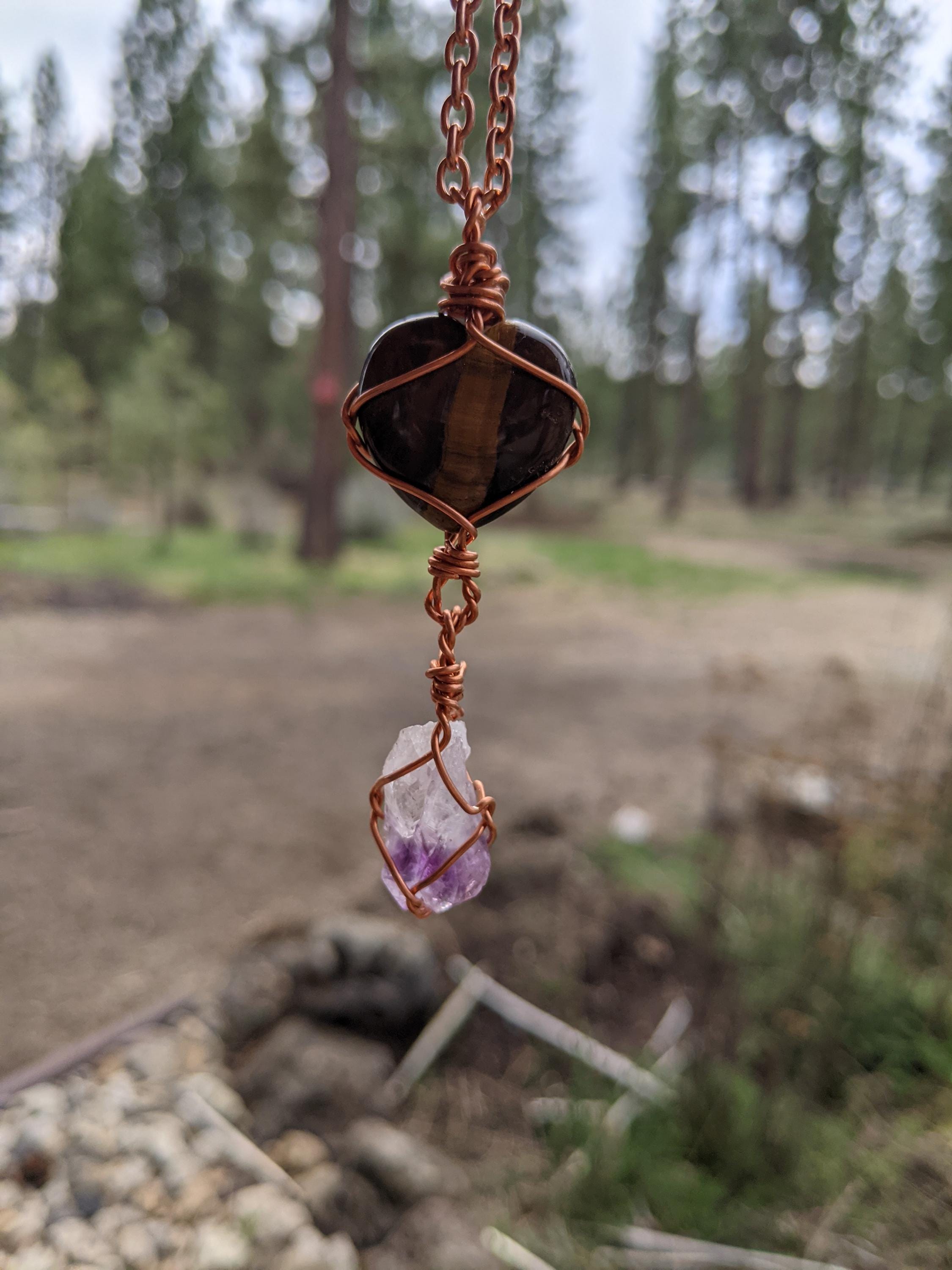 tigers eye heart and amethyst crystal pendant, tigerseye amethyst pendant, tiger eyes pendant, raw amethyst pendant, heart pendant, heart