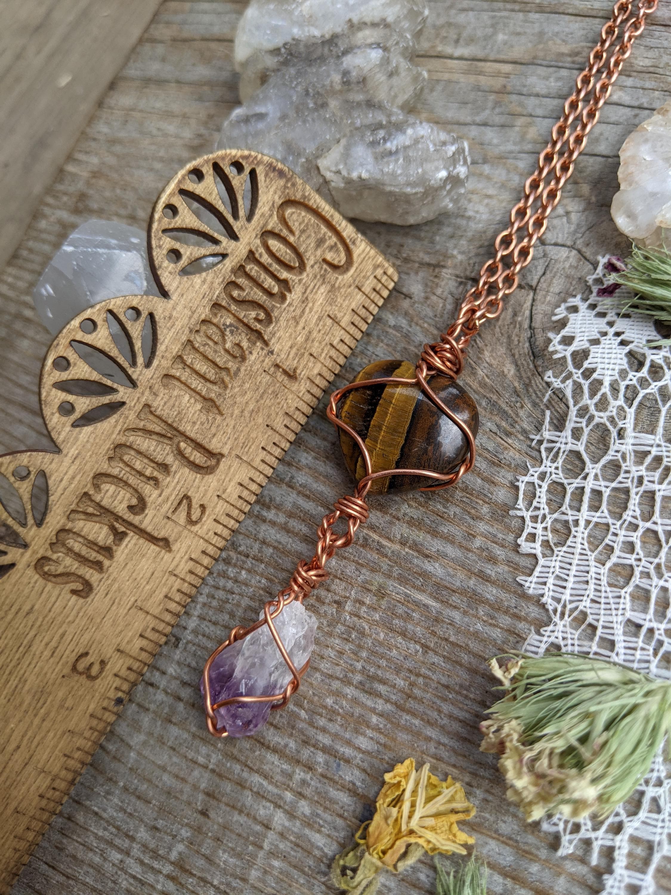 adorable little tigerseye heart and a completely raw, rough natural amethyst crystal below it with a gorgeous chevron!